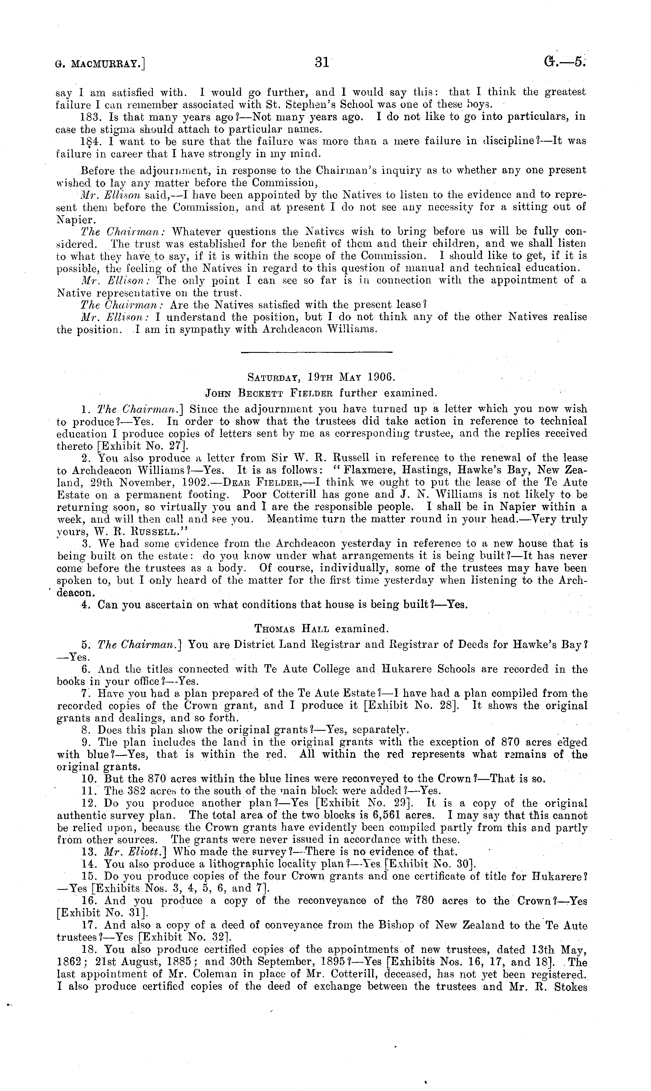 Saturday, 19th May 1906. John Beckett Fielder further examined. 1. The Chairman.] Since the adjournment you have turned up a letter which you now wish to produce?— Yes. In order to show that the trustees did take action in reference to technical education I produce copies of letters sent by me as corresponding trustee, and the replies received thereto [Exhibit No. 27]. 2. You also produce a letter from Sir W. R. Russell in reference to the renewal of the lease to Archdeacon Williams? —Yes. It is as follows: " Flaxmere, Hastings, Hawke's Bay, New Zealand, 29th November, 1902. —Dear Fielder, —I think we ought to put the lease of the Te Aute Estate on a permanent footing. Poor Cotterill has gone and J. N. Williams is not likely to be returning soon, so virtually you and I are the responsible people. I shall be in Napier within a week, and will then call and see you. Meantime turn the matter round in your head.—Very truly yours, W. R. Russell." 3. We had some evidence from the Archdeacon yesterday in reference to a new house that is being built on the estate: do you know under what arrangements it is being built?—lt has never come before the trustees as a body. Of course, individually, some of the trustees may have been spoken to, but I only heard of the matter for the first time yesterda}- when listening to the Archdeacon. 4. Can you ascertain on w-hat conditions that house is being built?— Yes. Thomas Hall examined. 5. The Chairman.] You are District Land Registrar and Registrar of Deeds for Hawke's Bay? —Yes. 6. And the titles connected with Te Aute College and Hukarere Schools are recorded in the books in your office?— Yes. 7. Have you had a plan prepared of the Te Aute Estate? —I have had a plan compiled from the recorded copies of the Crown grant, and I produce it [Exhibit No. 28], It shows the original grants and dealings, and so forth. 8. Does this plan show the original grants?— Yes, separately. 9. The plan includes the land in the original grants with the exception of 870 acres edged with blue?— Yes, that is within the red. All within the red represents what remains of the original grants. 10. But the 870 acres within the blue lines were reconveyed to the Crown?— That is so. 11. The 382 acres to the south of the main block were added? —Yes. 12. Do you produce another plan?— Yes [Exhibit No. 29]. It is a copy of the original authentic survey plan. The total area of the two blocks is 6,561 acres. I may say that this cannot be relied upon, because the Crown grants have evidently been compiled partly from this and partly from other sources. The grants were never issued in accordance with these. 13. Mr. Eliott.] Who made the survey?— There is no evidence of that. 14. You also produce a lithographic locality plan?— Yes [Exhibit No. 30]. 15. Do you produce copies of the four Crown grants and one certificate of title for Hukarere? —Yes [Exhibits Nos. 3, 4, 5, 6, and 7]. 16. And you produce a copy of the reconveyance of the 780 acres to the Crown?— Yes [Exhibit No. 31]. 17. And also a copy of a deed of conveyance from the Bishop of New Zealand to the Te Aute trustees ?—Yes [Exhibit No. 32]. 18. You also produce certified copies of the appointments of new trustees, dated 13th May, 1862; 21st August, 1885; and 30th September, 1895?—Y'es [Exhibits Nos. 16, 17, and 18]. The last appointment of Mr. Coleman in place of Mr. Cotterill, deceased, has not yet been registered. I also produce certified copies of the deed of exchange between the trustees and Mr. R. Stokes