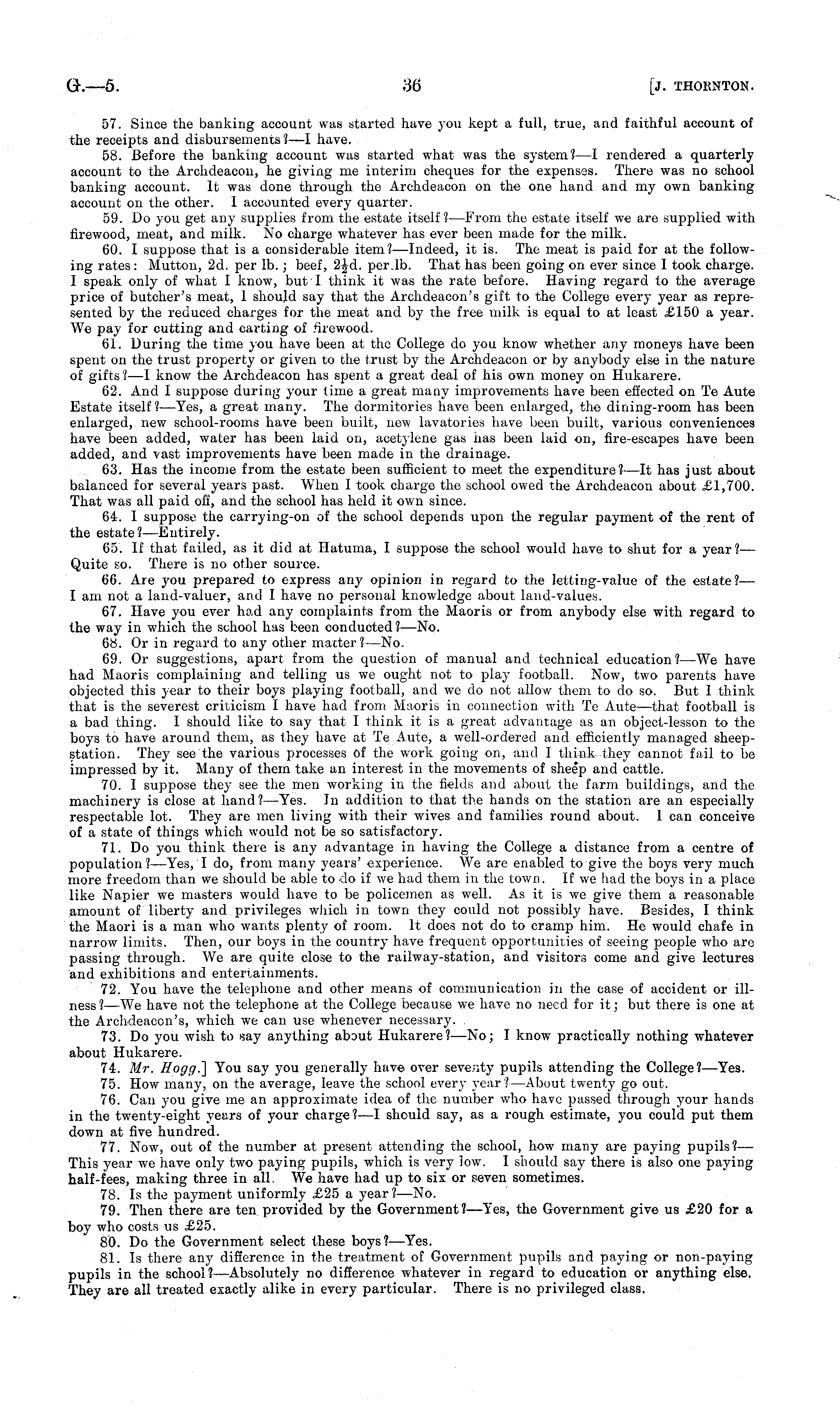 57. Since the banking account was started have you kept a full, true, and faithful account of the receipts and disbursements? —I have. 58. Before the banking account was started what was the system?—l rendered a quarterly account to the Archdeacon, he giving me interim cheques for the expenses. There was no school banking account. It was done through the Archdeacon on the one hand and my own banking account on the other. I accounted every quarter. 59. Do you get any supplies from the estate itself?— From the estate itself we are supplied with firewood, meat, and milk. No charge whatever has ever been made for the milk. 60. I suppose that is a considerable item? —Indeed, it is. The meat is paid for at the following rates : Mutton, 2d. per lb.; beef, 2Jd. per.lb. That has been going on ever since I took charge. I speak only of what I know, but I think it was the rate before. Having regard to the average price of butcher's meat, 1 should say that the Archdeacon's gift to the College every year as represented by the reduced charges for the meat and by the free milk is equal to at least £150 a year. We pay for cutting and carting of firewood. 61. During the time you have been at the College do you know whether any moneys have been spent on the trust property or given to the trust by the Archdeacon or by anybody else in the nature of gifts ?—I know the Archdeacon has spent a great deal of his own money on Hukarere. 62. And I suppose during your time a great many improvements have been effected on Te Aute Estate itself? —Yes, a great many. The dormitories have been enlarged, the dining-room has been enlarged, new school-rooms have been built, new lavatories have been built, various conveniences have been added, water has been laid on, acetylene gas has been laid on, fire-escapes have been added, and vast improvements have been made in the drainage. 63. Has the income from the estate been sufficient to meet the expenditure?—lt has just about balanced for several years past. When I took charge the school owed the Archdeacon about £1,700. That was all paid off, and the school has held it own since. 64. I suppose the carrying-on of the school depends upon the regular payment of the rent of the estate? —Entirely. 65. If that failed, as it did at Hatuma, I suppose the school would have to shut for a year?— Quite so. There is no other source. 66. Are you prepared to express any opinion in regard to the letting-value of the estate? — I am not a land-valuer, and I have no personal knowledge about land-values. 67. Have you ever had any complaints from the Maoris or from anybody else with regard to the way in which the school has been conducted ? —No. 68. Or in regard to any other matter?— No. 69. Or suggestions, apart from the question of manual and technical education?—We have had Maoris complaining and telling us we ought not to play football. Now, two parents have objected this year to their boys playing football, and we do not allow them to do so. But 1 think that is the severest criticism I have had from Maoris in connection with Te Aute —that football is a bad thing. I should like to say that I think it is a great advantage as an object-lesson to the boys to have around them, as they have at Te Aute, a well-ordered and efficiently managed sheepstation. They see the various processes of the work going on, and I think they cannot fail to be impressed by it. Many of them take an interest in the movements of sheep and cattle. 70. I suppose they see the men working in the fields and about the farm buildings, and the machinery is close at hand? —Yes. In addition to that the hands on the station are an especially respectable lot. They are men living with their wives and families round about. 1 can conceive of a state of things which would not be so satisfactory. 71. Do you think there is any advantage in having the College a distance from a centre of population?— Yes, I do, from many years' experience. We are enabled to give the boys very much more freedom than we should be able to do if we had them in the town. If we had the boys in a place like Napier we masters would have to be policemen as well. As it is we give them a reasonable amount of liberty and privileges which in town they could not possibly have. Besides, I think the Maori is a man who wants plenty of room. It does not do to cramp him. He would chafe in narrow limits. Then, our boys in the country have frequent opportunities of seeing people who are passing through. We are quite close to the railway-station, and visitors come and give lectures and exhibitions and entertainments. 72. You have the telephone and other means of communication in the case of accident or illness ?—We have not the telephone at the College because we have no need for it; but there is one at the Archdeacon's, which we can use whenever necessary. . 73. Do you wish to say anything about Hukarere? —No; I know practically nothing whatever about Hukarere. 74. Mr. Hogg.] You say you generally have over seventy pupils attending the College?— Yes. 75. How many, on the average, leave the school every year?— About twenty go out. 76. Can you give me an approximate idea of the number who have passed through your hands in the twenty-eight years of your charge?—l should say, as a rough estimate, you could put them down at five hundred. 77. Now, out of the number at present attending the school, how many are paying pupils?— This year we have only two paying pupils, which is very low. I should say there is also one paying half-fees, making three in all. We have had up to six or seven sometimes. 78. Is the payment uniformly £25 a year?— No. 79. Then there are ten provided by the Government?— Yes, the Government give us £20 for a boy who costs us £25. 80. Do the Government select these boys?— Yes. 81. Is there any difference in the treatment of Government pupils and paying or non-paying pupils in the school? —Absolutely no differe