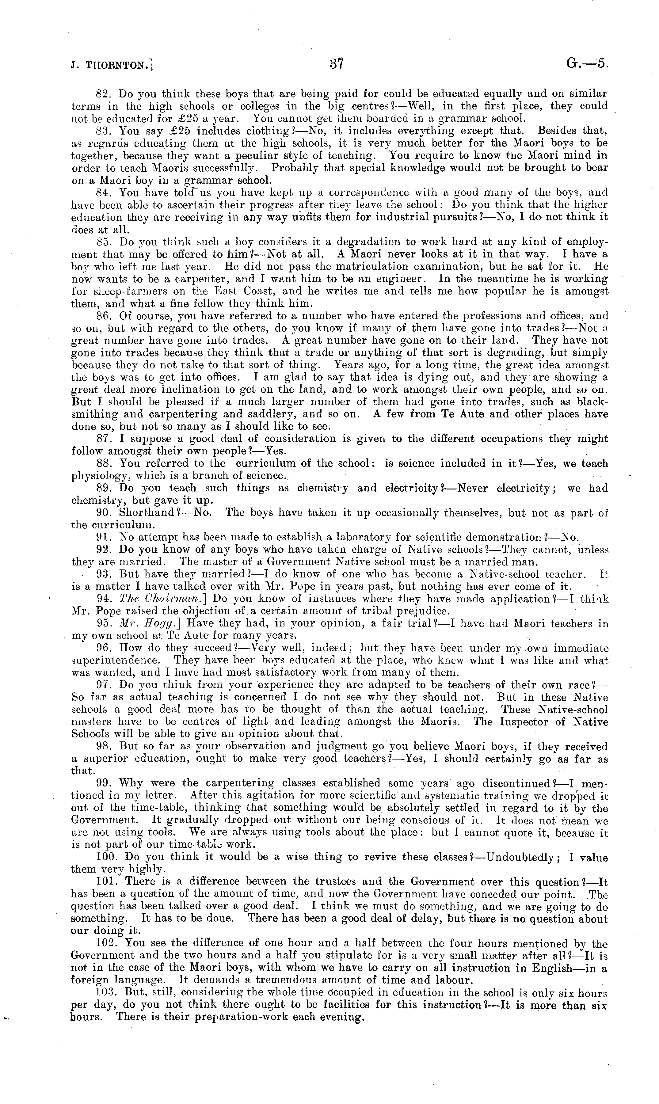 82. Do you think these boys that are being paid for could be educated equally and on similar terms in the high schools or colleges in the big centres?— Well, in the first place, they could not be educated for £25 a year. You cannot get them boarded in a grammar school. 83. You say £25 includes clothing?—No, it includes everything except that. Besides that, as regards educating them at the high schools, it is very much better for the Maori boys to be together, because they want a peculiar style of teaching. You require to know the Maori mind in order to teach Maoris successfully. Probably that special knowledge would not be brought to bear on a Maori boy in a grammar school. 84. You have tolcTus you have kept up a correspondence with a good many of the boys, and have been able to ascertain their progress after they leave the school: Do you think that the higher education they are receiving in any way unfits them for industrial pursuits?—No, I do not think it does at all. 85. Do you think such a boy considers it a degradation to work hard at any kind of employment that may be offered to him?— Not at all. A Maori never looks at it in that way. I have a boy who left me last year. He did not pass the matriculation examination, but he sat for it. He now wants to be a carpenter, and I want him to be an engineer. In the meantime he is working for sheep-farmers on the East Coast, and he writes me and tells me how popular he is amongst them, and what a fine fellow they think him. 86. Of course, you have referred to a number who have entered the professions and offices, and so on, but with regard to the others, do you know if many of them have gone into trades? —Not a great number have gone into trades. A great number have gone on to their land. They have not gone into trades because they think that a trade or anything of that sort is degrading, but simply because they do not take to that sort of thing. Years ago, for a long time, the great idea amongst the boys was to get into offices. lam glad to say that idea is dying out, and they are showing a great deal more inclination to get on the land, and to work amongst their own people, and so on. But I should be pleased if a much larger number of them had gone into trades, such as blacksmithing and carpentering and saddlery, and so on. A few from Te Aute and other places have done so, but not so many as I should like to see. 87. I suppose a good deal of consideration is given to the different occupations they might follow amongst their own people?— Yes. 88. You referred to the curriculum of the school: is science included in it? —Yes, we teach physiology, which is a branch of science. 89. Do you teach such things as chemistry and electricity?— Never electricity; we had chemistry, but gave it up. 90. Shorthand? —No. The boys have taken it up occasionally themselves, but not as part of the curriculum. 91. No attempt has been made to establish a laboratory for scientific demonstration?— No. 92. Do you know of any boys who have taken charge of Native schools?— They cannot, unless they are married. The master of a Government Native school must be a married man. 93. But have they married? —I do know of one who has become a Native-school teacher. It is a matter I have talked over with Mr. Pope in years past, but nothing has ever come of it, 94. The Chairman.] Do you know of instances where they have made application?—l think Mr. Pope raised the objection of a certain amount of tribal prejudice. 95. Mr. Hogg.] Have they had, in your opinion, a fair trial?—l have had Maori teachers in my own school at Te Aute for many years. 96. How do they succeed? —Very well, indeed; but they have been under my own immediate superintendence. They have been boys educated at the place, who knew what I was like and what was wanted, and I have had most satisfactory work from many of them. 97. Do you think from your experience they are adapted to be teachers of their own race?— So far as actual teaching is concerned I do not see why they should not. But in these Native schools a good deal more has to be thought of than the actual teaching. These Native-school masters have to be centres of light and leading amongst the Maoris. The Inspector of Native Schools will be able to give an opinion about that. 98. But so far as your observation and judgment go you believe Maori boys, if they received a superior education, ought to make very good teachers?— Yes, I should certainly go as far as that. 99. Why were the carpentering classes established some years ago discontinued?—l mentioned in my letter. After this agitation for more scientific and systematic training we dropped it out of the time-table, thinking that something would be absolutely settled in regard to it by the Government. It gradually dropped out without our being conscious of it. It does not mean we are not using tools. We are always using tools about the place: but I cannot quote it, because it is not part of our time-tabid work, 100. Do you think it would be a wise thing to revive these classes?— Undoubtedly; I value them very highly. 101. There is a difference between the trustees and the Government over this question?—lt has been a question of the amount of time, and now the Government have conceded our point. The question has been talked over a good deal. I think we must do something, and we are going to do something. It has to be done. There has been a good deal of delay, but there is no question about our doing it. 102. You see the difference of one hour and a half between the four hours mentioned by the Government and the two hours and a half you stipulate for is a very small matter after all ?—lt is not in the case of the Maori boys, with whom we have to carry on all instruction in English-—in a foreign language. It demands a tremendous amount of time and labour. 103. But, still, considering the whole time Occupied in education in the school is only six hours per day, d