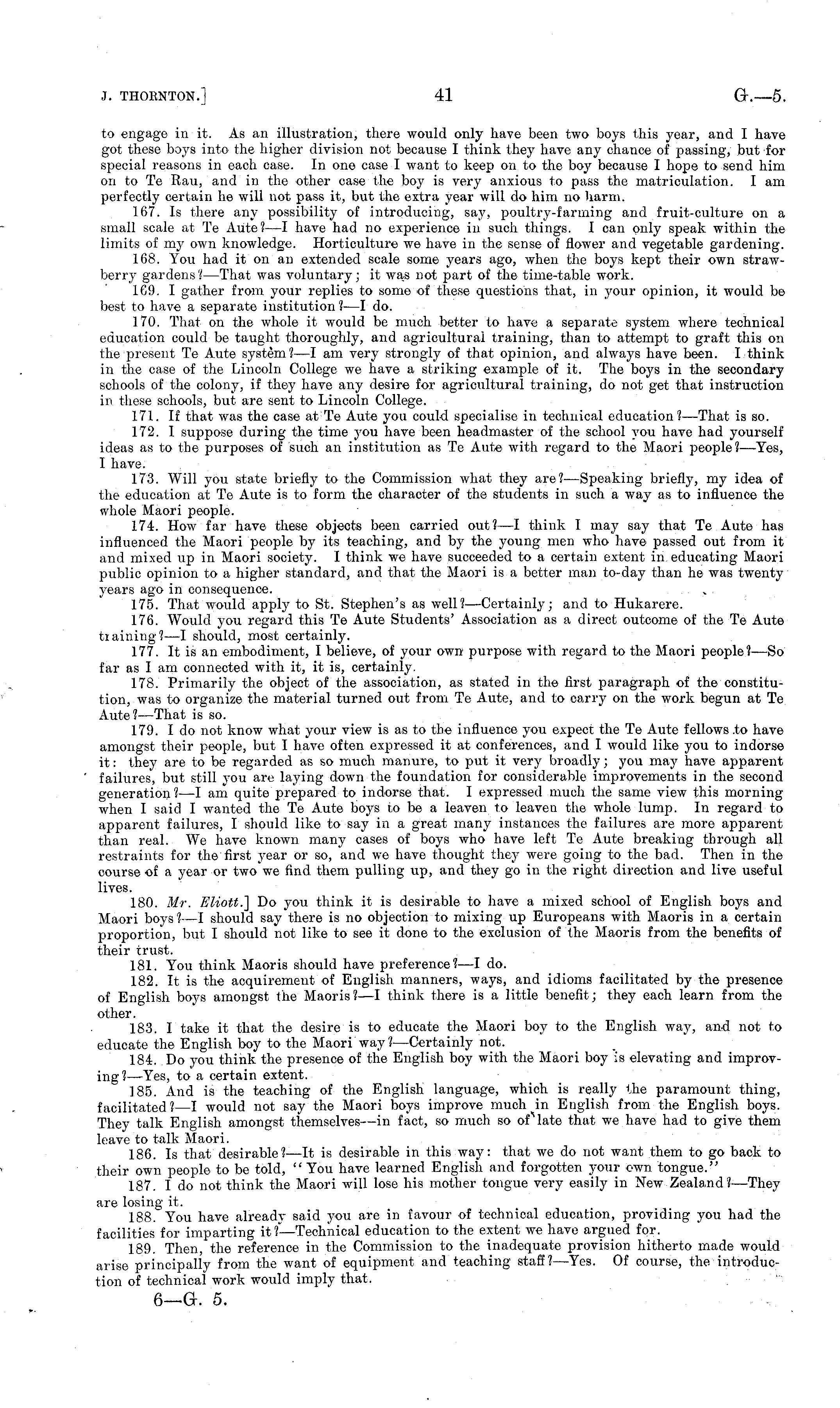 to engage in it. As an illustration, there would only have been two boys this year, and I have got these boys into the higher division not because I think they have any chance of passing, but for special reasons in each case. In one case I want to keep on to the boy because I hope to send him on to Te Rau, and in the other case the boy is very anxious to pass the matriculation. lam perfectly certain he will not pass it, but the extra year will do him no harm. 167. Is there any possibility of introducing, say, poultry-farming and fruit-culture on a small scale at Te Aute?—l have had no experience in such things. I can only speak within the limits of my own knowledge. Horticulture we have in the sense of flower and vegetable gardening. 168. You had it on an extended scale some years ago, when the boys kept their own strawberry gardens? —That was voluntary; it was not part of the time-table work. 169. I gather from your replies to some of these questions that, in your opinion, it would be best to have a separate institution ?—I do. 170. That on the whole it would be much better to have a separate system where technical education could be taught thoroughly, and agricultural training, than to attempt to graft this on the present Te Aute system? —I am very strongly of that opinion, and always have been. I think in the case of the Lincoln College we have a striking example of it. The boys in the secondary schools of the colony, if they have any desire for agricultural training, do not get that instruction in these schools, but are sent to Lincoln College. 171. If that was the case at Te Aute you could specialise in technical education? —That is so. 172. I suppose during the time you have been headmaster of the school you have had yourself ideas as to the purposes of such an institution as Te Aute with regard to the Maori people?— Yes, I have. 173. Will you state briefly to the Commission what they are? —Speaking briefly, my idea of the education at Te Aute is to form the character of the students in such a way as to influence the whole Maori people. 174. How far have these objects been carried out? —I think I may say that Te Aute has influenced the Maori people by its teaching, and by the young men who have passed out from it and mixed up in Maori society. I think we have succeeded to a certain extent in educating Maori public opinion to a higher standard, and that the Maori is a better man to-day than he was twenty years ago in consequence. 175. That would apply to St. Stephen's as well? —Certainly; and to Hukarere. 176. Would you regard this Te Aute Students' Association as a direct outcome of the Te Aute tiaining?—l should, most certainly. 177. It is an embodiment, I believe, of your own purpose with regard to the Maori people?—So far as I am connected with it, it is, certainly. 178. Primarily the object of the association, as stated in the first paragraph of the constitution, was to organize the material turned out from Te Aute, and to carry on the work begun at Te Aute? —That is so. 179. I do not know what your view is as to the influence you expect the Te Aute fellows .to have amongst their people, but I have often expressed it at conferences, and I would like you to indorse it: they are to be regarded as so much manure, to put it very broadly; you may have apparent failures, but still you are laying down the foundation for considerable improvements in the second generation ?—I am quite prepared to indorse that. I expressed much the same view this morning when I said I wanted the Te Aute boys to be a leaven to leaven the whole lump. In regard to apparent failures, I should like to say in a great many instances the failures are more apparent than real. We have known many cases of boys who have left Te Aute breaking through all restraints for the first year or so, and we have thought they were going to the bad. Then in the course of a year or two we find them pulling up, and they go in the right direction and live useful lives. 180. Mr. Eliott.] Do you think it is desirable to have a mixed school of English boys and Maori boys ?—I should say there is no objection to mixing up Europeans with. Maoris in a certain proportion, but I should not like to see it done to the exclusion of the Maoris from the benefits of their trust. 181. You think Maoris should have preference?—l do. 182. It is the acquirement of English manners, ways, and idioms facilitated by the presence of English boys amongst the Maoris? —I think there is a little benefit; they each learn from the other. 183. I take it that the desire is to educate the Maori boy to the English way, and not to educate the English boy to the Maori way? —Certainly not. 184. Do you think the presence of the English boy with the Maori boy is elevating and improving?— Yes, to a certain extent. 185. And is the teaching of the English language, which is really the paramount thing, facilitated? —I would not say the Maori boys improve much in English from the English boys. They talk English amongst themselves —in fact, so much so ofMate that we have had to give them leave to talk Maori. 186. Is that desirable? —It is desirable in this way: that we do not want them to go back to their own people to be told, "You have learned English and forgotten your own tongue." 187. Ido not think the Maori will lose his mother tongue very easily in New Zealand?— They are losing it. 188. You have already said you are in favour of technical education, providing you had the facilities for imparting it ?—Technical education to the extent we have argued for. 189. Then, the reference in the Commission to the inadequate provision hitherto made would arise principally from the want of equipment and teaching staff?— Yes. Of course, the introduction of technical work would imply that, . - ■ '
