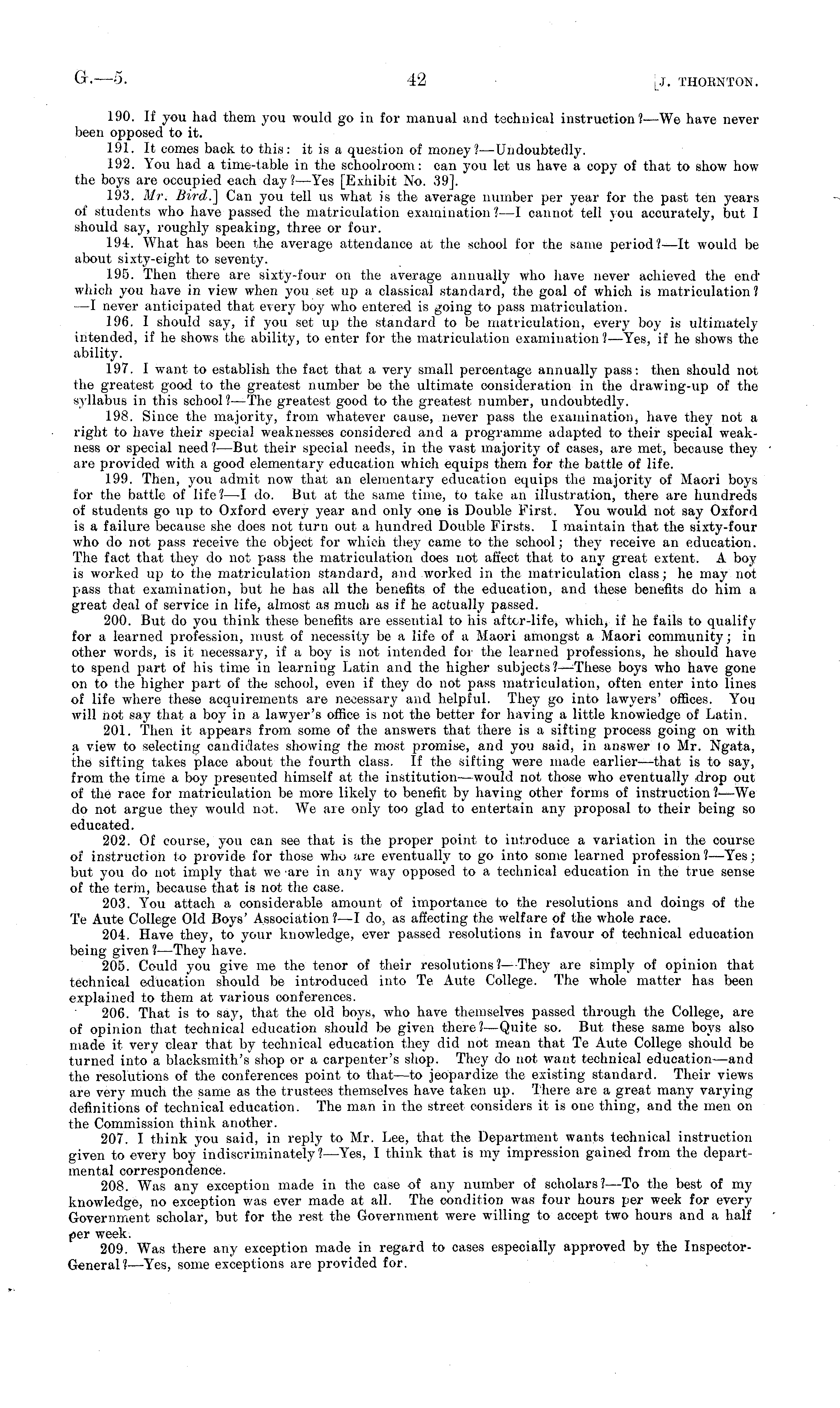 190. If you had them you would go in for manual and technical instruction?-—We have never been opposed to it. 191. It comes back to this: it is a question of money?— Undoubtedly. 192. You had a time-table in the schoolroom: can you let us have a copy of that to show how the boys are occupied each day ?—Yes [Exhibit No. 39]. 193. Mr. Bird.] Can you tell us what is the average number per year for the past ten years of students who have passed the matriculation examination ?—I cannot tell you accurately, but I should say, roughly speaking, three or four. 194. What has been the average attendance at the school for the same period?—lt would be about sixty-eight to seventy. 195. Then there are sixty-four on the average annually who have never achieved the end' which you have in view when you set up a classical standard, the goal of which is matriculation? —I never anticipated that every boy who entered is going to pass matriculation. 196. I should say, if you set up the standard to be matriculation, every boy is ultimatelyintended, if he shows the ability, to enter for the matriculation examination?— Yes, if he shows the ability. 197. I want to establish the fact that a very small percentage annually pass: then should not the greatest good to the greatest number be the ultimate consideration in the drawing-tip of the syllabus in this school? —The greatest good to the greatest number, undoubtedly. 198. Since the majority, from whatever cause, never pass the examination, have they not a right to have their special weaknesses considered and a programme adapted to their special weakness or special need ?—But their special needs, in the vast majority of cases, are met, because they are provided with a good elementary education which equips them for the battle of life. 199. Then, you admit now that an elementary education equips the majority of Maori boys for the battle of life? —I do. But at the same time, to take an illustration, there are hundreds of students go up to Oxford every year and only one is Double First. You would not say Oxford is a failure because she does not turn out a hundred Double Firsts. I maintain that the sixty-four who do not pass receive the object for which they came to the school; they receive an education. The fact that they do not pass the matriculation does not affect that to any great extent. A boy is worked up to the matriculation standard, and worked in the matriculation class; he may not pass that examination, but he has all the benefits of the education, and these benefits do him a great deal of service in life, almost as much as if he actually passed. 200. But do you think these benefits are essential to his after-life, which, if he fails to qualify for a learned profession, must of necessity be a life of a Maori amongst a Maori community; in other words, is it necessary, if a boy is not intended for the learned professions, he should have to spend part of his time in learning Latin and the higher subjects?— These boys who have gone on to the higher part of the school, even if they do not pass matriculation, often enter into lines of life where these acquirements are necessary and helpful. They go into lawyers' offices. You will not say that a boy in a lawyer's office is not the better for having a little knowledge of Latin. 201. Then it appears from some of the answers that there is a sifting process going on with a view to selecting candidates showing the most promise, and you said, in answer lo Mr. Ngata, the sifting takes place about the fourth class. If the sifting were made earlier—that is to say, from the time a boy presented himself at the institution—would not those who eventually drop out of the race for matriculation be more likely to benefit by having other forms of instruction ?—We do not argue they would not. We are only too glad to entertain any proposal to their being so educated. 202. Of course, you can see that is the proper point to introduce a variation in the course of instruction to provide for those who are eventually to go into some learned profession ?—Yes; but you do not imply that we are in any way opposed to a technical education in the true sense of the term, because that is not the case. 203. You attach a considerable amount of importance to the resolutions and doings of the Te Aute College Old Boys' Association ?—I do, as affecting the welfare of the whole race. 204. Have they, to your knowledge, ever passed resolutions in favour of technical education being given ?—They have. 205. Could you give me the tenor of their resolutions? —They are simply of opinion that technical education should be introduced into Te Aute College. The whole matter has been explained to them at various conferences. 206. That is to say, that the old boys, who have themselves passed through the College, are of opinion that technical education should be given there? —Quite so. But these same boys also made it very clear that by technical education they did not mean that Te Aute College should be turned into a blacksmith's shop or a carpenter's shop. They do not want technical education—and the resolutions of the conferences point to that—to jeopardize the existing standard. Their views are very much the same as the trustees themselves have taken up. There are a great many varying definitions of technical education. The man in the street considers it is one thing, and the men on the Commission think another. 207. I think you said, in reply to Mr. Lee, that the Department wants technical instruction given to every boy indiscriminately?— Yes, I think that is my impression gained from the departmental correspondence. 208. Was any exception made in the case of any number of scholars? —To the best of my knowledge, no exception was ever made at all. The condition was four hours per week for every Government scholar, but for the rest the Government were willing to accept two hours and a half per week. 209. Was there any e