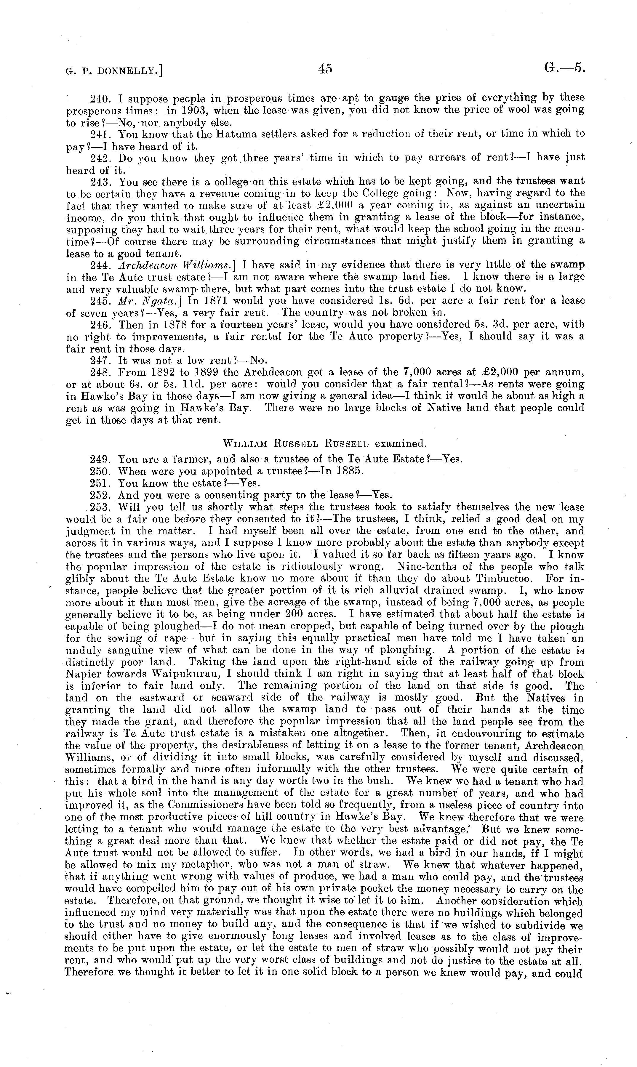 240. I suppose people in prosperous times are apt to gauge the price of everything by these prosperous times: in 1903, when the lease was given, you did not know the price of wool was going to rise? —No, nor anybody else. 241. You know that the Hatuma settlers asked for a reduction of their rent, or time in which to pay?—l have heard of it. 242. Do you know they got three years' time in which to pay arrears of rent? —I have just heard of it. 243. You see there is a college on this estate which has to be kept going, and the trustees want to be certain they have a revenue coming in to keep the College going: Now, having regard to the fact that they wanted to make sure of at'least £2,000 a year coming in, as against an uncertain income, do you think, that ought to influence them in granting a lease of the block—for instance, supposing they had to wait three years for their rent, what would keep the school going in the meantime! —Of course there may be surrounding circumstances that might justify them in granting a lease to a good tenant. 244. Archdeacon Williams.] I have said in my evidence that there is very little of the swamp in the Te Aute trust estate? —I am not aware where the swamp land lies. I know there is a large and very valuable swamp there, but what part comes into the trust estate I do not know. 245. Mr. Ngata.] In 1871 would you have considered Is. 6d. per acre a fair rent for a lease of seven years?— Yes, a very fair rent. The country was not broken in. 246. Then in 1878 for a fourteen years' lease, would you have considered ss. 3d. per acre, with no right to improvements, a fair rental for the Te Aute property ?—Yes, I should say it was a fair rent in those days. 247. It was not a low rent? —No. 248. From 1892 to 1899 the Archdeacon got a lease of the 7,000 acres at £2,000 per annum, or at about 6s. or ss. lid. per acre: would you consider that a fair rental? —As rents were going in Hawke's Bay in those days—l am now giving a general idea—l think it would be about as high a rent as was going in Hawke's Bay. There were no large blocks of Native land that people could get in those days at that rent. William Russell Russell examined. 249. You are a farmer, and also a trustee of the Te Aute Estate? —Yes. 250. When were you appointed a trustee? —In 1885. 251. You know the estate?—Yes. 252. And you were a consenting party to the lease?— Yes. 253. Will you tell us shortly what steps the trustees took to satisfy themselves the new lease would be a fair one before they consented to it ?—The trustees, I think, relied a good deal on my judgment in the matter. I had myself been all over the estate, from one end to the other, and across it in various ways, and I suppose I know more probably about the estate than anybody except the trustees and the persons who live upon it. I valued it so far back as fifteen years ago. I know the popular impression of the estate is ridiculously wrong. Nine-tenths of the people who talk glibly about the Te Aute Estate know no more about it than they do about Timbuctoo. For instance, people believe that the greater portion of it is rich alluvial drained swamp. I, who know more about it than most men, give the acreage of the swamp, instead of being 7,000 acres, as people generally believe it to be, as being under 200 acres. I have estimated that about half the estate is capable of being ploughed—l do not mean cropped, but capable of being turned over by the plough for the sowing of rape —but in saying this equally practical men have told me I have taken an unduly sanguine view of what can be done in the way of ploughing. A portion of the estate is distinctly poor land. Taking the land upon the right-hand side of the railway going up from Napier towards Waipukurau, I should think I am right in saying that at least half of that block is inferior to fair land only. The remaining portion of the land on that side is good. The land on the eastward or seaward side of the railway is mostly good. But the Natives in granting the land did not allow the swamp land to pass out of their hands at the time they made the grant, and therefore the popular impression that all the land people see from the railway is Te Aute trust estate is a mistaken one altogether. Then, in endeavouring to estimate the value of the property, the desirableness of letting it on a lease to the former tenant, Archdeacon Williams, or of dividing it into small blocks, was carefully considered by myself and discussed, sometimes formally and more often informally with the other trustees. We were quite certain of this: that a bird in the hand is any day worth two in the bush. We knew we had a tenant who had put his whole soul into the management of the estate for a great number of years, and who had improved it, as the Commissioners have been told so frequently, from a useless piece of country into one of the most productive pieces of hill country in Hawke's Bay. We knew therefore that we were letting to a tenant who would manage the estate to the very best advantage. But we knew something a great deal more than that. We knew that whether the estate paid or did not pay, the Te Aute trust would not be allowed to suffer. In other words, we had a bird in our hands, if I might be allowed to mix my metaphor, who was not a man of straw. We knew that whatever happened, that if anything went wrong with values of produce, we had a man who could pay, and the trustees would have compelled him to pay out of his own private pocket the money necessary to carry on the estate. Therefore, on that ground, we thought it wise to let it to him. Another consideration which influenced my mind very materially was that upon the estate there were no buildings which belonged to the trust and no money to build any, and the consequence is that if we wished to subdivide we should either have to give enormously long leases and involved leases as to the class of improvements to be put upon the 