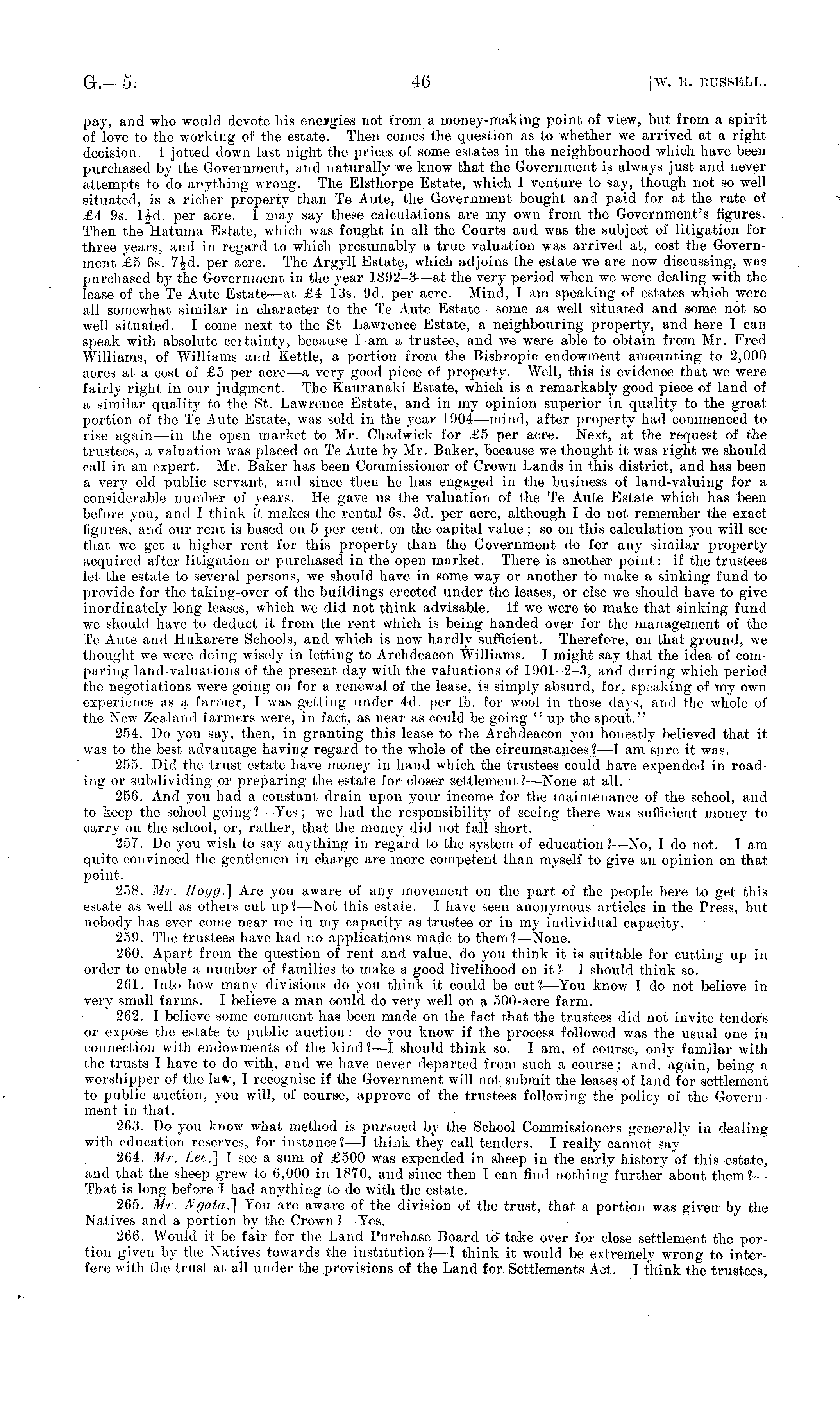 pay, and who would devote his energies not from a money-making point of view, but from a spirit of love to the working of the estate. Then comes the question as to whether we arrived at a right decision. I jotted down last night the prices of some estates in the neighbourhood which have been purchased by the Government, and naturally we know that the Government is always just and never attempts to do anything wrong. The Elsthorpe Estate, which I venture to say, though not so well situated, is a richer property than Te Aute, the Government bought and paid for at the rate of £4 9s. ljd. per acre. I may say these calculations are my own from the Government's figures. Then the Hatuma Estate, which was fought in all the Courts and was the subject of litigation for three years, and in regard to which presumably a true valuation was arrived at, cost the Government £5 6s. 7Jd. per acre. The Argyll Estate, which adjoins the estate we are now discussing, was purchased by the Government in the } r ear 1892-3—at the very period when we were dealing with the lease of the Te Aute Estate —at £4 13s. 9d. per acre. Mind, lam speaking of estates which were all somewhat similar in character to the Te Aute Estate- —some as well situated and some not so well situated. I come next to the St Lawrence Estate, a neighbouring property, and here I can speak with absolute certainty, because I am a trustee, and we were able to obtain from Mr. Fred Williams, of Williams and Kettle, a portion from the Bishropic endowment amounting to 2,000 acres at a cost of £5 per acre—a very good piece of property. Well, this is evidence that we were fairly right in our judgment. The Kauranaki Estate, which is a remarkably good piece of land of a similar quality to the St. Lawrence Estate, and in my opinion superior in quality to the great portion of the Te Aute Estate, was sold in the year 1904—mind, after property had commenced to rise again—in the open market to Mr. Chadwick for £5 per acre. Next, at the request of the trustees, a valuation was placed on Te Aute by Mr. Baker, because we thought it was right we should call in an expert. Mr. Baker has been Commissioner of Crown Lands in this district, and has been a very old public servant, and since then he has engaged in the business of land-valuing for a considerable number of years. He gave us the valuation of the Te Aute Estate which has been before you, and I think it makes the rental 6s. 3d. per acre, although I do not remember the exact figures, and our rent is based on 5 per cent, on the capital value; so on this calculation you will see that we get a higher rent for this property than the Government do for any similar property acquired after litigation or purchased in the open market. There is another point: if the trustees let the estate to several persons, we should have in some way or another to make a sinking fund to provide for the taking-over of the buildings erected under the leases, or else we should have to give inordinately long leases, which we did not think advisable. If we were to make that sinking fund we should have to deduct it from the rent which is being handed over for the management of the Te Aute and Hukarere Schools, and which is now hardly sufficient. Therefore, on that ground, we thought we were doing wisely in letting to Archdeacon Williams. I might say that the idea of comparing land-valuations of the present day with the valuations of 1901-2-3, and during which period the negotiations were going on for a renewal of the lease, is simply absurd, for, speaking of my own experience as a farmer, I was getting under 4d. per lb. for wool in those days, and the whole of the New Zealand farmers were, in fact, as near as could be going " up the spout." 254. Do you say, then, in granting this lease to the Archdeacon you honestly believed that it was to the best advantage having regard to the whole of the circumstances? —I am sure it was. 255. Did the trust estate have money in hand which the trustees could have expended in roading or subdividing or preparing the estate for closer settlement? —None at all. 256. And you had a constant drain upon your income for the maintenance of the school, and to keep the school going?— Yes; we had the responsibility of seeing there was sufficient money to carry on the school, or, rather, that the money did not fall short. 257. Do you wish to say anything in regard to the system of education?—No, Ido not. lam quite convinced the gentlemen in charge are more competent than myself to give an opinion on that point. 258. Mr. Hogg.] Are you aware of any movement on the part of the people here to get this estate as well as others cut up?— Not this estate. I have seen anonymous articles in the Press, but nobody has ever come near me in my capacity as trustee or in my individual capacity. 259. The trustees have had no applications made to them?— None. 260. Apart from the question of rent and value, do you think it is suitable for cutting up in order to enable a number of families to make a good livelihood on it? —I should think so. 261. Into how many divisions do you think it could be cut?-—You know I do not believe in very small farms. I believe a man could do very well on a 500-acre farm. 262. I believe some comment has been made on the fact that the trustees did not invite tenders or expose the estate to public auction : do you know if the process followed was the usual one in connection with endowments of the kind ?—I should think so. I am, of course, only familar with the trusts I have to do with, and we have never departed from such a course; and, again, being a worshipper of the law, I recognise if the Government will not submit the leases of land for settlement to public auction, you will, of course, approve of the trustees following the policy of the Government in that. 263. Do you know what method is pursued by the School Commissioners generally in dealing with education reserves, for i