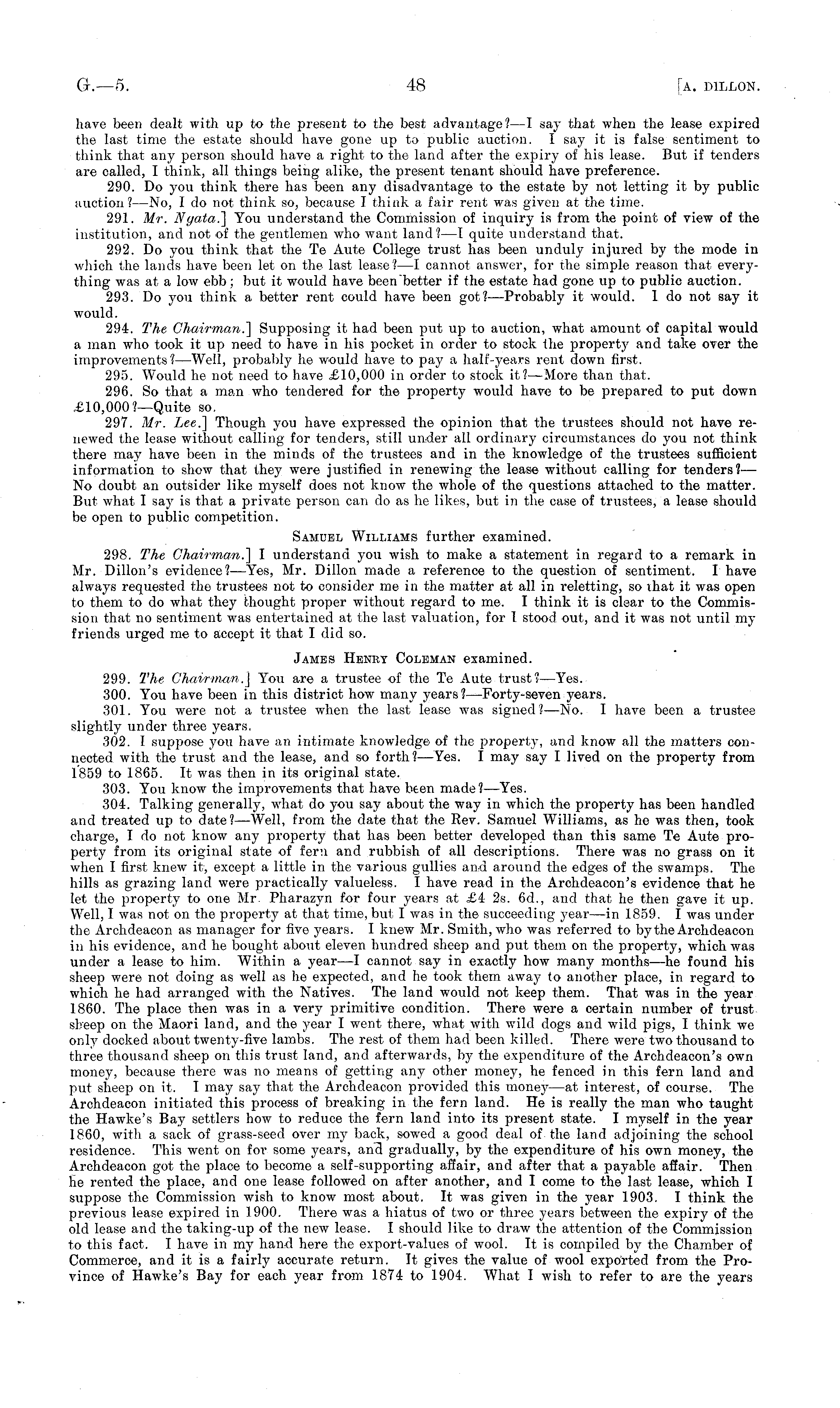 have been dealt with up to the present to the best advantage?—l say that when the lease expired the last time the estate should have gone up to public auction. I say it is false sentiment to think that any person should have a right to the land after the expiry of his lease. But if tenders are called, I think, all things being alike, the present tenant should have preference. 290. Do you think there has been any disadvantage to the estate by not letting it by public auction?—No, I do not think so, because I think a fair rent was given at the time. 291. Mr. Ngata.] You understand the Commission of inquiry is from the point of view of the institution, and not of the gentlemen who want land? —I quite understand, that. 292. Do you think that the Te Aute College trust has been unduly injured by the mode in which the lands have been let on the last lease?—l cannot answer, for the simple reason that everything was at a low ebb; but it would have been'better if the estate had gone up to public auction. 293. Do you think a better rent could have been got?— Probably it would. 1 do not say it would. 294. The Chairman.] Supposing it had been put up to auction, what amount of capital would a man who took it up need to have in his pocket in order to stock the property and take over the improvements ?—Well, probably he would have to pay a half-years rent down first. 295. Would he not need to have £10,000 in order to stock it?— More than that. 296. So that a man who tendered for the property would have to be prepared to put down £10,000?— Quite so. 297. Mr. Lee.] Though you have expressed the opinion that the trustees should not have renewed the lease without calling for tenders, still under all ordinary circumstances do you not think there may have been in the minds of the trustees and in the knowledge of the trustees sufficient information to show that they were justified in renewing the lease without calling for tenders?— No doubt an outsider like myself does not know the whole of the questions attached to the matter. But what I say is that a private person can do as he likes, but in the case of trustees, a lease should be open to public competition. Samuel Williams further examined. 298. The Chairman.] I understand you wish to make a statement in regard to a remark in Mr. Dillon's evidence? —Yes, Mr. Dillon made a reference to the question of sentiment. I have always requested the trustees not to consider me in the matter at all in reletting, so that it was open to them to do what they thought proper without regard to me. I think it is clear to the Commission that no sentiment was entertained at the last valuation, for I stood out, and it was not until my friends urged me to accept it that I did so. James Henry Coleman examined. 299. The Ghavrman.] You are a trustee of the Te Aute trust? —Yes. 300. You have been in this district how many years?— Forty-seven years. 301. You were not a trustee when the last lease was signed?— No. I have been a trustee slightly under three years. 302. I suppose you have an intimate knowledge of the property, and know all the matters connected with the trust and the lease, and so forth? —Yes. I may say I lived on the property from 1859 to 1865. It was then in its original state. 303. You know the improvements that have been made?— Yes. 304. Talking generally, what do you say about the way in which the property has been handled and treated up to date? —Well, from the date that the Rev. Samuel Williams, as he was then, took charge, I do not know any property that has been better developed than this same Te Aute property from its original state of fern and rubbish of all descriptions. There was no grass on it when I first knew it, except a little in the various gullies and around the edges of the swamps. The hills as grazing land were practically valueless. I have read in the Archdeacon's evidence that he let the property to one Mr. Pharazyn for four years at £4 2s. 6d., and that he then gave it up. Well, I was not on the property at that time, but I was in the succeeding year—in 1859. I was under the Archdeacon as manager for five years. I knew Mr. Smith, who was referred to by the Archdeacon in his evidence, and he bought about eleven hundred sheep and put them on the property, which was under a lease to him. Within a year —I cannot say in exactly how many months —he found his sheep were not doing as well as he expected, and he took them away to another place, in regard to which he had arranged with the Natives. The land would not keep them. That was in the year 1860. The place then was in a very primitive condition. There were a certain number of trust sheep on the Maori land, and the year I went there, what with wild clogs and wild pigs, I think we only docked about twenty-five lambs. The rest of them had been killed. There were two thousand to three thousand sheep on this trust land, and afterwards, by the expenditure of the Archdeacon's own money, because there was no means of getting any other money, he fenced in this fern land and put sheep on it. I may say that the Archdeacon provided this money—at interest, of course. The Archdeacon initiated this process of breaking in the fern land. He is really the man who taught the Hawke's Bay settlers how to reduce the fern land into its present state. I myself in the year 1860, with a sack of grass-seed over my back, sowed a good deal of the land adjoining the school residence. This went on for some years, and gradually, by the expenditure of his own money, the Archdeacon got the place to become a self-supporting affair, and after that a payable affair. Then he rented the place, and one lease followed on after another, and I come to the last lease, which I suppose the Commission wish to know most about. It was given in the year 1903. I think the previous lease expired in 1900. There was a hiatus of two or three years between the expiry of the old lease and the taking-up of the new