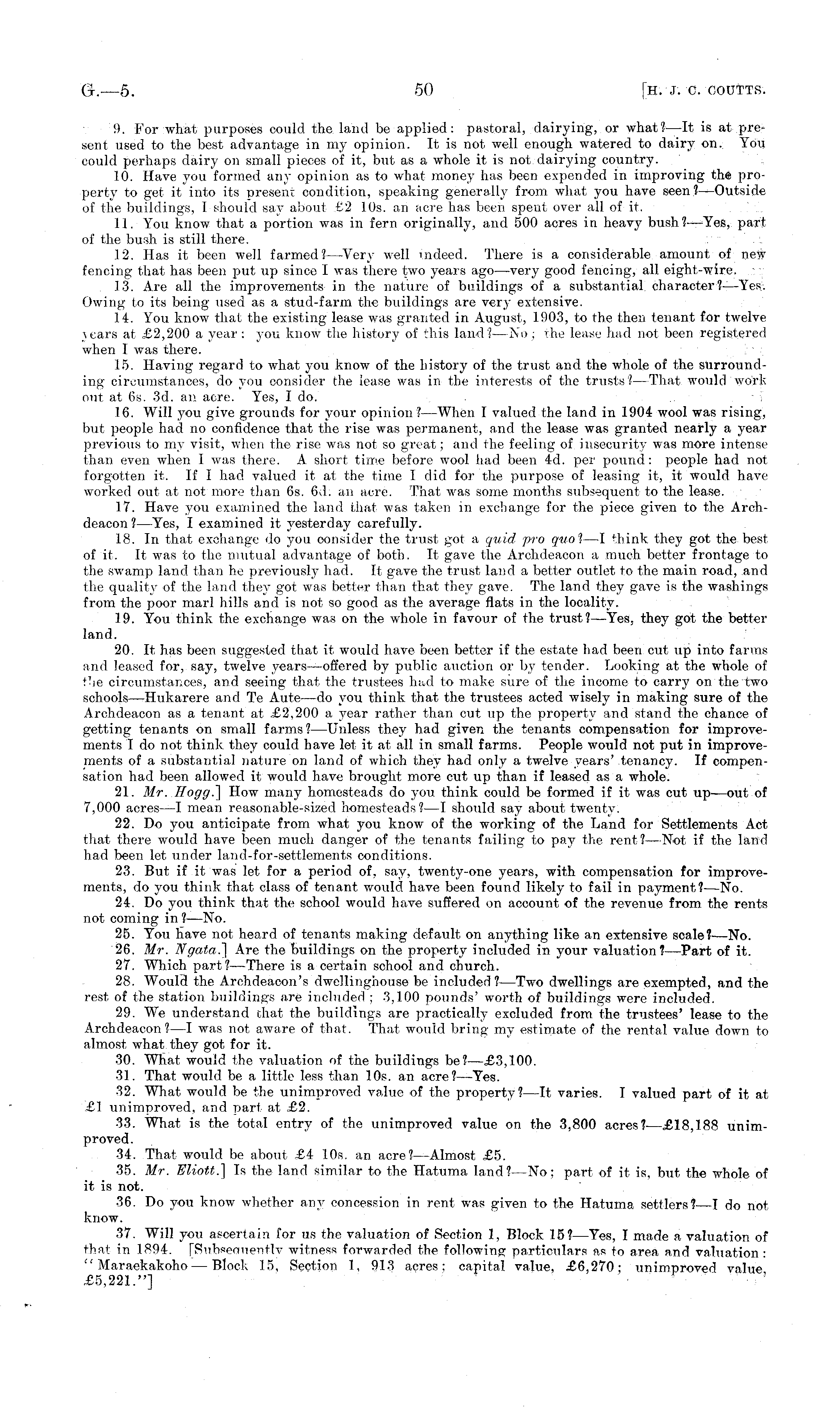 9. For what purposes could the land be applied: pastoral, dairying, or what?—lt is at present used to the best advantage in my opinion. It is not well enough watered to dairy on.. You could perhaps dairy on small pieces of it, but as a whole it is not dairying country. 10. Have you formed any opinion as to what money has been expended in improving the property to get it into its present condition, speaking generally from what you have of the buildings, I should say about £2 10s. an acre has been spent over all of it. 11. You know that a portion was in fern originally, and 500 acres in heavy bush?- —Yes, part of the bush is still there. 12. Has it been well farmed?— Very well indeed. There is a considerable amount of new fencing that has been put up since I was there two years ago—very good fencing, all eight-wire. 13. Are all the improvements in the nature of buildings of a substantial character ?—Yes. Owing to its being used as a stud-farm the buildings are very extensive. 14. You know that the existing lease was granted in August, 1903, to the then tenant for twelve \ears at £2,200 a year : you know the history of this land ?—No ; the lease had not been registered when I was there. 15. Having regard to what you know of the history of the trust and the whole of the surrounding circumstances, do you consider the lease was in the interests of the trusts? —That would work out at 6s. 3d. an acre. Yes, I do. 16. Will you give grounds for your opinion ?—When I valued the land in 1904 wool was rising, but people had no confidence that the rise was permanent, and the lease was granted nearly a year previous to my visit, when the rise was not so great; and the feeling of insecurity was more intense than even when I was there. A short time before wool had been 4d. per pound: people had not forgotten it. If I had valued it at the time I did for the purpose of leasing it, it would have worked out at not more than 6s. 6d. an acre. That was some months subsequent to the lease. 17. Have you examined the land that was taken in exchange for the piece given to the Archdeacon ?—Yes, I examined it yesterday carefully. 18. In that exchange do you consider the trust got a quid, pro quol —l think they got the best of it. It was to the mutual advantage of both. It gave the Archdeacon a much better frontage to the swamp land than he previously had. It gave the trust land a better outlet to the main road, and the quality of the land they got was better than that they gave. The land they gave is the washings from the poor marl hills and is not so good as the average flats in the locality. 19. You think the exchange was on the whole in favour of the trust?— Yes, they got the better land. 20. It has been suggested that it would have been better if the estate had been cut up into farms and leased for, say, twelve years —offered by public auction or by tender. Looking at the whole of the circumstances, and seeing that the trustees had to make sure of the income to carry on the two schools—Hukarere and Te Aute—do you think that the trustees acted wisely in making sure of the Archdeacon as a tenant, at £2,200 a year rather than cut up the property and stand the chance of getting tenants on small farms ?—Unless they had given the tenants compensation for improvements Ido not think they could have let it at all in small farms. People would not put in improvements of a substantial nature on land of which they had only a twelve years' tenancy. If compensation had been allowed it would have brought more cut up than if leased as a whole. 21. Mr. Hogg.] How many homesteads do you think could be formed if it was cut up—out of 7,000 acres—l mean reasonable-sized homesteads?—l should say about twenty. 22. Do you anticipate from what you know of the working of the Land for Settlements Act that there would have been much danger of the tenants failing to pay the rent? —Not if the land had been let under land-for-settlements conditions. 23. But if it was let for a period of, say, twenty-one years, with compensation for improvements, do you think that class of tenant would have been found likely to fail in payment?— No. 24. Do you think that the school would have suffered on account of the revenue from the rents not coming in ?—No. 25. You have not heard of tenants making default on anything like an extensive scale?— No. 26. Mr. Ngata.] Are the buildings on the property included in your valuation?— Part of it. 27. Which part?— There is a certain school and church. 28. Would the Archdeacon's dwellinghouse be included? —Two dwellings are exempted, and the rest of the station buildings are included : 3,100 pounds' worth of buildings were included. 29. We understand that the buildings are practically excluded from the trustees' lease to the Archdeacon? —I was not aware of that. That would bring my estimate of the rental value down to almost what they got for it. 30. What would the valuation of the buildings be?—£3,loo. 31. That would be a little less than 10s. an acre? —Yes. 32. What would be the unimproved value of the property?—lt varies. I valued part of it at £1 unimproved, and part, at £2. 33. What is the total entry of the unimproved value on the 3,800 acres?—£lB,lBB unimproved. 34. That would be about £4 10s. an acre?— Almost £5. 35. Mr. Eliott.] Is the land similar to the Hatuma land?—No; part of it is, but the whole of it is not. 36. Do you know whether any concession in rent was given to the Hatuma settlers?—l do not know. 37. Will you ascertain for us the valuation of Section 1, Block 15?— Yes, I made a valuation of that in 1894. [Subsemientlv witness forwarded the following particulars as to area and valuation: " Maraekakoho—Block 15, Section 1, 913 acres; capital value, £6,270; unimproved value £5,221."]