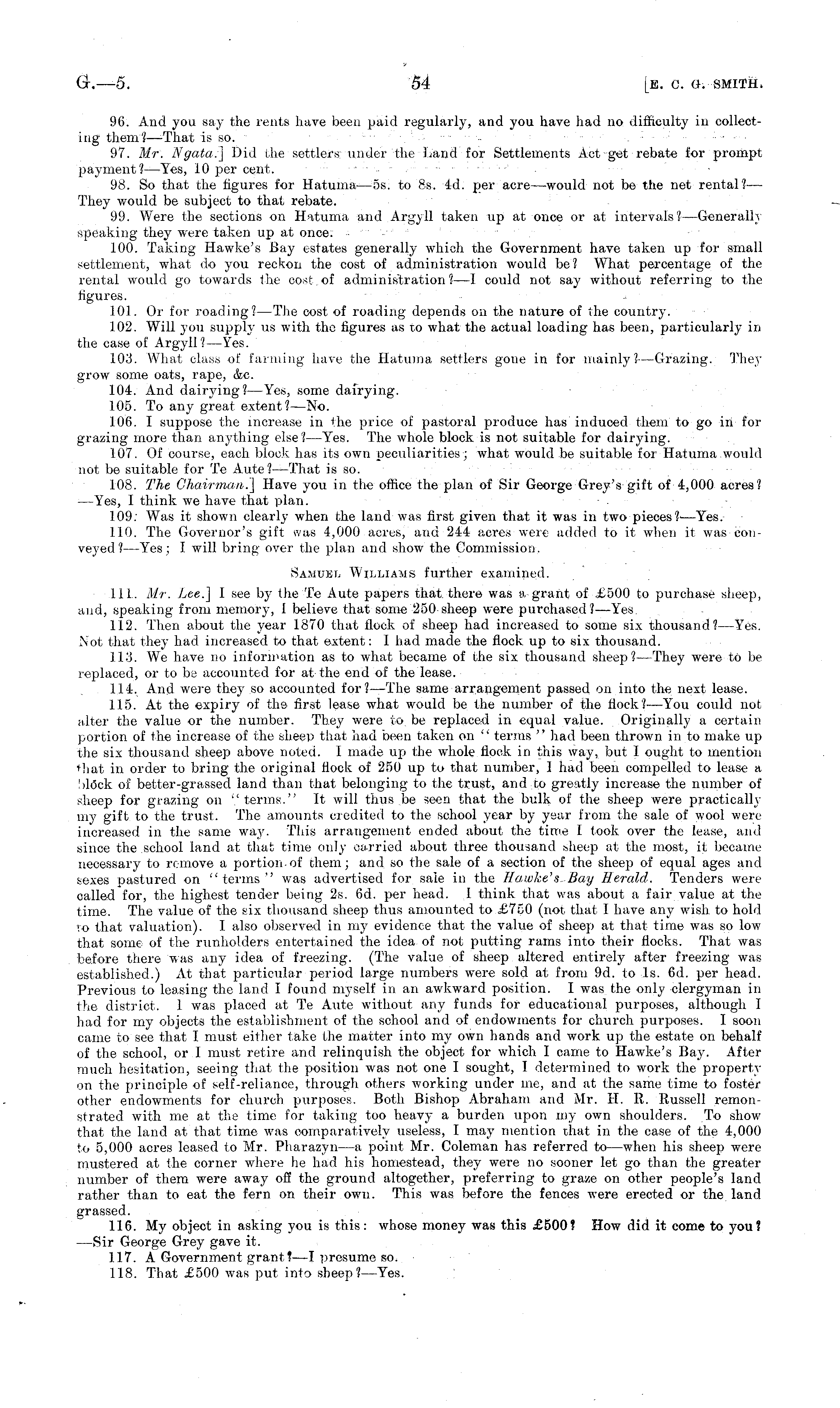 96. And you say the rents have been paid regularly, and you have had no difficulty in collecting thenr? —That is so. .... 97. Mr. Ngata:] Did the settlers; under the Land for Settlements Act get rebate for prompt payment? —Yes, 10 per cent, ... 98. So that the figures for Hatuma—ss. to Bs. 4d. per acre—would not be the net rental?— They would be subject to that rebate. 99. Were the sections on Hatuma and Argyll taken up at once or at intervals?— Generally speaking they were taken up at once. 100. Taking Hawke's Bay estates generally which the Government have taken up for small settlement, what do you reckon the cost of administration would be? What percentage of the rental would go towards the cost.of administration? —I could not say without referring to the figures. 101. Or for roading?—The cost of roading depends on the nature of the country. 102. Will you supply us with the figures as to what the actual loading has been, particularly in the case of Argyll?— Yes. 103. What class of farming have the Hatuma settlers gone in for mainly?— Grazing. They grow some oats, rape, &c. 104. And dairjdng?—Yes, some dairying. 105. To any great extent?— No. 106. I suppose the increase in the price of pastoral produce has induced them to go in for grazing more than anything else?— Yes. The whole block is not suitable for dairying. 1.07. Of course, each block has its own peculiarities ; what would be suitable for Hatuma would not be suitable for Te Aute? —That is so. 108. The Chairman.] Have you in the office the plan of Sir George Grey's gift of 4,000 acres? —Yes, I think we have that plan. 109: Was it shown clearly when the land was first given that it was in two pieces?-—Yes. 110. The Governor's gift was 4,000 acres, and 244 acres were added to it when it was conveyed ?—Yes; I will bring over the plan and show the Commission-. Samuel Williams further examined. 111. Mr. Lee.] I see by the Te Aute papers that, there was a grant of £500 to purchase sheep, and, speaking from memory, I believe that some 250 sheep were purchased?— Yes. 112. Then about the year 1870 that flock of sheep had increased to some six thousand? —Yes. Not that they had increased to that extent: I had made the flock up to six thousand. 113. We have no information as to what became of the six thousand sheep?— They were to be replaced, or to be accounted for at the end of the lease. 114. And were they so accounted for? —The same arrangement passed on into the next lease. 115. At the expiry of the first lease what would be the number of the flock? —You could not alter the value or the number. They were to be replaced in equal value. Originally a certain portion of the increase of the sheep that had been taken on " terms " had been thrown in to make up the six thousand sheep above noted. I made up the whole flock in this way, but I ought to mention that in order to bring the original flock of 250 up to that number, I had been compelled to lease a block of better-grassed land than that belonging to the trust, and.to greatly increase the number of sheep for grazing on "terms," It will thus be seen that the bulk of the sheep were practically my gift to the trust. The amounts credited to the school year by year from the sale of wool were increased in the same waj'. This arrangement ended about the time I took over the lease, and since the school land at that time only carried about three thousand sheep at the most, it became necessary to remove a portion of them; and so the sale of a section of the sheep of equal ages and sexes pastured on "terms" was advertised for sale in the Hawke's Bay Herald. Tenders were called for, the highest tender being 2s. 6d. per head. 1 think that was about a fair value at the time. The value of the six thousand sheep thus amounted to £750 (not that I have any wish to hold to that valuation). I also observed in my evidence that the value of sheep at that time was so low that some of the runholders entertained the idea of not putting rams into their flocks. That was before there was any idea of freezing. (The value of sheep altered entirely after freezing was established.) At that particular period large numbers were sold at from 9d. to Is. 6d. per head. Previous to leasing the land I found myself in an awkward position. I was the only clergyman in the district, 1 was placed at Te Ante without any funds for educational purposes, although I had for my objects the establishment of the school and of endowments for church purposes. I soon came to see that I must either take the matter into my own hands and work up the estate on behalf of the school, or I must retire and relinquish the object for which I came to Hawke's Bay. After much hesitation, seeing that the position was not one I sought, I determined to work the property on the principle of self-reliance, through others working under me, and at the same time to foster other endowments for church purposes. Both Bishop Abraham and Mr. H. R. Russell remonstrated with me at the time for taking too heavy a burden upon my own shoulders. To show that the land at that time was comparatively useless, I may mention that in the case of the 4,000 to 5,000 acres leased to Mr. Pharazyn—a point Mr. Coleman has referred to —when his sheep were mustered at the corner where he had his homestead, they were no sooner let go than the greater number of them were away off the ground altogether, preferring to graze on other people's land rather than to eat the fern on their own. This was before the fences were erected or the land grassed. 116. My object in asking you is this: whose money was this £500? How did it come to you? —Sir George Grey gave it. 117. A Government grant?—l presume so. 118. That £500 was put into sheep?— Yes.
