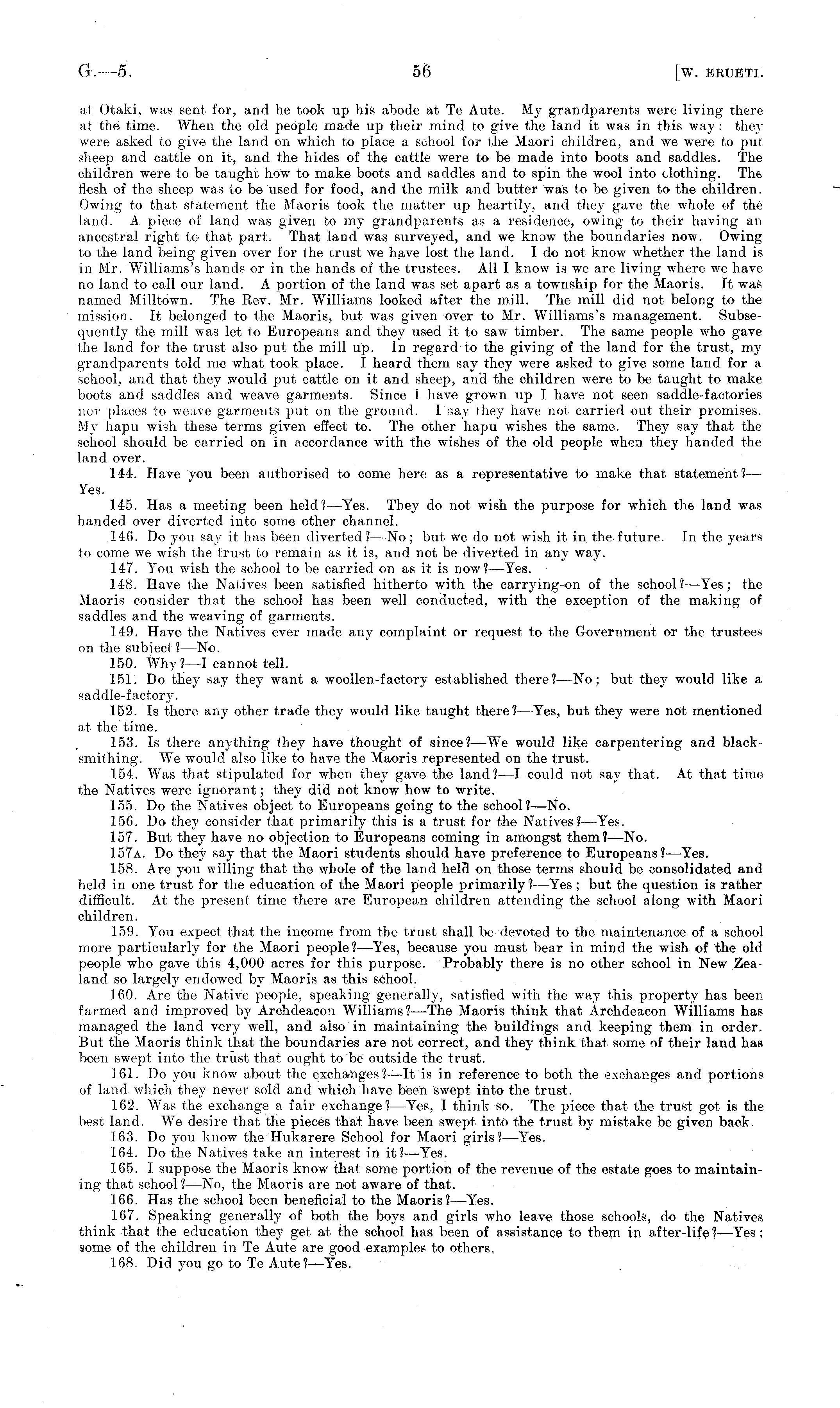 at Otaki, was sent for, and he took up his abode at Te Aute. My grandparents were living there at the time. When the old people made up their mind to give the land it was in this way: they were asked to give the land on which to place a school for the Maori children, and we were to put sheep and cattle on it, and the hides of the cattle were to be made into boots and saddles. The children were to be taught how to make boots and saddles and to spin the wool into clothing. The flesh of the sheep was to be used for food, and the milk and butter was to be given to the children. Owing to that statement the Maoris took the matter up heartily, and they gave the whole of the land. A piece of land was given to my grandparents as a residence, owing to their having an ancestral right to that part. That land was surveyed, and we know the boundaries now. Owing to the land being given over for the trust we have lost the land. Ido not know whether the land is in Mr. Williams's hands or in the hands of the trustees. All I know is we are living where we have no land to call our land. A portion of the land was set apart as a township for the Maoris. It was named Milltown. The Rev. Mr. Williams looked after the mill. The mill did not belong to the mission. It belonged to the Maoris, but was given over to Mr. Williams's management. Subsequently the mill was let to Europeans and they used it to saw timber. The same people who gave the land for the trust also put the mill up. In regard to the giving of the land for the trust, my grandparents told me what took place. I heard them say they were asked to give some land for a school, and that they would put cattle on it and sheep, and the children were to be taught to make boots and saddles and weave garments. Since I have grown up I have not seen saddle-factories nor places to weave garments put on the ground. I say they have not carried out their promises. My hapu wish these terms given effect to. The other hapu wishes the same. They say that the school should be carried on in accordance with the wishes of the old people when they handed the land over. 144. Have you been authorised to come here as a representative to make that statement? — Yes. 145. Has a meeting been held?— Yes. They do not wish the purpose for which the land was handed over diverted into some other channel. 146. Do you say it has been diverted?—No; but we do not wish it in the future. In the years to come we wish the trust to remain as it is, and not be diverted in any way. 147. You wish the school to be carried on as it is now?— Yes. 148. Have the Natives been satisfied hitherto with the carrying-on of the school?— Yes; the Maoris consider that the school has been well conducted, with the exception of the making of saddles and the weaving of garments. 149. Have the Natives ever made an)' complaint or request to the Government or the trustees on the subiect? —No. 150. Why?—l cannot tell. 151. Do they say they want a woollen-factory established there?—No; but they would like a saddle-factory. 152. Is there any other trade they would like taught there? —Yes, but they were not mentioned at the time. 153. Is there anything they have thought of since?—We would like carpentering and blacksmithing. We would also like to have the Maoris represented on the trust. 154. Was that stipulated for when they gave the land? —I could not say that. At that time the Natives were ignorant; they did not know how to write. 155. Do the Natives object to Europeans going to the school?— No. 156. Do they consider that primarily this is a trust for the Natives? —Yes. 157. But they have no objection to Europeans coming in amongst them?-—No. 157 a. Do they say that the Maori students should have preference to Europeans?— Yes. 158. Are you willing that the whole of the land held on those terms should be consolidated and held in one trust for the education of the Maori people primarily?— Yes; but the question is rather difficult. At the present time there are European children attending the school along with Maori children. 159. You expect that the income from the trust shall be devoted to the maintenance of a school more particularly for the Maori people?— Yes, because you must bear in mind the wish of the old people who gave this 4,000 acres for this purpose. Probably there is no other school in New Zealand so largely endowed by Maoris as this school. 160. Are the Native people, speaking generally, satisfied with the way this property has been farmed and improved by Archdeacon Williams? —The Maoris think that Archdeacon Williams has managed the land very well, and also in maintaining the buildings and keeping them in order. But the Maoris think that the boundaries are not correct, and they think that some of their land has been swept into the trust that ought to be outside the trust. 161. Do you know about the exchanges?—lt is in reference to both the exchanges and portions of land which they never sold and which have been swept into the trust. 162. Was the exchange a fair exchange?— Yes, I think so. The piece that the trust got is the best land. We desire that the pieces that have been swept into the trust by mistake be given back. 163. Do you know the Hukarere School for Maori girls?— Yes. 164. Do the Natives take an interest in it?— Yes. 165. I suppose the Maoris know that some portion of the revenue of the estate goes to maintaining that school?—No, the Maoris are not aware of that. 166. Has the school been beneficial to the Maoris? —Yes. 167. Speaking generally of both the boys and girls who leave those schools, do the Natives think that the education they get at the school has been of assistance to them in after-life? —Yes; some of the children in Te Aute are good examples to others, 168. Did you go to Te Aute?—Yes.