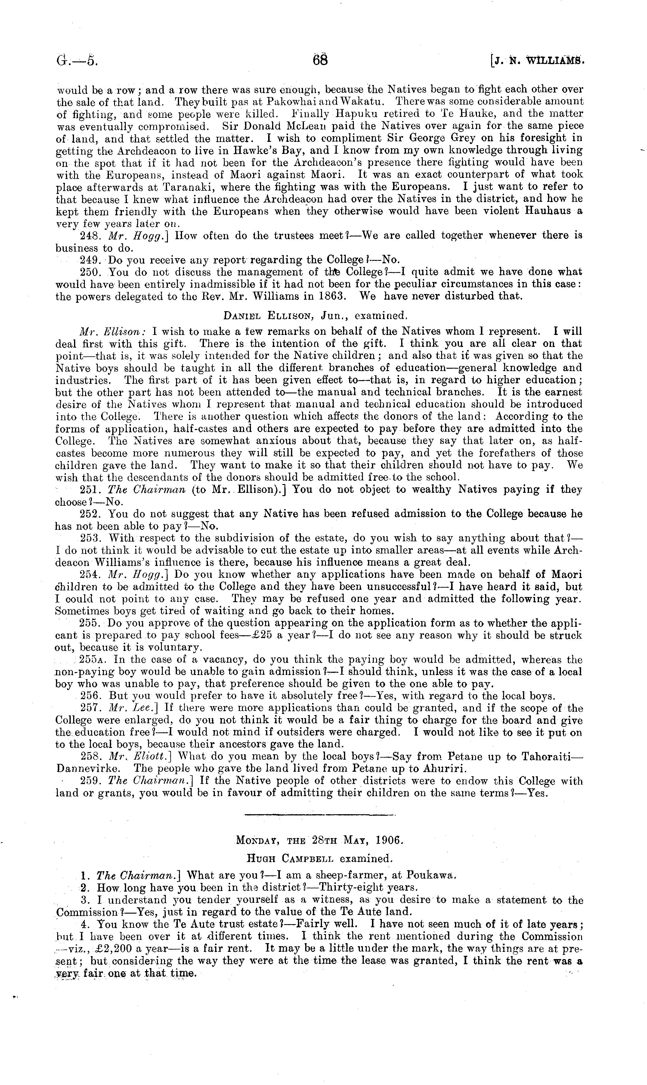 would be a row; and a row there was sure enough, because the Natives began to fight each other over the sale of that land. They built pas at Pakowhai and Wakatu. There was some considerable amount of fighting, and some people were killed. Finally Hapuku retired to Te Hauke, and the matter was eventually compromised. Sir Donald McLean paid the Natives over again for the same piece of land, and that settled the matter. I wish to compliment Sir George Grey on his foresight in getting the Archdeacon to live in Hawke's Bay, and I know from my own knowledge through living on the spot that if it had not been for the Archdeacon's presence there fighting would have been with the Europeans, instead of Maori against Maori. It was an exact counterpart of what took place afterwards at Taranaki, where the fighting was with the Europeans. I just want to refer to that because I knew what influence the Archdeacon had over the Natives in the district, and how he kept them friendly with the Europeans when they otherwise would have been violent Hauhaus a very few years later on. 248. Mr. Hogg.] How often do the trustees meet?—We are called together whenever there is business to do. 249. Do you receive any report regarding the College?— No. 250. You do not discuss the management of the College?—l quite admit we have done what would have been entirely inadmissible if it had not been for the peculiar circumstances in this case: the powers delegated to the Rev. Mr. Williams in 1863. We have never disturbed that. Daniel Ellison, Jun., examined. Mr. Ellison: I wish to make a few remarks on behalf of the Natives whom 1 represent. I will deal first with this gift. There is the intention of the gift. I think you are all clear on that point—that is, it was solely intended for the Native children; and also that it was given so that the Native boys should be taught in all the different, branches of education —general knowledge and industries. The first part of it has been given effect to—that is, in regard to higher education; but the other part has not been attended to- —the manual and technical branches. It is the earnest desire of the Natives whom I represent that manual and technical education should be introduced into the College. There is another question which affects the donors of the land: According to the forms of application, half-castes and others are expected to pay before they are admitted into the College. The Natives are somewhat anxious about that, because they say that later on, as halfcastes become more numerous they will still be expected to pay, and yet the forefathers of those children gave the land. They want to make it so that their children should not have to pay. We wish that the descendants of the donors should be admitted free to the school. 251. The Chairman (to Mr. Ellison).] You do not object to wealthy Natives paying if they choose ?—No. 252. You do not suggest that any Native has been refused admission to the College because he has not been able to pay ?—No. 253. With respect to the subdivision of the estate, do you wish to say anything about that?— I do not think it would be advisable to cut the estate up into smaller areas—at all events while Archdeacon Williams's influence is there, because his influence means a great deal. 254. Mr. Hogg.] Do you know whether any applications have been made on behalf of Maori children to be admitted to the College and they have been unsuccessful?- —I have heard it said, but I could not point to any case. They may be refused one year and admitted the following year. Sometimes boys get tired of waiting and go back to their homes. 255. Do you approve of the question appearing on the application form as to whether the applicant is prepared to pay school fees—£2s a year ?—I do not see any reason why it should be struck out, because it is voluntary. . 255 a. In the case of a vacancy, do you think the paying boy would be admitted, whereas the non-paying boy would be unable to gain admission ?—I should think, unless it was the case of a local boy who was unable to pay, that preference should be given to the one able to pay. 256. But you would prefer to have it absolutely free?— Yes, with regard to the local boys. 257. Mr. Lee.] If there were more applications than could be granted, and if the scope of the College were enlarged, do you not think it would be a fair thing to charge for the board and give the education free? —I would not mind if outsiders were charged. I would not like to see it put on to the local boys, because their ancestors gave the land. 258. Mr, Eliott.] What do you mean by the local boys?— Say from Petane up to Tahoraiti— Dannevirke. The people who gave the land lived from Petane up to Ahuriri. 259. The Chairman.] If the Native people of other districts were to endow this College with land or grants, you would be in favour of admitting their children on the same terms? —Yes.
