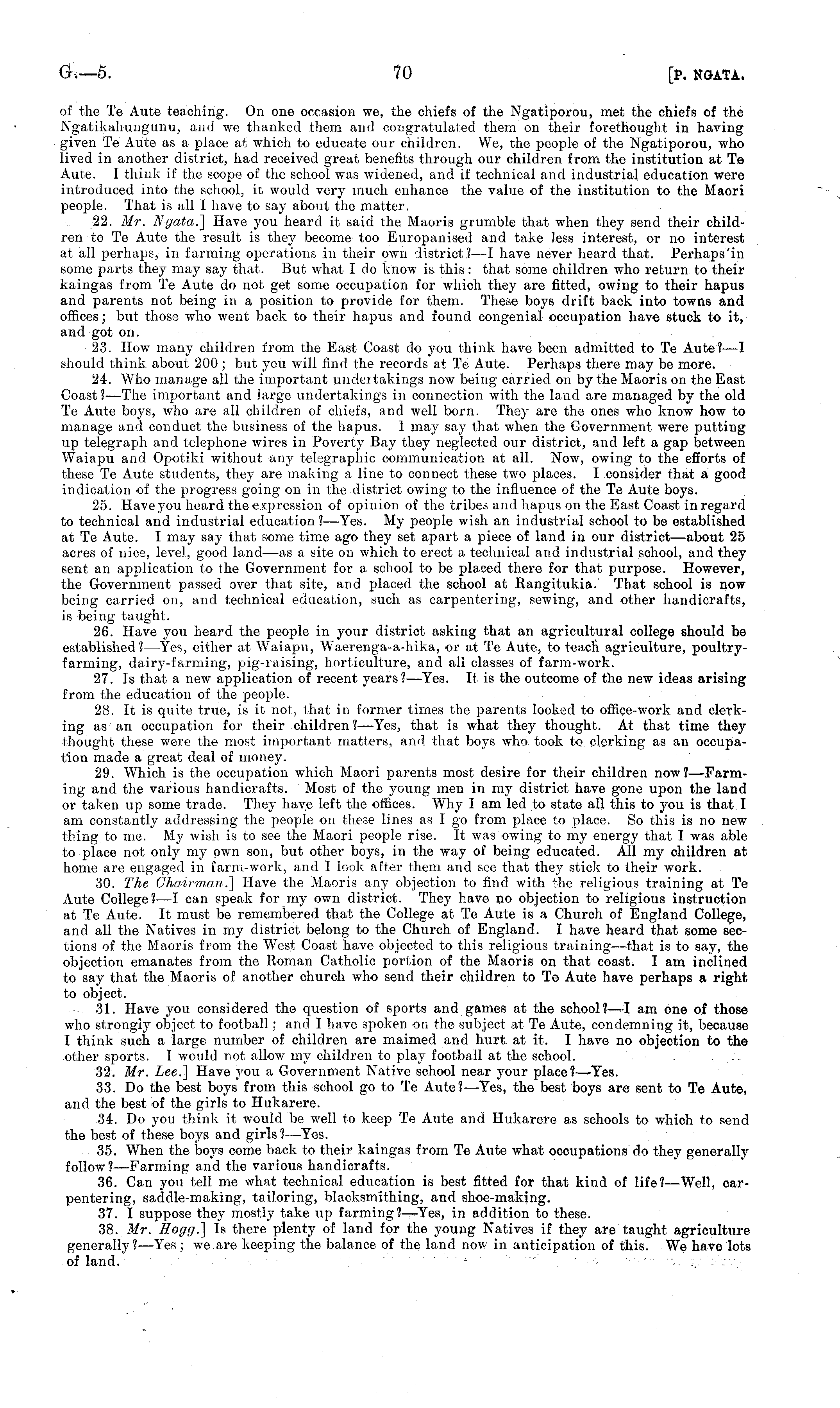 of the Te Aute teaching. On one occasion we, the chiefs of the Ngatiporou, met the chiefs of the Ngatikahungunu, and we thanked them and congratulated them on their forethought in having given Te Aute as a place at which to educate our children. We, the people of the Ngatiporou, who lived in another district, had received great benefits through our children from the institution at Te Aute. I think if the scope of the school was widened, and if technical and industrial education were introduced into the school, it would very much enhance the value of the institution to the Maori people. That is all I have to say about the matter. 22. Mr. Ngata.] Have you heard it said the Maoris grumble that when they send their children to Te Aute the result is they become too Europanised and take Jess interest, or no interest at all perhaps, in farming operations in their own district? —I have never heard that. Perhaps'in some parts they may say that. But what Ido know is this: that some children who return to their kaingas from Te Aute do not get some occupation for which they are fitted, owing to their hapus and parents not being in a position to provide for them. These boys drift back into towns and offices; but those who went back to their hapus and found congenial occupation have stuck to it, and got on. 23. How many children from the East Coast do you think have been admitted to Te Aute?—l should think about 200 ; but you will find the records at Te Aute. Perhaps there may be more. 24. Who manage all the important undei takings now being carried on by the Maoris on the East Coast? —The important and large undertakings in connection with the land are managed by the old Te Aute boys, who are all children of chiefs, and well born. They are the ones who know how to manage and conduct the business of the hapus. 1 may say that when the Government were putting up telegraph and telephone wires in Poverty Bay they neglected our district, and left a gap between Waiapu and Opotiki without any telegraphic communication at all. Now, owing to the efforts of these Te Aute students, they are making a line to connect these two places. I consider that a good indication of the progress going on in the district owing to the influence of the Te Aute boys. 25. Have you heard the expression of opinion of the tribes and hapus on the East Coast in regard to technical and industrial education? —Yes. My people wish an industrial school to be established at Te Aute. I may say that some time ago they set apart a piece of land in our district—about 25 acres of nice, level, good land—as a site on which to erect a technical and industrial school, and they sent an application to the Government for a school to be placed there for that purpose. However, the Government passed over that site, and placed the school at Rangitukia. That school is now being carried on, and technical education, such as carpentering, sewing, and other handicrafts, is being taught. 26. Have you heard the people in your district asking that an agricultural college should be established ?—Yes, either at Waiapu, Waerenga-a-hika, or at Te Aute, to teach agriculture, poultryfarming, dairy-farming, pig-raising, horticulture, and all classes of farm-work. 27. Is that a new application of recent years? —Yes. It is the outcome of the new ideas arising from the education of the people. 28. It is quite true, is it not, that in former times the parents looked to office-work and clerking as an occupation for their children? —Yes, that is what they thought. At that time they thought these were the most important matters, and that boys who took to clerking as an occupation made a great deal of money. 29. Which is the occupation which Maori parents most desire for their children now?— Farming and the various handicrafts. Most of the young men in my district have gone upon the land or taken up some trade. They have left the offices. Why lam led to state all this to you is that I am constantly addressing the people on these lines as Igo from place to place. So this is no new thing to me. My wish is to see the Maori people rise. It was owing to my energy that I was able to place not only my own son, but other boys, in the way of being educated. All my children at home are engaged in farm-work, and I look after them and see that they stick to their work. 30. The Chairman.] Have the Maoris any objection to find with the religious training at Te Aute College?—l can speak for my own district. They have no objection to religious instruction at Te Aute. It must be remembered that the College at Te Aute is a Church of England College, and all the Natives in my district belong to the Church of England. I have heard that some sections of the Maoris from the West Coast have objected to this religious training—that is to say, the objection emanates from the Roman Catholic portion of the Maoris on that coast. I am inclined to say that the Maoris of another church who send their children to Te Aute have perhaps a right to object. 31. Have you considered the question of sports and games at the school?—I am one of those who strongly object to football; and I have spoken on the subject at Te Aute, condemning it, because I think such a large number of children are maimed and hurt at it. I have no objection to the other sports. I would not allow my children to play football at the school. .. 32. Mr. Lee.] Have you a Government Native school near your place?— Yes. 33. Do the best boys from this school go to Te Aute? —Yes, the best boys are sent to Te Aute, and the best of the girls to Hukarere. 34. Do you think it would be well to keep Te Aute and Hukarere as schools to which to send the best of these boys and girls?— Yes. 35. When the boys come back to their kaingas from Te Aute what occupations do they generally follow?— Farming and the various handicrafts. 36. Can you tell me what technical education is best fitted for that kind of life?— Well, carpenterin