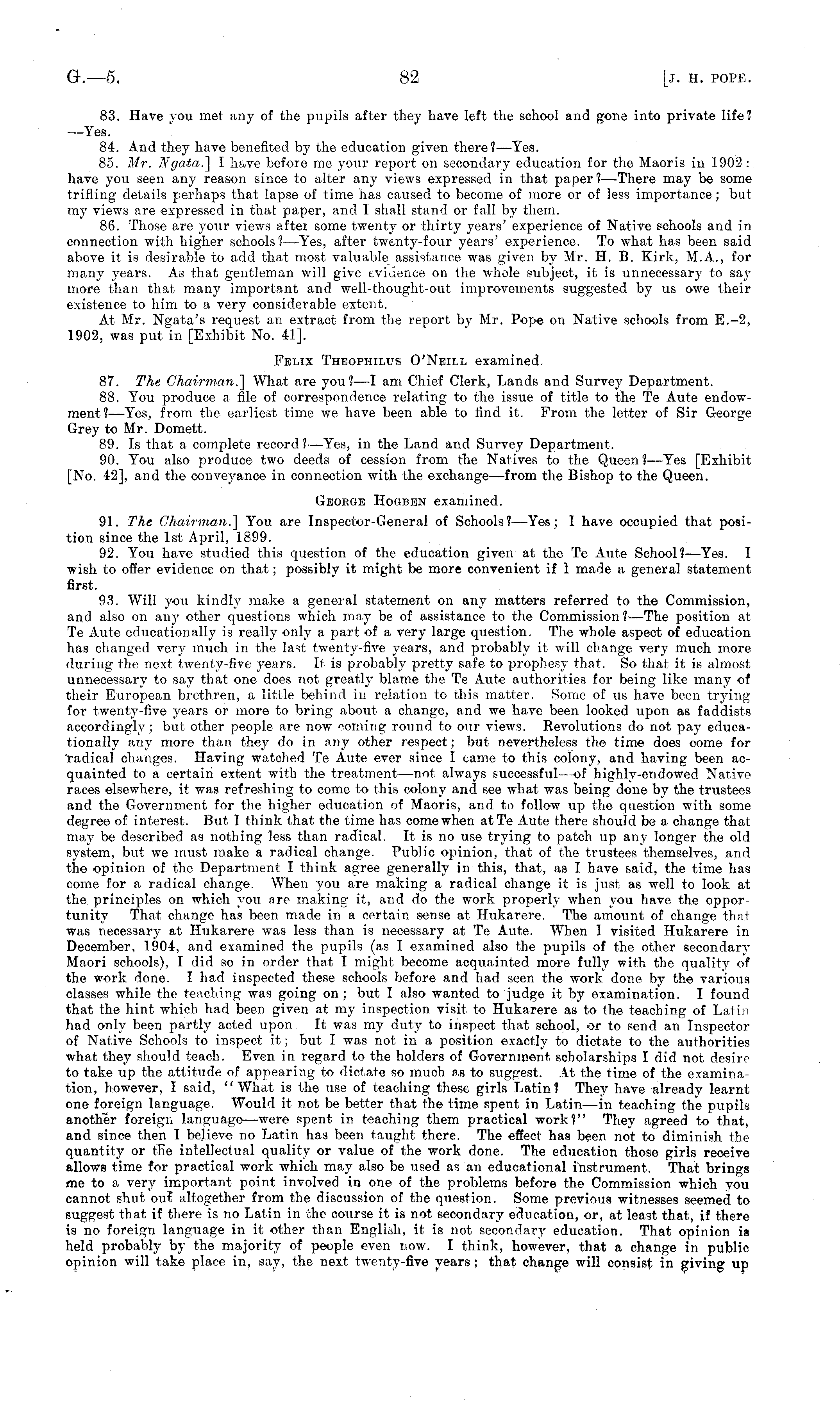 83. Have you met any of the pupils after they have left the school and gone into private life? —Yes. 84. And they have benefited by the education given there?— Yes. 85. Mr. Ngata.] I have before me your report on secondary education for the Maoris in 1902 : have you seen any reason since to alter any views expressed in that paper ?—There may be some trifling details perhaps that lapse of time has caused to become of more or of less importance; but my views are expressed in that paper, and I shall stand or fall by them. 86. Those are your views aftei some twenty or thirty years' experience of Native schools and in connection with higher schools? —Yes, after twenty-four years' experience. To what has been said above it is desirable to add that most valuable assistance was given by Mr. H. B. Kirk, M.A., for many years. As that gentleman will give evidence on the whole subject, it is unnecessary to say more than that many important and well-thought-out improvements suggested by us owe their existence to him to a very considerable extent. At Mr. Ngata's request an extract from the report by Mr. Pope on Native schools from E.-2, 1902, was put in [Exhibit No. 41]. Felix Theophilus O'Neill examined. 87. The Chairman.] What are you? —I am Chief Clerk, Lands and Survey Department. 88. You produce a file of correspondence relating to the issue of title to the Te Aute endowment? —Yes, from the earliest time we have been able to find it. From the letter of Sir George Grey to Mr. Domett. 89. Is that a complete record?— Yes, in the Land and Survey Department, 90. You also produce two deeds of cession from the Natives to the Queen ? —Yes [Exhibit [No. 42], and the conveyance in connection with the exchange—from the Bishop to the Queen. George Hogben examined. 91. The Chairman.] You are Inspector-General of Schools? —Yes; I have occupied that position since the Ist April, 1899. 92. You have studied this question of the education given at the Te Aute School?— Yes. I wish to offer evidence on that; possibly it might be more convenient if 1 made a general statement first. 93. Will you kindly make a general statement on any matters referred to the Commission, and also on any other questions which may be of assistance to the Commission ?—The position at Te Aute educationally is really only a part of a very large question. The whole aspect of education has changed very much in the last twenty-five years, and probably it will change very much more during the next twenty-five years. It is probably pretty safe to prophesy that. So that it is almost unnecessary to say that one does not greatly blame the Te Aute authorities for being like many of their European brethren, a little behind in relation to this matter. Some of us have been trying for twenty-five years or more to bring about a change, and we have been looked upon as faddists accordingly; but other people are now coining round to our views. Revolutions do not pay educationally any more than they do in any other respect; but nevertheless the time does come for 'radical changes. Having watched Te Aute ever since I came to this colony, and having been acquainted to a certain extent with the treatment —not always successful—of highly-endowed Native races elsewhere, it was refreshing to come to this colony and see what was being done by the trustees and the Government for the higher education of Maoris, and to follow up the question with some degree of interest. But I think that the time has come when atTe Aute there should be a change that may be described as nothing less than radical. It is no use trying to patch up any longer the old system, but we must make a radical change. Public opinion, that of the trustees themselves, and the opinion of the Department I think agree generally in this, that, as I have said, the time has come for a radical change. When you are making a radical change it is just as well to look at the principles on which you are making it, and do the work properly when you have the opportunity That change has been made in a certain sense at Hukarere. The amount of change that was necessary at Hukarere was less than is necessary at Te Aute. When I visited Hukarere in December, 1904, and examined the pupils (as I examined also the pupils of the other secondary Maori schools), I did so in order that I might become acquainted more fully with the quality of the work done. I had inspected these schools before and had seen the work done by the various classes while the teaching was going on; but I also wanted to judge it by examination. I found that the hint which had been given at my inspection visit to Hukarere as to the teaching of Latin had only been partly acted upon It was my duty to inspect that school, or to send an Inspector of Native Schools to inspect it; but I was not in a position exactly to dictate to the authorities what they should teach. Even in regard to the holders of Government scholarships I did not desire to take up the attitude of appearing to dictate so much as to suggest. At the time of the examination, however, I said, "What is the use of teaching these girls Latin? They have already learnt one foreign language. Would it not be better that the time spent in Latin—in teaching the pupils another foreign language—were spent in teaching them practical work?" They agreed to that, and since then I believe no Latin has been taught there. The effect has been not to diminish the quantity or the intellectual quality or value of the work done. The education those girls receive allows time for practical work which may also be used as an educational instrument. That brings me to a very important point involved in one of the problems before the Commission which you cannot shut ouE altogether from the discussion of the question. Some previous witnesses seemed to suggest that if there is no Latin in the course it is not secondary education, or, at least that, if there is no foreign language in it other t