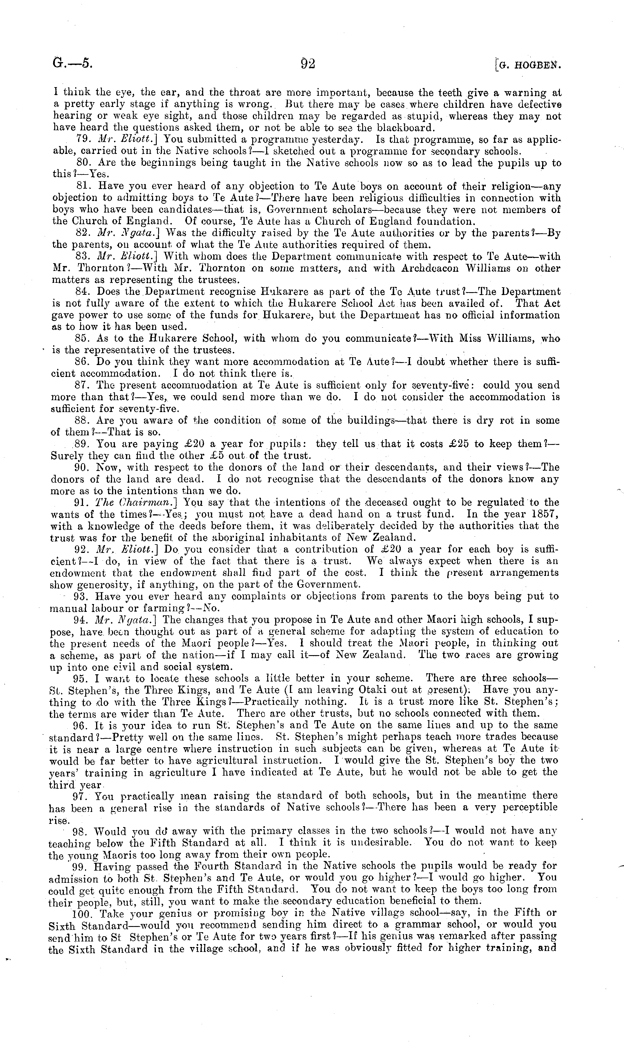 I think the eye, the ear, and the throat are more important, because the teeth give a warning at a pretty early stage if anything is wrong. But there may be cases where children have defective hearing or weak eye sight, and those children may be regarded as stupid, whereas they may not have heard the questions asked them, or not be able to see the blackboard. 79. Mr. Eliott.] You submitted a programme yesterday. Is that programme, so far as applicable, carried out in the Native schools?—l sketched out a programme for secondary schools. 80. Are the beginnings being taught in the Native schools now so as to lead the pupils up to this ?—Yes. 81. Have you ever heard of any objection to Te Aute boys on account of their religion-—any objection to admitting boys to Te Aute?—There have been religious difficulties in connection with boys who have been candidates—that is, Government scholars—because they were not members of the Church of England. Of course, Te Aute has a Church of England foundation. 82. Mr. Ngata.] Was the difficulty raised by the Te Aute authorities or by the parents?—By the parents, on account of what the Te Aute authorities required of them. 83. Mr. Eliott.] With whom does the Department communicate with respect to Te Aute—with Mr. Thornton ?—With Mr. Thornton on some matters, and with Archdeacon Williams on other matters as representing the trustees. 84. Does the Department recognise Hukarere as part of the Te Aute trust?— The Department is not fully aware of the extent to which the Hukarere School Act has been availed of. That Act gave power to use some of the funds for Hukarere, but the Department has no official information as to how it has been used. 85. As to the Hukarere School, with whom do you communicate?— With Miss Williams, who is the representative of the trustees. 86. Do you think they want more accommodation at Te Aute?—l doubt whether there is sufficient accommodation. Ido not think there is. 87. The present accommodation at Te Aute is sufficient only for seventy-five: could you send more than that ?—Yes, we could send more than we do. Ido not consider the accommodation is sufficient for seventy-five. 88. Are you aware of the condition of some of the buildings—that there is dry rot in some of them? —That is so. .89. You are paying £20 a year for pupils: they tell us that it costs £25 to keep them?— Surely they can find the other £5 out of the trust. 90. Now, with respect to the donors of the land or their descendants, and their views?— The donors of the land are dead. I do not recognise that the descendants of the donors know any more as to the intentions than we do. 91. The Chairman.] You say that the intentions of the deceased ought to be regulated to the wants of the times?—-Yes; you must not have a dead hand on a trust fund. In the year 1857, with a knowledge of the deeds before them, it was deliberately decided by the authorities that the trust was for the benefit, of the aboriginal inhabitants of New Zealand. 92. Mr, Eliott.] Do you consider that a contribution of £20 a year for each boy is sufficient? —I do, in view of the fact that there is a trust. We always expect when there is an endowment that the endowment shall find part of the cost. I think the present arrangements show generosity, if anything, on the part of the Government. 93. Have you ever heard any complaints or objections from parents to the boys being put to manual labour or farming?— No. 94. Mr. Ngata.] The changes that you propose in Te Aute and other Maori high schools, I suppose, have been thought out as part of a general scheme for adapting the system of education to the present needs of the Maori people?— Yes. 1 should treat the Maori people, in thinking out a scheme, as part of the nation —if I may call it—of New Zealand. The two races are growing up into one civil and social system. 95. I want to locate these schools a little better in your scheme. There are three schools — St. Stephen's, the Three Kings, and Te Aute (I am leaving Otaki out at present). Have you anything to do with the Three Kings?— Practically nothing. It is a trust more like St. Stephen's; the terms are wider than Te Aute. There are other trusts, but no schools connected with them. 96. It is 3'our idea to run St. Stephen's and Te Aute on the same lines and up to the same standard?- —Pretty well on the same linos. St. Stephen's might perhaps teach more trades because it is near a large centre where instruction in such subjects can be given, whereas at Te Aute it would be far better to have agricultural instruction. I would give the St. Stephen's boy the two years' training in agriculture I have indicated at Te Aute, but he would not be able to get the third year 97. You practically mean raising the standard of both schools, but in the meantime there has been a general rise in the standards of Native schools?— There has been a very perceptible rise. 98. Would you dd away with the primary classes in the two schools?—l would not have any teaching below the Fifth Standard at all. I think it is undesirable. You do not want to keep the young Maoris too long away from their own people. 99. Having passed the Fourth. Standard in the Native schools the pupils would be ready for admission to both. St, Stephen's and Te Aute, or would you go higher?—l would go higher. You could get quite enough from the Fifth Standard, You do not want to keep the boys too long from their people, but, still, you want to make the secondary education beneficial to them. 100. Take your genius or promising boy in the Native village school —say, in the Fifth or Sixth Standard —would you reoommend sending him direct to a grammar school, or would you send him to St Stephen's or Te Aute for two years first?—lf his genius was remarked after passing the Sixth Standard in the village school, and if he was obviously fitted for higher training, and