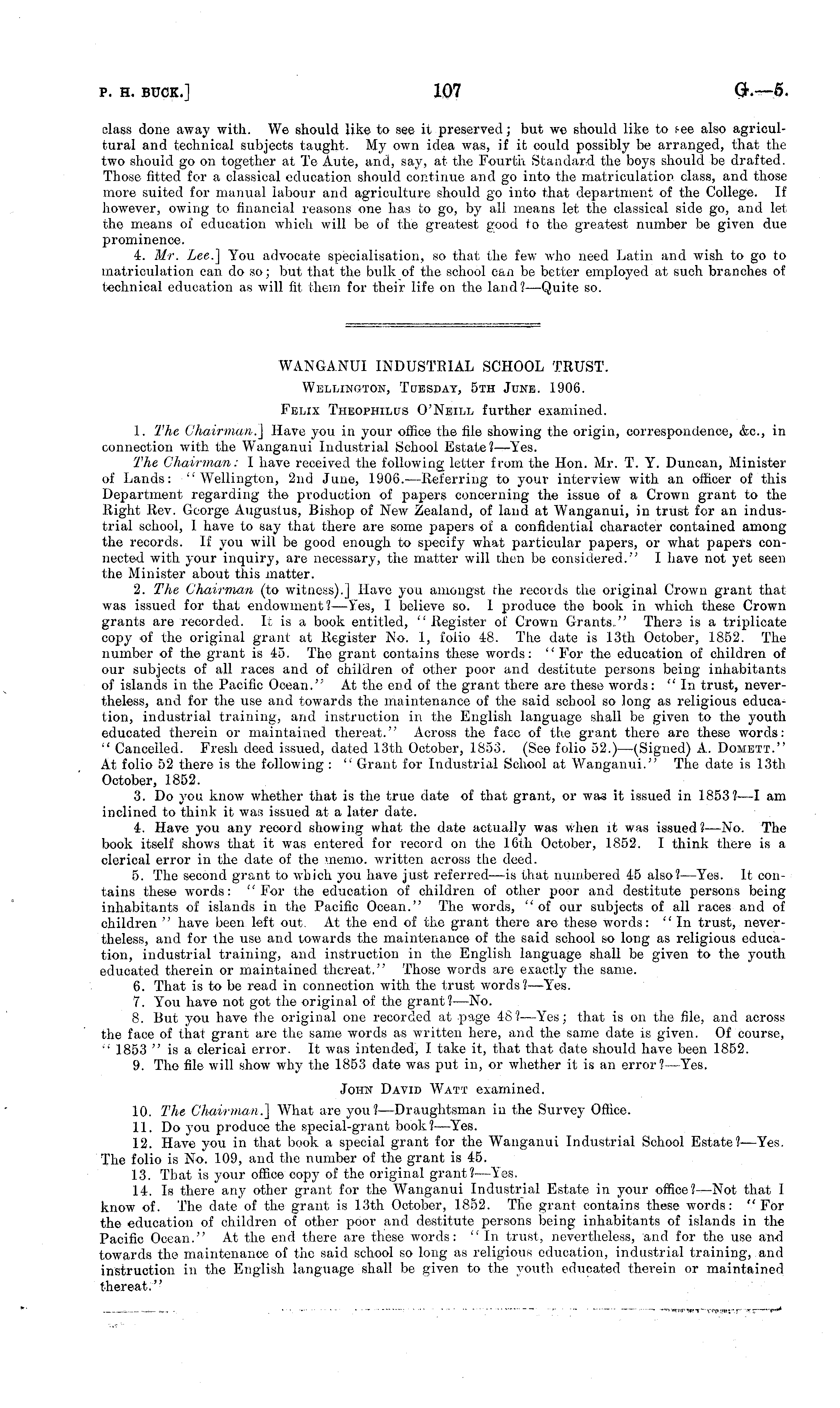 WANGANUI INDUSTRIAL SCHOOL TRUST. Wellington, Tuesday, sth June. 1906. Felix Theophilus O'Neill further examined. 1. The Chairman.] Have you in your office the file showing the origin, correspondence, &c, in connection with the Wanganui Industrial School Estate?— Yes. The Chairman: I have received the following letter from the Hon. Mr. T. Y. Duncan, Minister of Lands: "Wellington, 2nd June, 1906.—Referring to your interview with an officer of this Department regarding the production of papers concerning the issue of a Crown grant to the Right Rev. George Augustus, Bishop of New Zealand, of land at Wanganui, in trust for an industrial school, I have to say that there are some papers of a confidential character contained among the records. If you will be good enough to specify what particular papers, or what papers connected with your inquiry, are necessary, the matter will then be considered." I have not yet seen the Minister about this matter. 2. The Chairman (to witness).] Have you amongst the records the original Crown grant that was issued for that endowment?— Yes, I believe so. 1 produce the book in which these Crown grants are recorded. It is a book entitled, "Register of Crown Grants," Thers is a triplicate copy of the original grant at Register No. 1, folio 48. The date is 13th October, 1852. The number of the grant is 45. The grant contains these words: "For the education of children of our subjects of all races and of children of other poor and destitute persons being inhabitants of islands in the Pacific Ocean." At the end of the grant there are these words: "In trust, nevertheless, and for the use and towards the maintenance of the said school so long as religious education, industrial training, and instruction in the English language shall be given to the youth educated therein or maintained thereat." Across the face of the grant there are these words: " Cancelled. Fresh deed issued, dated 13th October, 1853. (See folio 52.) —(Signed) A. Domett." At folio 52 there is the following : " Grant for Industrial School at Wanganui." The date is 13th October, 1852. 3. Do you know whether that is the true date of that grant, or was it issued in 1853?— I am inclined to think it was issued at a later date. 4. Have you any record showing what the date actually was when it was issued ?—No. The book itself shows that it was entered for record on the 16th October, 1852. I think there is a clerical error in the date of the memo, written across the deed. 5. The second grant to which you have just referred—is that numbered 45 also? —Yes. It contains these words: '' For the education of children of other poor and destitute persons being inhabitants of islands in the Pacific Ocean." The words, "of our subjects of all races and of children " have been left out. At the end of the grant there are these words: "In trust, nevertheless, and for the use and towards the maintenance of the said school so long as religious education, industrial training, and instruction in the English language shall be given to the youth educated therein or maintained, thereat." Those words are exactly the same. 6. That is to be read in connection with the trust words?—Y'es. 7. You have not got the original of the grant?— No. 8. But you have the original one recorded at page 48?— Yes; that is on the file, and across the face of that grant are the same words as written here, and the same date is given. Of course, " 1853 "is a clerical error. It was intended, I take it, that that date should have been 1852. 9. The file will show why the 1853 date was put in, or whether it is an error?— Yes. John David Watt examined. 10. The Chairman.] What are you? —Draughtsman in the Survey Office. 11. Do you produce the special-grant book?— Yes. 12. Have you in that book a special grant for the Wanganui Industrial School Estate?— Yes. The folio is No. 109, and the number of the grant is 45. 13. That is your office copy of the original grant?— Yes. 14. Is there any other grant for the Wanganui Industrial Estate in your office?— Not that I know of. The date of the grant is 13th October, 1852. The grant contains these words: "For the education of children of other poor and destitute persons being inhabitants of islands in the Pacific Ocean." At the end there are these words: "In trust, nevertheless, and for the use and towards the maintenance of the said school so long as religious education, industrial training, and instruction in the English language shall be given to the youth educated therein or maintained thereat."