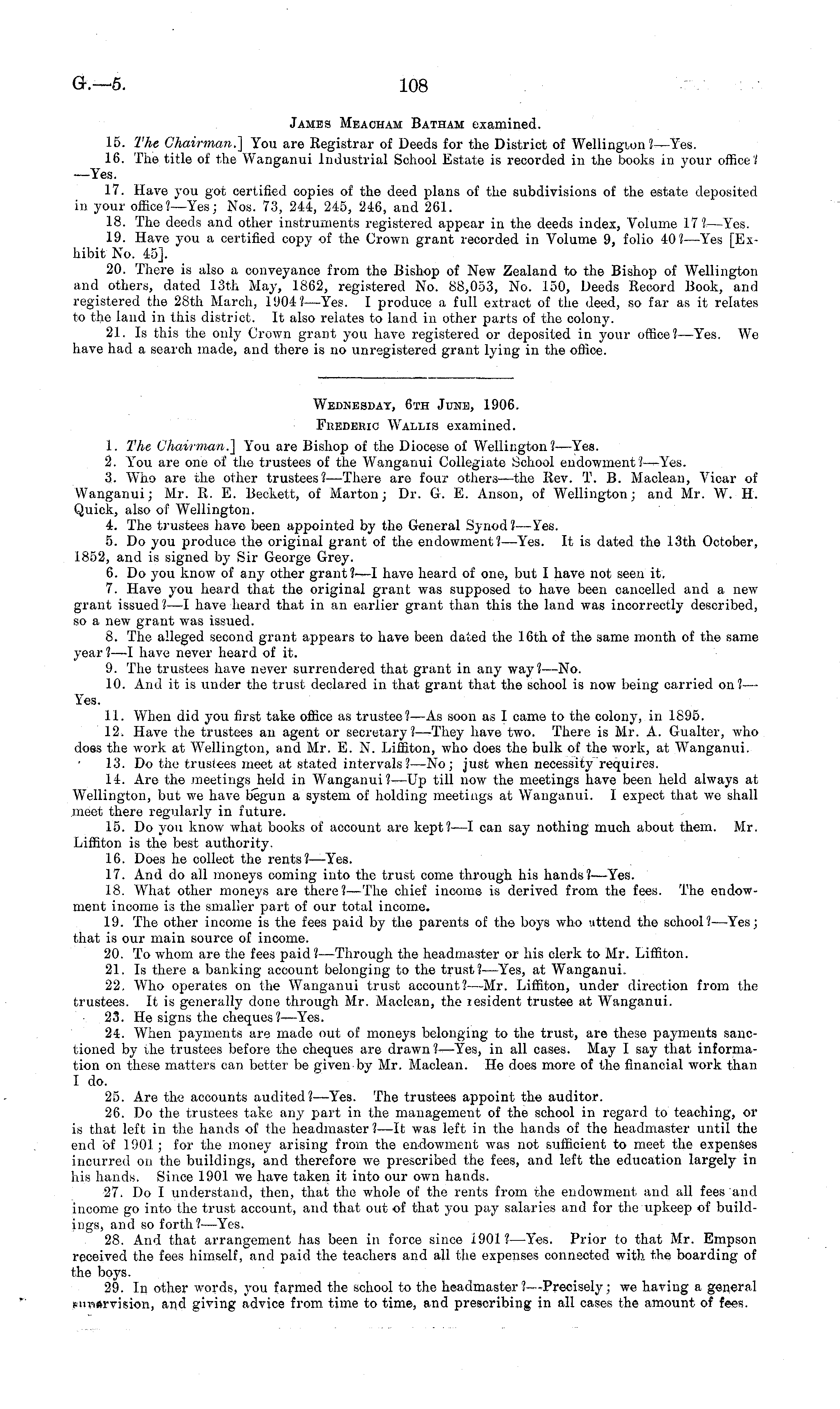 Wednesday, 6th June, 1906. Frederic Wallis examined. 1. The Chairman.] You are Bishop of the Diocese of Wellington?— Yes. 2. You are one of the trustees of the Wanganui Collegiate School endowment?— Yes. 3. Who are the other trustees? —There are four others —the Rev. T. B. Maclean, Vicar of Wanganui; Mr. R. E. Beckett, of Marton; Dr. G. E. Anson, of Wellington; and Mr. W. H. Quick, also of Wellington. 4. The trustees have been appointed by the General Synod ?—Yes. 5. Do you produce the original grant of the endowment?— Yes. It is dated the 13th October, 1852, and is signed by Sir George Grey. 6. Do you know of any other grant?—l have heard of one, but I have not seen it. 7. Have you heard that the original grant was supposed to have been cancelled and a new grant issued? —I have heard that in an earlier grant than this the land was incorrectly described, so a new grant was issued. 8. The alleged second grant appears to have been dated the 16th of the same month of the same year ? —I have never heard of it. 9. The trustees have never surrendered that grant in any way?— No. 10. And it is under the trust declared in that grant that the school is now being carried on?— Yes. 11. When did you first take office as trustee? —As soon as I came to the colony, in 1895. 12. Have the trustees an agent or secretary?— They have two. There is Mr. A. Gualter, who does the work at AVellington, and Mr. E. N. Liffiton, who does the bulk of the work, at Wanganui. 13. Do the trustees meet at stated intervals?—No; just when necessity requires. 14. Are the meetings held in Wanganui?—Up till now the meetings have been held always at Wellington, but we have begun a system of holding meetings at Wanganui. I expect that we shall meet there regularly in future. 15. Do you know what books of account are kept?—l can say nothing much about them. Mr. Liffiton is the best authority, 16. Does he collect the rents?— Yes. 17. And do all moneys coming into the trust come through his hands?— Yes. 18. What other moneys are there?— The chief income is derived from the fees. The endowment income is the smaller part of our total income. 19. The other income is the fees paid by the parents of the boys who uttend the school?— Yes; that is our main source of income. 20. To whom are the fees paid?— Through the headmaster or his clerk to Mr. Liffiton. 21. Is there a banking account belonging to the trust?— Yes, at Wanganui. 22. Who operates on the Wanganui trust account?— Mr. Liffiton, under direction from the trustees. It is generally done through Mr. Maclean, the lesident trustee at Wanganui. 23. He signs the cheques ? —Yes. 24. When payments are made out of moneys belonging to the trust, are these payments sanctioned by the trustees before the cheques are drawn ?—Yes, in all cases. May I say that information on these matters can better be given by Mr. Maclean. He does more of the financial work than I do. 25. Are the accounts audited? —Yes. The trustees appoint the auditor. 26. Do the trustees take any part in the management of the school in regard to teaching, or is that left in the hands of the headmaster? —It was left in the hands of the headmaster until the end "of 1901.; for the money arising from the endowment was not sufficient to meet the expenses incurred on the buildings, and therefore we prescribed the fees, and left the education largely in his hands. Since 1901 we have taken it into our own hands. 27. Do I understand, then, that the whole of the rents from the endowment and all fees and income go into the trust account, and that out of that you pay salaries and for the upkeep of buildings, and so forth? —Yes. 28. And that arrangement has been in force since 1901?—Y'es. Prior to that Mr. Empson received the fees himself, and paid the teachers and all the expenses connected with, the boarding of the boys. 29. In other words, you farmed the school to the headmaster? —Precisely; we having a general i=iui«rvision, and giving advice from time to time, and prescribing in all cases the amount of fees.