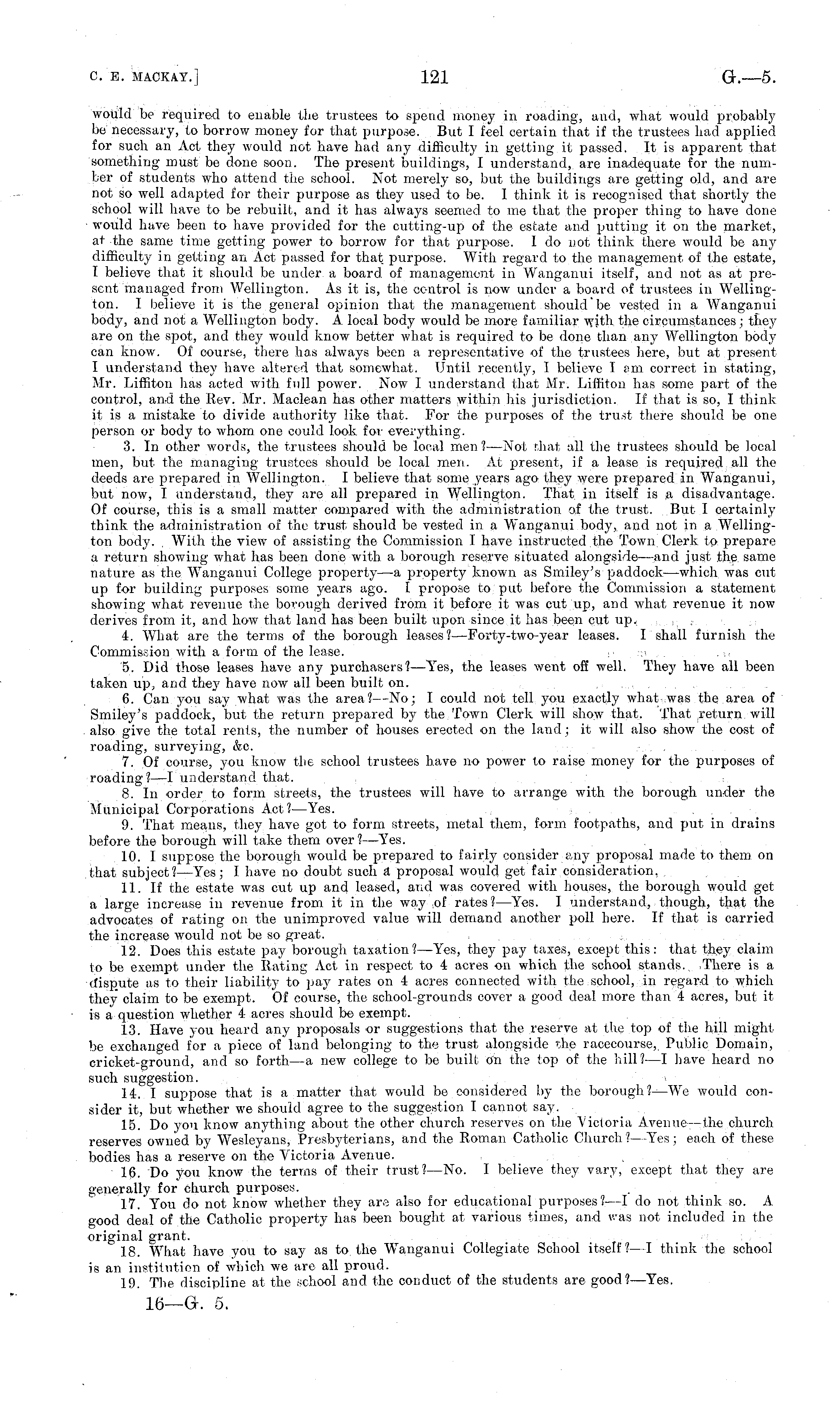 would be required to enable the trustees to spend money in roading, and, what would probably be necessary, to borrow money for that purpose. But I feel certain that if the trustees had applied for such an Act they would not have had any difficulty in getting it passed. It is apparent that something must be done soon. The present buildings, I understand, are inadequate for the number of students who attend the school. Not merely so, but the buildings are getting old, and are not so well adapted for their purpose as they used to be. I think it is recognised that shortly the school will have to be rebuilt, and it has always seemed to me that the proper thing to have done would have been to have provided for the cutting-up of the estate and putting it on the market, at the same time getting power to borrow for that purpose. 1 do not think there would be any difficulty in getting an Act passed for that, purpose. With regard to the management of the estate, I believe that it should be under a board, of management in Wanganui itself, and not as at present managed from Wellington. As it is, the control is now under a board of trustees in Wellington. I believe it is the general opinion that the management should be vested in a Wanganui body, and not a Wellington body. A local body would be more familiar with the circumstances; they are on the spot, and they would know better what is required to be done than any Wellington body can know. Of course, there has always been a representative of the trustees here, but at present I understand they have altered that somewhat. Until recently, I believe I am. correct in stating, Mr. Liffiton has acted with, full power. Now I understand that Mr. Liffiton has some part of the control, and the Rev. Mr. Maclean has other matters within his jurisdiction. If that is so, I think it is a mistake to divide authority like that. For the purposes of the trust there should be one person or body to whom one could look for everything. 3. In other words, the trustees should be local men?— Not that all the trustees should be local men, but the managing trustees should be local men. At present, if a lease is required all the deeds are prepared in Wellington. I believe that some years ago they were prepared in Wanganui, but now, I understand, they are all prepared in Wellington. That in itself is a disadvantage. Of course, this is a small matter compared with the administration of the trust. But I certainly think the administration of the trust should be vested in a Wanganui body, and not in a Wellington body. With the view of assisting the Commission I have instructed the Town Clerk to prepare a return showing what has been done with a borough, reserve situated alongside—and just the same nature as the Wanganui College property—a property known as Smiley's paddock—which was cut up for building purposes some years ago. I propose to put before the Commission a statement showing what revenue the borough derived from it before it was cut up, and what revenue it now derives from it, and how that land has been built upon since it has been cut up. 4. What are the terms of the borough leases?— Forty-two-year leases. I shall furnish the Commission with a form of the lease. 5. Did those leases have any purchasers?— Yes, the leases went off well. They have all been taken up, and they have now all been built on. 6. Can you say what was the area? —No; I could not tell you exactly what was the area of Smiley's paddock, but the return prepared by the Town Clerk will show that. That return will also give the total reni.s, the number of houses erected on the land; it will also show the cost of roading, surveying, &c. 7. Of course, you know the school trustees have no power to raise money for the purposes of roading?—l understand, that. 8. In order to form streets, the trustees will have to arrange with the borough under the Municipal Corporations Act? —Yes. 9. That means, they have got to form streets, metal them, form footpaths, and put in drains before the borough will take them over ?—Y'es. 10. I suppose the borough would be prepared to fairly consider any proposal made to them, on that subject?— Yes; I have no doubt such a proposal would get fair consideration. 11. If the estate was cut up and leased, and was covered with houses, the borough would get a large increase in revenue from it in the way of rates? —Yes. I understand, though, that the advocates of rating on the unimproved value will demand another poll here. If that is carried the increase would not be so great. 12. Does this estate pay borough taxation? —Yes, they pay taxes, except this: that they claim to be exempt under the Rating Act in respect to 4 acres on which the school stands. There is a dispute as to their liability to pay rates on 4 acres connected with the school, in regard to which they" claim to be exempt. Of course, the school-grounds cover a good deal more than 4 acres, but it is a question whether 4 acres should be exempt. 13. Have you heard any proposals or suggestions that the reserve at the top of the hill might be exchanged for a piece of land belonging to the trust alongside the racecourse,. Public Domain, cricket-ground, and so forth—a new college to be built on the top of the hill?—I have heard no such suggestion. 14. I suppose that is a matter that would be considered by the borough?—We would consider it, but whether we should agree to the suggestion I cannot say. 15. Do you know anything about the other church reserves on the Victoria Avenue—the church reserves owned by Wesleyans, Presbyterians, and the Roman Catholic Church ?—Yes; each of these bodies has a reserve on the Victoria Avenue. 16. Do you know the terms of their trust? —No. I believe they vary, except that they are generally for church purposes. 17. You do not know whether they are also for educational purposes?—l do not think so. A good deal of the Catholic property has been bought at various times, 
