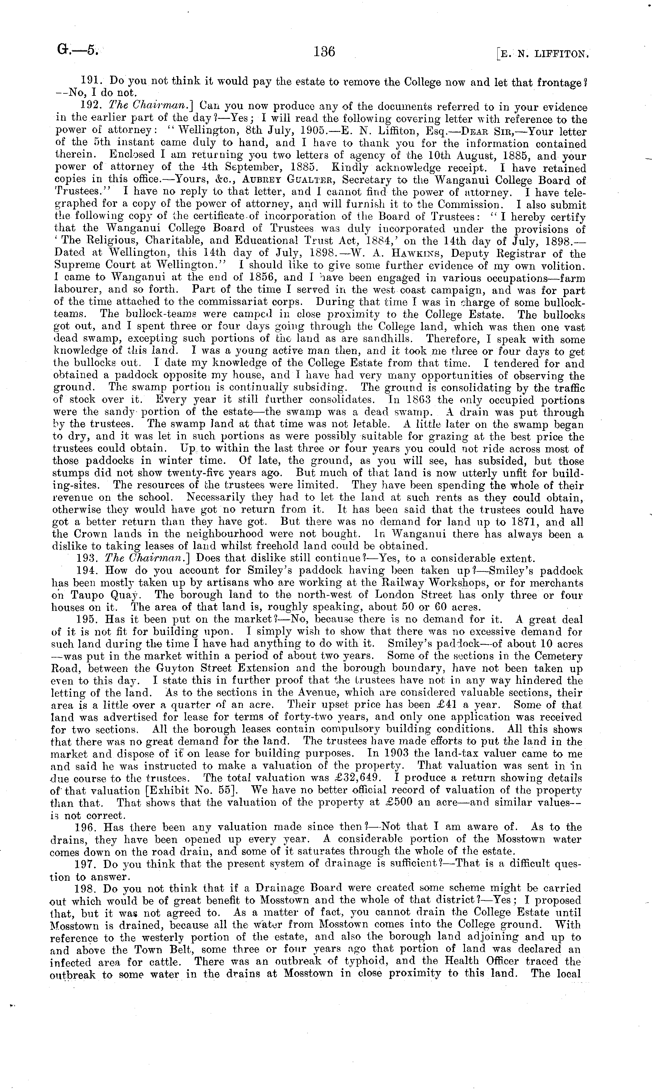 191. Do you not think it would pay the estate to remove the College now and let that frontage? —No, I do not. 192. The Chairman?] Can you now produce any of the documents referred to in your evidence in the earlier part of the day? —Yes; I will read the following covering letter with reference to the power of attorney: "Wellington, Bth July, 1905.— E. N. Liffiton, Esq.—Dear Sir, —Your letter of the sth instant came duly to hand, and I have to thank you for the information contained therein. Enclosed lam returning you two letters of agency of the 10th August, 1885, and your power of attorney of the 4th September, 1885. Kindly acknowledge receipt. I have retained copies in this office. —Yours, <fee, Aubrey Gualter, Secretary to the Wanganui College Board of Trustees." I have no reply to that letter, and I cannot find the power of attorney. I have telegraphed for a copy of the power of attorney, and will furnish it to the Commission. I also submit the following copy of the certificate of incorporation of the Board of Trustees: " I hereby certify that the Wanganui College Board of Trustees was duly incorporated under the provisions of ' The Religious, Charitable, and Educational Trust Act, 1884,' on the 14th day of July, 1898. — Dated at Wellington, this 14th day of July, 1898.— W. A. Hawkins, Deputy Registrar of the Supreme Court at Wellington." I should like to give some further evidence of my own volition. I came to Wanganui at the end of 1856, and I have been engaged in various occupations—farm labourer, and so forth. Part of the time I served in the west coast campaign, and was for part of the time attached to the commissariat corps. During that time I was in charge of some bullockteams. The bullock-teams were camped in close proximity to the College Estate. The bullocks got out, and I spent three or four days going through the College land, which was then one vast dead swamp, excepting such portions of the land as are sandhills. Therefore, I speak with some knowledge of this land. I was a young active man then, and it took me three or four days to get the bullocks out. I date my knowledge of the College Estate from that time. I tendered for and obtained a paddock opposite my house, and I have had very many opportunities of observing the ground. The swamp portion is continually subsiding. The ground is consolidating by the traffic of stock over it. Every year it still further consolidates. In 1863 the only occupied portions were the sandy portion of the estate —the swamp was a dead swamp. A drain was put through by the trustees. The swamp land at that time was not letable. A little later on the swamp began to dry, and it was let in such portions as were possibly suitable for grazing at the best price the trustees could obtain. Up. to within the last three or four years you could not ride across most of those paddocks in winter time. Of late, the ground, as you will see, has subsided, but those stumps did not show twenty-five years ago. But much of that land is now utterly unfit for build-ing-sites. The resources of the trustees were limited. They have been spending the whole of their revenue on the school. Necessarily they had to let the land at such, rents as they could obtain, otherwise they would have got no return from it. It has been said that the trustees could have got a better return than they have got. But there was no demand for land up to 1871, and all the Crown lands in the neighbourhood were not bought. In Wanganui there has always been a dislike to taking leases of land whilst freehold land could be obtained. 193. The Chairman.] Does that dislike still continue?— Yes, to a considerable extent. 194. How do you account for Smiley's paddock having been taken up?—Smiley's paddock has been mostly taken up by artisans who are working at the Railway Workshops, or for merchants on Taupo Quay. The borough land to the north-west of London Street has only three or four houses on it, The area of that land is, roughly speaking, about 50 or 60 acres. 195. Has it been put on the market?—No, because there is no demand for it. A great deal of it is not fit for building upon. I simply wish to show that there was no excessive demand for such land during the time I have had anything to do with it. Smiley's padlock—of about 10 acres —was put in the market within a period of about two years. Some of the sections in the Cemetery Road, between the Guyton Street Extension and the borough boundary, have not been taken up even to this day. I state this in further proof that the trustees have not in any way hindered the letting of the land. As to the sections in the Avenue, which are considered valuable sections, their area is a little over a quarter of an acre. Their upset price has been £41 a year. Some of thai land was advertised for lease for terms of forty-two years, and only one application was received for two sections. All the borough leases contain compulsory building conditions. All this shows that there was no great demand for the land. The trustees have made efforts to put the land in the market and dispose of it on lease for building purposes. In 1903 the land-tax valuer came to me and said he was instructed to make a valuation of the property. That valuation was sent in "in due course to the trustees. The total valuation was £32,649. I produce a return showing details of that valuation [Exhibit No. 55]. We have no better official record of valuation of the property than that. That shows that the valuation of the property at £500 an acre—and similar values— is not correct. 196. Has there been any valuation made since then? —Not that I am aware of. As to the drains, they have been opened up every year. A considerable portion of the Mosstown water comes down on the road drain, and some of it saturates through the whole of the estate. 197. Do you think that the present system of drainage is sufficient? —That is a difficult question to answer. 198. Do