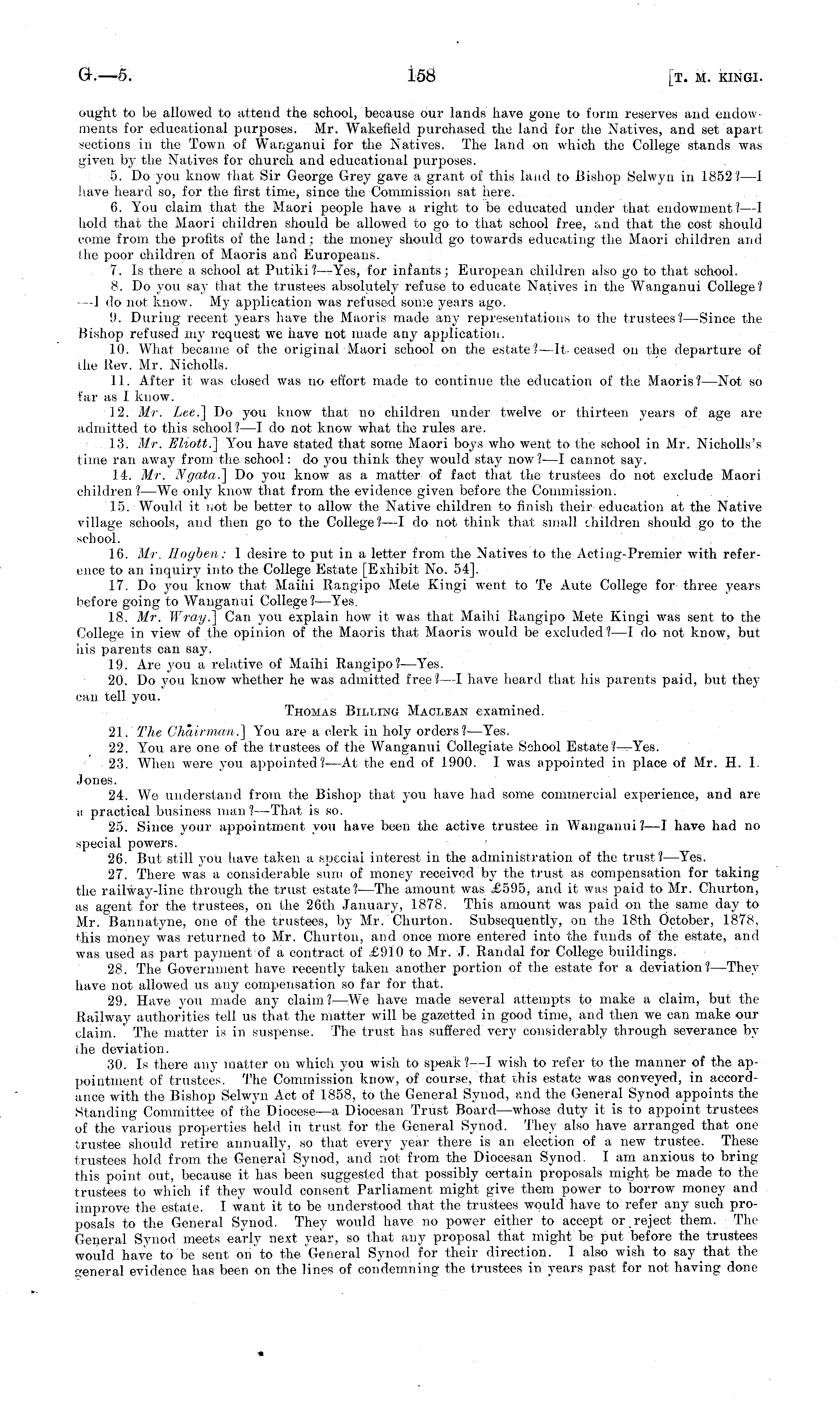 ought to be allowed to attend the school, because our lands have gone to form reserves and endowments for educational purposes. Mr. Wakefield purchased the land for the Natives, and set apart sections in the Town of Wanganui for the Natives. The land on which the College stands was given by the Natives for church and educational purposes. 5. Do you know that Sir George Grey gave a grant of this land to Bishop Selwyn in 1852?— I have heard so, for the first time, since the Commission sat here. 6. You claim that the Maori people have a right to be educated under that endowment? —I hold that the Maori children should be allowed to go to that school free, and that the cost should come from the profits of the land; the money should go towards educating the Maori children and the poor children of Maoris and Europeans. 7. Is there a school at Putiki?—Yes, for infants; European children also go to that school. 8. Do you say that the trustees absolutely refuse to educate Natives in the Wanganui College? -—1 do not know. My application was refused some years ago. 9. During recent years have the Maoris made any representations to the trustees?— Since the Bishop refused my request we have not made any application. 10. What became of the original Maori school on the estate?—lt-ceased on the departure of (lie Rev. Mr. Nicholls. 11. After it was closed was no effort made to continue the education of the Maoris?— Not so far as I know. 12. Mr. Lee.] Do you know that no children under twelve or thirteen years of age are admitted to this school?—I do not know what the rules are. 13. Mr. Eliott.] You have stated that some Maori boys who went to the school in Mr. Nicholls's time ran away from the school: do you think they would stay now?—l cannot say. 14. Mr. Ngata.] Do you know as a matter of fact that the trustees do not exclude Maori children? —We only know that from the evidence given before the Commission. 15. Would it not be better to allow the Native children to finish their education at the Native village schools, and then go to the College?—l do not think that small children should go to the school. 16. Mr. Hogben: I desire to put in a letter from the Natives to the Acting-Premier with reference to an-inquiry into the College Estate [Exhibit No. 54]. 17. Do you know that Maihi Rangipo Mete Kingi went to Te Aute College for three years before going to Wanganui College? —Yes. 18. Mr. Wray.] Can you explain how it was that Maihi Rangipo Mete Kingi was sent to the College in view of the opinion of the Maoris that Maoris would be excluded?—l do not know, but his parents can say. 19. Are you a relative of Maihi Rangipo?—Yes. 20. Do you know whether he was admitted free? —I have heard that his parents paid, but they can tell you. Thomas Billing Maclean examined. 21. The Chairman.] You are a olerk in holy orders? —Yes. 22. You are one of the trustees of the Wanganui Collegiate School Estate?— Yes. 23. When were you appointed?—At the end of 1900. I. was appointed in place of Mr. H. I. Jones. 24. We understand from the Bishop that you have had some commercial experience, and are a practical business man ?—That is so. 25. Since your appointment you have been the active trustee in Wanganui?—l have had no special powers. 26. But still you have taken a special interest in the administration of the trust?— Yes. 27. There was a considerable sum of money received by the trust as compensation for taking the railway-line through the trust estate? —The amount was £595, and it was paid to Mr. Churton, as agent for the trustees, on the 26th January, 1878. This amount was paid on the same day to Mr. Bannatyne, one of the trustees, by Mr. Churton. Subsequently, on the 18th October, 1878, this money was returned to Mr. Churton, and once more entered into the funds of the estate, and was used as part payment of a contract of £910 to Mr. J. Randal for College buildings. 28. The Government have recently taken another portion of the estate for a deviation? —They have not allowed us any compensation so far for that. 29. Have you made any claim?—We have made several attempts to make a claim, but the Railway authorities tell us that the matter will be gazetted in good time, and then we can make our claim. The matter is in suspense. The trust has suffered very considerably through severance by fhe deviation. 30. Is there any matter on whicii you wish to speak?—l wish to refer to the manner of the appointment of trustees. The Commission know, of course, that this estate was conveyed, in accordance with the Bishop Selwyn Act of 1858, to the General Synod, and the General Synod appoints the Standing Committee of the Diocese —a Diocesan Trust Board —whose duty it is to appoint trustees of the various properties held in trust for the General Synod. They also have arranged that one trustee should retire annually, so that every year there is an election of a new trustee. These trustees hold from the General Synod, and not from the Diocesan Synod. lam anxious to bring this point out, because it has been suggested that possibly certain proposals might be made to the trustees to which if they would consent Parliament might give them power to borrow money and improve the estate. I want it to be understood that the trustees would have to refer any such proposals to the General Synod, They would have no power either to accept or reject them. The General Synod meets early next year, so that any proposal that might be put before the trustees would have to be sent on to the General Synod for their direction. I also wish to say that the general evidence has been on the lines of condemning the trustees in years past for not having done