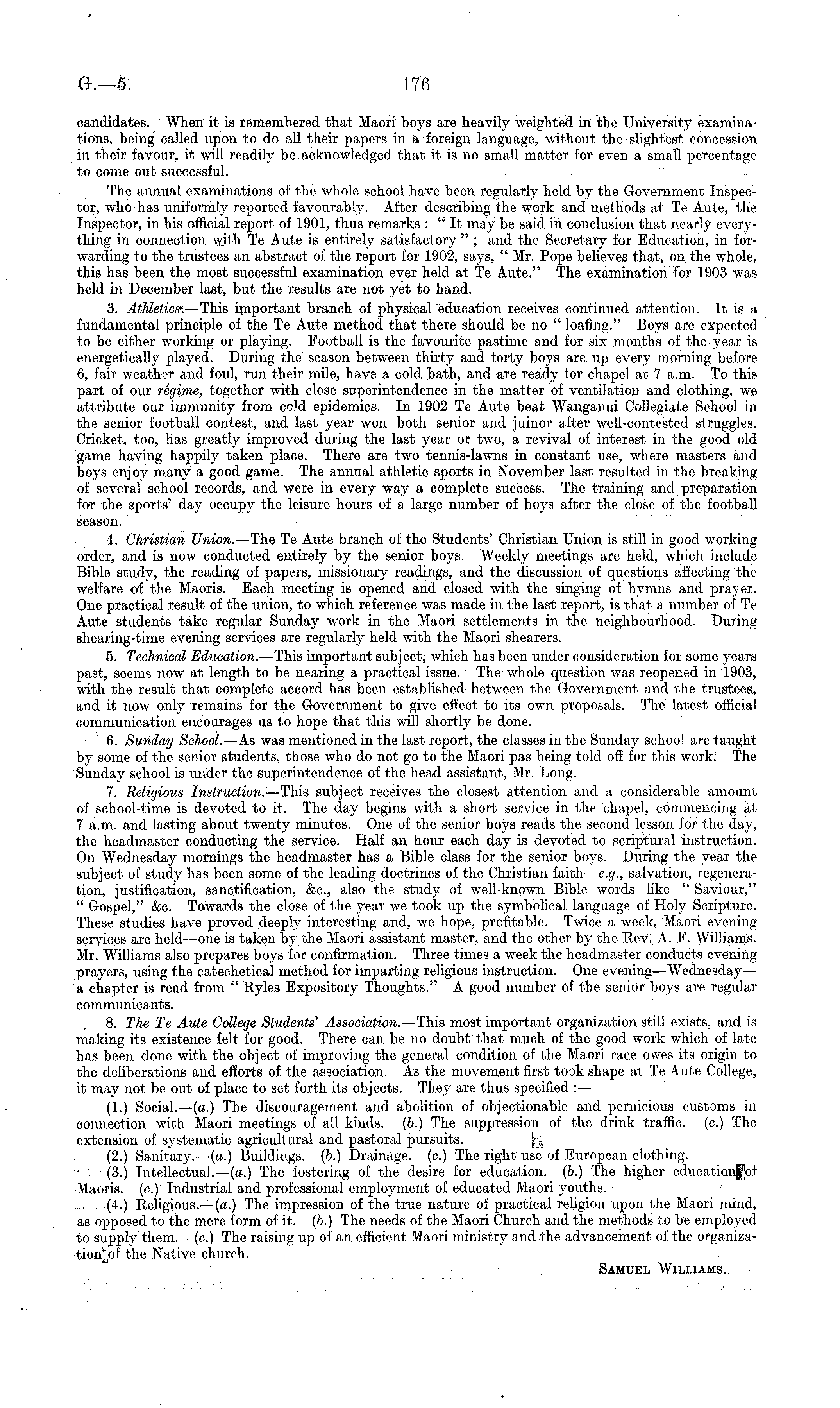 candidates. When it is remembered that Maori boys are heavily weighted in the University examinations, being called upon to do all their papers in a foreign language, without the slightest concession in their favour, it will readily be acknowledged that it is no small matter for even a small percentage to come out successful. The annual examinations of the whole school have been regularly held by the Government Inspector, who has uniformly reported favourably. After describing the work and methods at Te Aute, the Inspector, in his official report of 1901, thus remarks : " It may be said in conclusion that nearly everything in connection with Te Aute is entirely satisfactory " ; and the Secretary for Education, in forwarding to the trustees an abstract of the report for 1902, says, " Mr. Pope believes that, on the whole, this has been the most successful examination ever held at Te Aute." The examination for 1903 was held in December last, but the results are not yet to hand. 3. Athletics.— This important branch of physical education receives continued attention. It is a fundamental principle of the Te Aute method that there should be no " loafing." Boys are expected to be either working or playing. Football is the favourite pastime and for six months of the year is energetically played. During the season between thirty and forty boys are up every morning before 6, fair weather and foul, run their mile, have a cold bath, and are ready tor chapel at 7 a.m. To this part of our regime, together with close superintendence in the matter of ventilation and clothing, we attribute our immunity from cold epidemics. In 1902 Te Aute beat Wanganui Collegiate School in the senior football contest, and last year won both senior and juinor after well-contested struggles. Cricket, too, has greatly improved during the last year or two, a revival of interest in the good old game having happily taken place. There are two tennis-lawns in constant use, where masters and boys enjoy many a good game. The annual athletic sports in November last resulted, in the breaking of several school records, and were in every way a complete success. The training and preparation for the sports' day occupy the leisure hours of a large number of boys after the close of the football season. 4. Christian Union. —The Te Aute branch of the Students' Christian Union is still in good working order, and is now conducted entirely by the senior boys. Weekly meetings are held, which include Bible study, the reading of papers, missionary readings, and the discussion of questions affecting the welfare of the Maoris. Each meeting is opened and closed with the singing of hymns and prayer. One practical result of the union, to which reference was made in the last report, is that a number of Te Aute students take regular Sunday work in the Maori settlements in the neighbourhood. Duiing shearing-time evening services are regularly held with the Maori shearers. 5. Technical Education. —This important subject, which has been under consideration for some years past, seems now at length to be nearing a practical issue. The whole question was reopened in 1903, with the result that complete accord has been established between the Government and the trustees, and it now only remains for the Government to give effect to its own proposals. The latest official communication encourages us to hope that this will shortly be done. 6. Sunday School. —As was mentioned in the last report, the classes in the Sunday school are taught by some of the senior students, those who do not go to the Maori pas being told off for this work. The Sunday school is under the superintendence of the head assistant, Mr. Long. 7. Religious Instruction.- —This subject receives the closest attention and a considerable amount of school-time is devoted to it. The day begins with a short service in the chapel, commencing at 7 a.m. and lasting about twenty minutes. One of the senior boys reads the second lesson for the day, the headmaster conducting the service. Half an hour each day is devoted to scriptural instruction. On Wednesday mornings the headmaster has a Bible class for the senior boys. During the year the subject of study has been some of the leading doctrines of the Christian faith— e.g., salvation, regeneration, justification, sanctification, &c, also the study of well-known Bible words like " Saviour," " Gospel," &c. Towards the close of the year we took up the symbolical language of Holy Scripture. These studies have proved deeply interesting and, we hope, profitable. Twice a week, Maori evening services are held —one is taken by the Maori assistant master, and the other by the Rev. A. F. Williams. Mr. Williams also prepares boys for confirmation. Three times a week the headmaster conducts evening prayers, using the catechetical method for imparting religious instruction. One evening—Wednesday— a chapter is read from " Ryles Expository Thoughts." A good number of the senior boys are regular communicants. 8. The Te Aute College Students' Association. —This most important organization still exists, and is making its existence felt for good. There can be no doubt that much of the good work which of late has been done with the object of improving the general condition of the Maori race owes its origin to the deliberations and efforts of the association. As the movement first took shape at Te Aute College, it may not be out of place to set forth its objects. They are thus specified : — (1.) Social. — (a.) The discouragement and abolition of objectionable and pernicious customs in connection with Maori meetings of all kinds, (b.) The suppression of the drink traffic, (c.) The extension of systematic agricultural and pastoral pursuits. ||.j (2.) Sanitary.— (a.) Buildings. (6.) Drainage, (c.) The right use of European clothing. (3.) Intellectual. —(a.) The fostering of the desire for education. (6.) The higher education|'of Maoris, (c.) Industrial and 