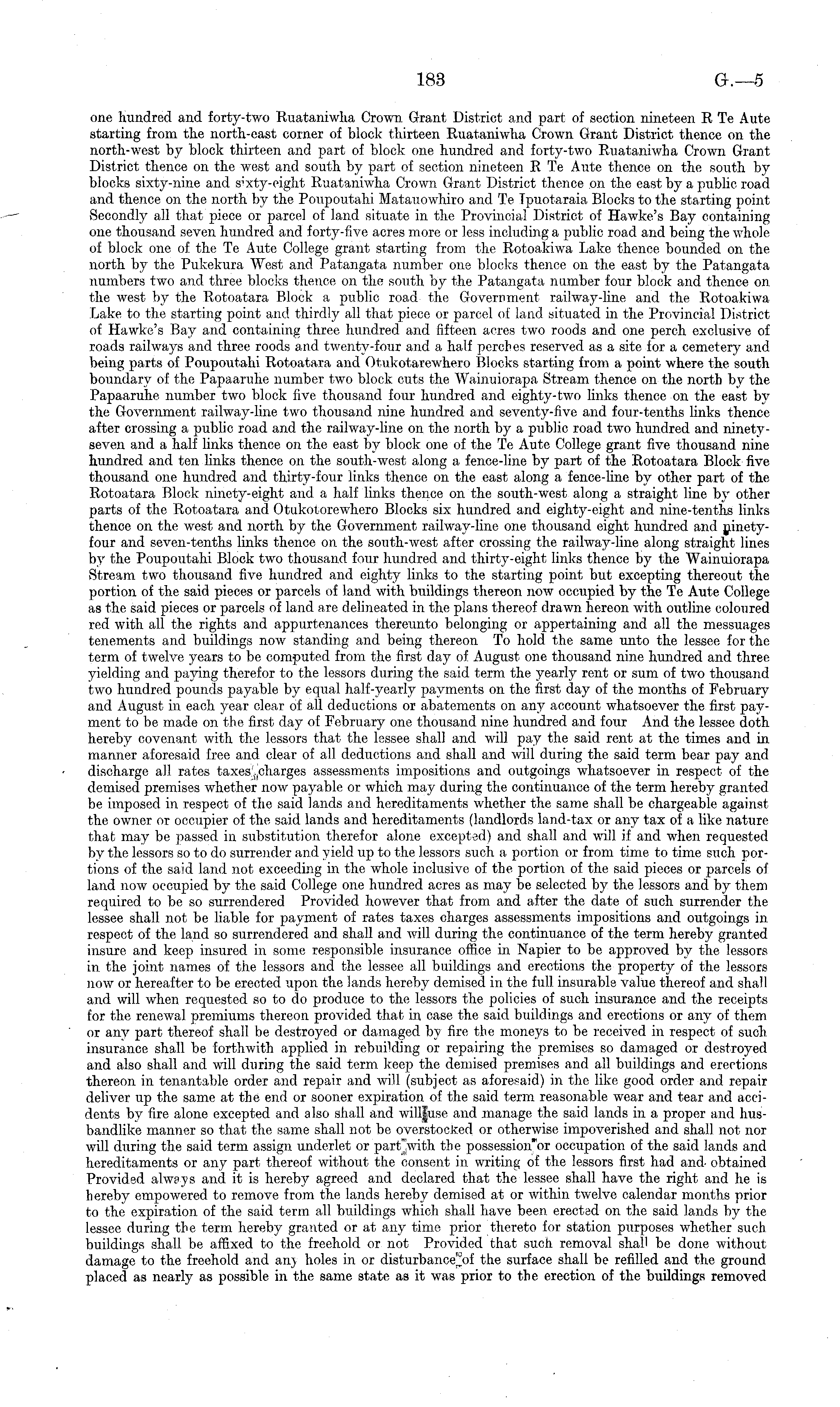 one hundred and forty-two Ruataniwha Crown G-rant District and part of section nineteen E Te Aute starting from the north-east corner of block thirteen Ruataniwha Crown Grant District thence on the north-west by block thirteen and part of block one hundred and forty-two Euataniwha Crown Grant District thence on the west and south by part of section nineteen R Te Aute thence on the south by blocks sixty-nine and s'xty-eight Euataniwha Crown Grant District thence on the east by a public road and thence on the north by the Poupoutahi Matauowhiro and Te Tpuotaraia Blocks to the starting point Secondly all that piece or parcel of land situate in the Provincial District of Hawke's Bay containing one thousand seven hundred and forty-five acres more or less including a public road and being the whole of block one of the Te Aute College grant starting from the Rotoakiwa Lake thence bounded on the north by the Pukekura West and Patangata number one blocks thence on the east by the Patangata numbers two and three block's thence on the south by the Patangata number four block and thence on the west by the Rotoatara Block a public road the Government railway-line and the Rotoakiwa Lake to the starting point and thirdly all that piece or parcel of land situated in the Provincial District of Hawke's Bay and containing three, hundred and fifteen acres two roods and one perch exclusive of roads railways and three roods and twenty-four and a half perches reserved as a site for a cemetery and being parts of Poupoutahi Rotoatara and Otukotarewhero Blocks starting from a point where the south boundary of the Papaaruhe number two block cuts the Wainuiorapa Stream thence on the north by the Papaaruhe number two block five thousand four hundred and eighty-two links thence on the east by the Government railway-line two thousand nine hundred and seventy-five and four-tenths links thence after crossing a public road and the railway-line on the north by a public road two hundred and ninetyseven and a half links thence on the east by block one of the Te Aute College grant five thousand nine hundred and ten links thence on the south-west along a fence-line by part of the Rotoatara Block five thousand one hundred and thirty-four links thence on the east along a fence-line by other part of the Rotoatara Block ninety-eight and a half links thence on the south-west along a straight line by other parts of the Rotoatara and Otukotorewhero Blocks six hundred and eighty-eight and nine-tenths links thence on the west and north by the Government railway-line one thousand eight hundred and ninetyfour and seven-tenths links thence on the south-west after crossing the railway-line along straight lines by the Poupoutahi Block two thousand four hundred and thirty-eight links thence by the Wainuiorapa Stream two thousand five hundred and eighty links to the starting point but excepting thereout the portion of the said pieces or parcels of land with buildings thereon now occupied by the Te Aute College as the said pieces or parcels of land are delineated in the plans thereof drawn hereon with outline coloured red with all the rights and appurtenances thereunto belonging or appertaining and all the messuages tenements and buildings now standing and being thereon To hold the same unto the lessee for the term of twelve years to be computed from the first day of August one thousand nine hundred and three yielding and paying therefor to the lessors during the said term the yearly rent or sum of two thousand two hundred pounds payable by equal half-yearly payments on the first day of the months of February and August in each year clear of all deductions or abatements on an}* account whatsoever the first payment to be made on the first day of February one thousand nine hundred and four And the lessee doth hereby covenant with the lessors that the lessee shall and will pay the said rent at the times and in manner aforesaid free and clear of all deductions and shall and will during the said term bear pay and discharge all rates taxes ..charges assessments impositions and outgoings whatsoever in respect of the demised premises whether now payable or which may during the continuance of the term hereby granted be imposed in respect of the said lands and hereditaments whether the same shall be chargeable against the owner or occupier of the said lands and hereditaments (landlords land-tax or any tax of a like nature that may be passed in substitution therefor alone excepted) and shall and will if and when requested by the lessors so to do surrender and yield up to the lessors such a portion or from time to time such portions of the said land not exceeding in the whole inclusive of the portion of the said pieces or parcels of land now occupied by the said College one hundred acres as may be selected by the lessors and by them required to be so surrendered Provided however that from and after the date of such surrender the lessee shall not be liable for payment of rates taxes charges assessments impositions and outgoings in respect of the land so surrendered and shall and will during the continuance of the term hereby granted insure and keep insured in some responsible insurance office in Napier to be approved by the lessors in the joint names of the lessors and the lessee all buildings and erections the property of the lessors now or hereafter to be erected upon the lands hereby demised in the full insurable value thereof and shall and will when requested so to do produce to the lessors the policies of such insurance and the receipts for the renewal premiums thereon provided that in case the said buildings and erections or any of them or any part thereof shall be destroyed or damaged by fire the moneys to be received in respect of sucli insurance shall be forthwith applied in rebuilding or repairing the premises so damaged or destroyed and also shall and will during the said term keep the demised premises and all buildings and erections thereon in