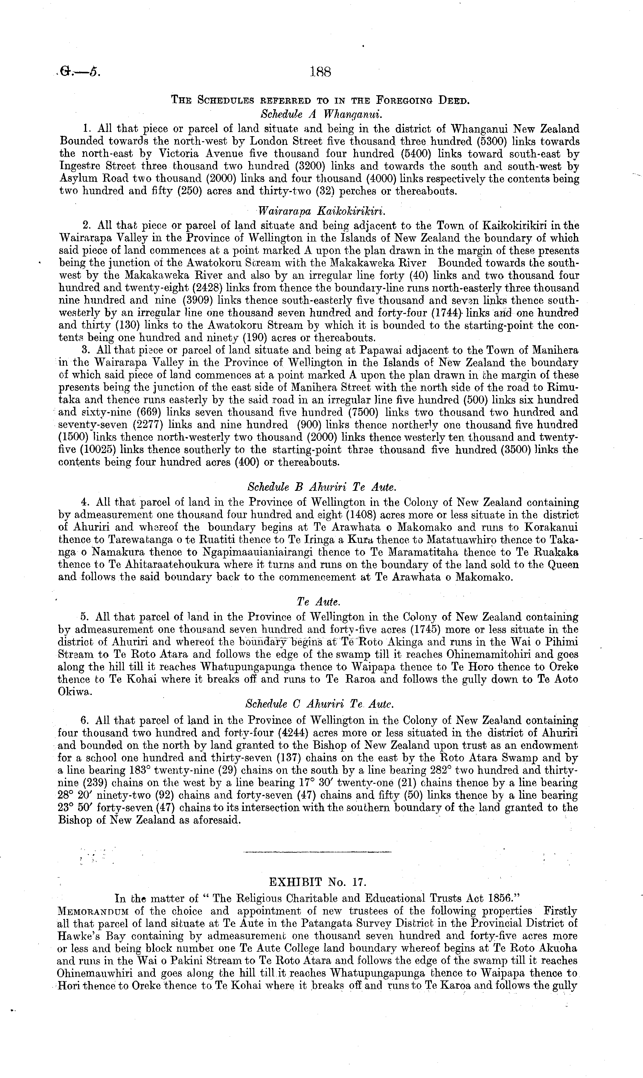 EXHIBIT No. 17. In the matter of " The Religious Charitable and Educational Trusts Act 1856." Memorandum of the choice and appointment of new trustees of the following properties Firstlyall that parcel of land situate at Te Aute in the Patangata Survey District in the Provincial District of Hawke's Bay containing by admeasurement one thousand seven hundred and forty-five acres more or less and being block numbei one Te Aute College land boundary whereof begins at Te Roto Akuoha and runs in the Wai o Pakini Stream to Te Roto Atara and follows the edge of the swamp till it reaches Ohinemauwhiri and goes along the hill till it reaches Whatupungapunga thence to Waipapa thence to Hori. thence to Oreke thence, to Te Kohai where it breaks off and runs to Te Karoa and follows the gully