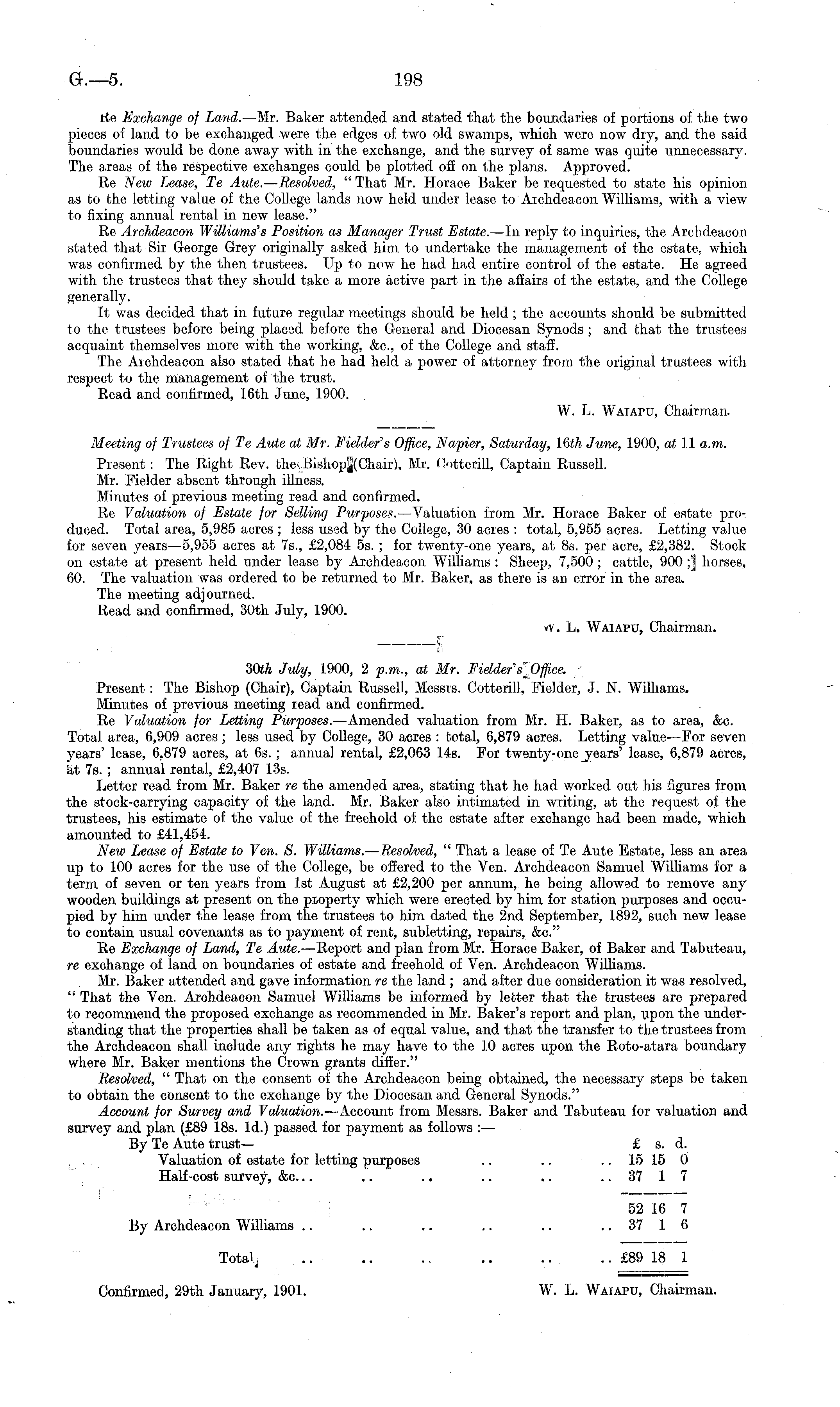 tie Exchange of Land. —Mr. Baker attended and stated that the boundaries of portions of the two pieces of land to be exchanged were the edges of two old swamps, which were now dry, and the said boundaries would be done away with in the exchange, and the survey of same was quite unnecessary. The areas of the respective exchanges could be plotted off on the plans. Approved. Re New Lease, Te Aute. — Resolved, " That Mr. Horace Baker be requested to state his opinion as to the letting value of the College lands now held under lease to Archdeacon Williams, with a view to fixing annual rental in new lease." Re Archdeacon Williams's Position as Manager Trust Estate. —ln reply to inquiries, the Archdeacon stated that Sir George Grey originally asked him to undertake the management of the estate, which was confirmed by the then trustees. Up to now he had had entire control of the estate. He agreed with the trustees that they should take a more active part in the affairs of the estate, and the College generally. It was decided that in future regular meetings should be held ; the accounts should be submitted to the trustees before being placed before the General and Diocesan Synods ; and that the trustees acquaint themselves more with the working, &c, of the College and staff. The Archdeacon also stated that he had held a power of attorney from the original trustees with respect to the management of the trust. Read and confirmed, 16th June, 1900. W. L. Watapu, Chairman,