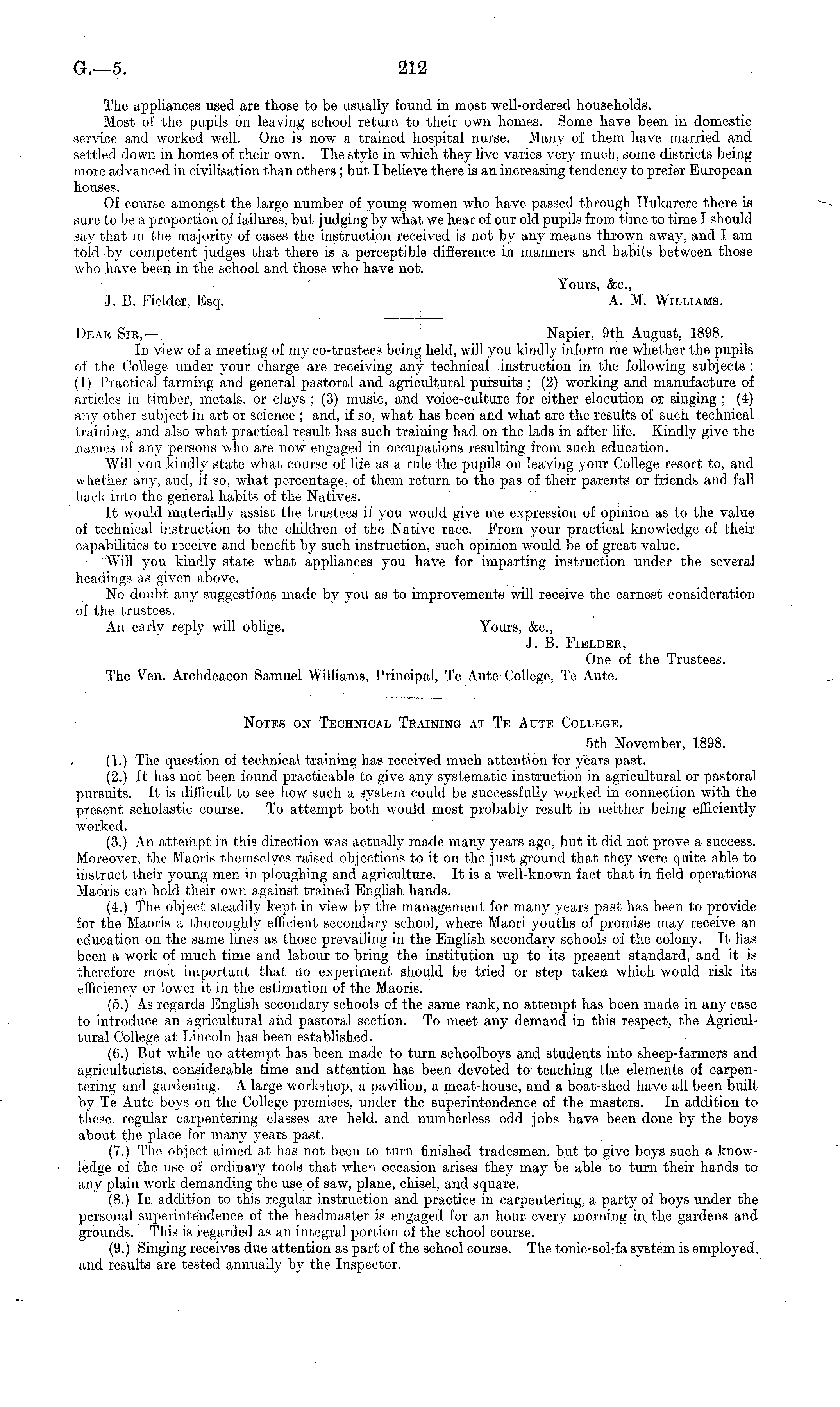 Dear Sir,— Napier, 9th August, 1898. In view of a meeting of my co-trustees being held, will you kindly inform me whether the pupils of the College under your charge are receiving any technical instruction in the following subjects : (1) Practical farming and general pastoral and agricultural pursuits ; (2) working and manufacture of articles in timber, metals, or clays ; (3) music, and voice-culture for either elocution or singing ; (4) any other subject in art or science ; and, if so, what has been and what are the results of such technical training, and also what practical result has such training had on the lads in after life. Kindly give the names of any persons who are now engaged in occupations resulting from such education. Will you kindly state what course of life as a rule the pupils on leaving your College resort to, and whether any, and, if so, what percentage, of them return to the pas of their parents or friends and fall back into the general habits of the Natives. It would materially assist the trustees if you would give me expression of opinion as to the value of technical instruction to the children of the Native race. From your practical knowledge of their capabilities to rsceive and benefit by such instruction, such opinion would be of great value. Will you kindly state what appliances you have for imparting instruction under the several headings as given above. No doubt any suggestions made by you as to improvements will receive the earnest consideration of the trustees. An early reply will oblige. Yours, &c, J. B. Fielder, One of the Trustees. The Yen. Archdeacon Samuel Williams, Principal, Te Aute College, Te Aute.