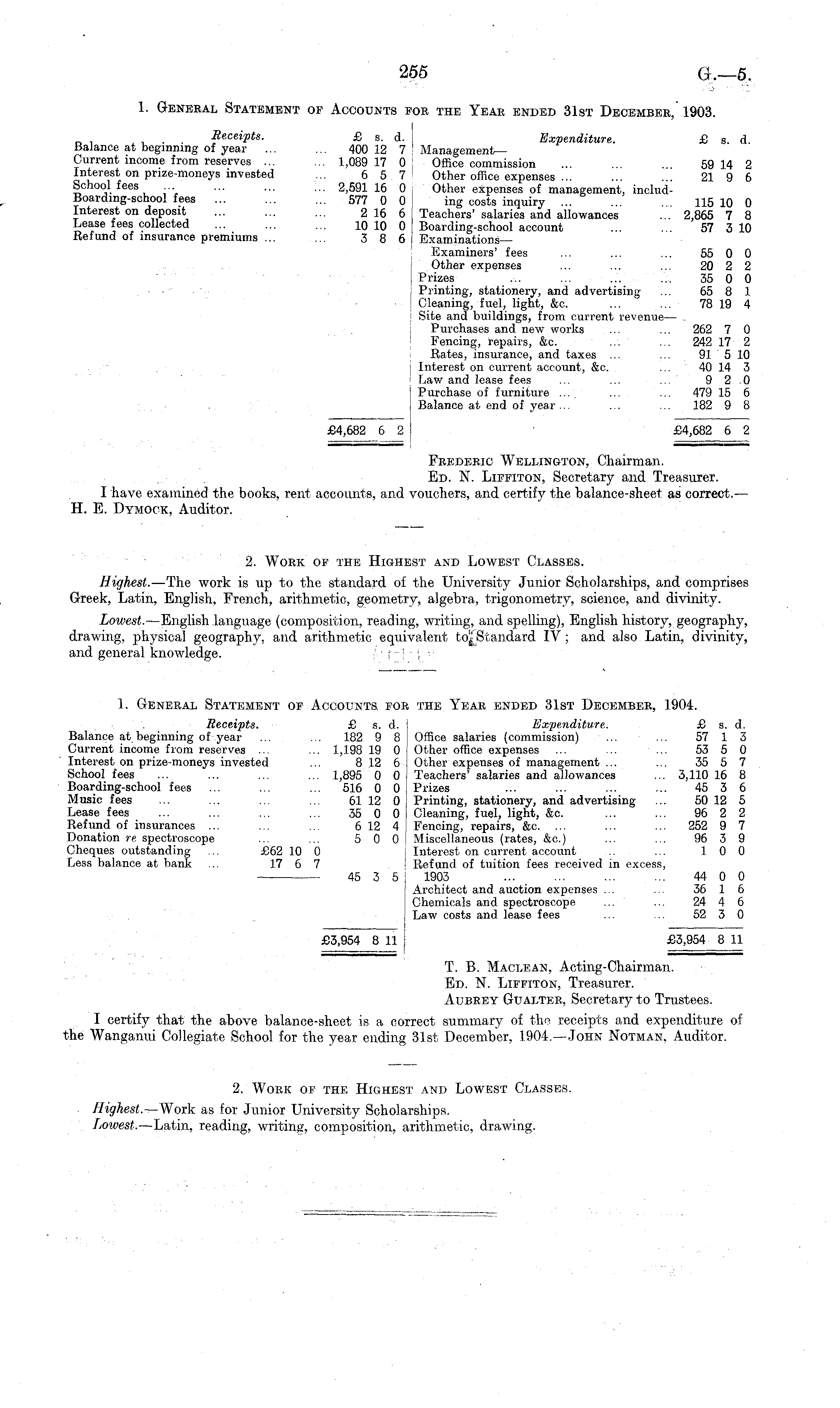 1. General Statement of Accounts, for the Year ended 31st December, 1904. Receipts. £ s. d. Expenditure. £ s. d. Balance at beginning of year ... ... 182 9 8 Office salaries (commission) ... ... 57 1 3 Current income from reserves ... ... 1,198 19 0 Other office expenses ... ... ... 53 5 0 Interest on prize-moneys invested ... 8 12 6 Other expenses of management ... ... 35 5 7 School fees ... ... ... ... 1,895 0 0 Teachers' salaries and allowances ... 3,110 16 8 Boarding-school fees ... ... ... 516 0 0 Prizes ... ... ... ... 45 3 6 Music fees ... ... ... ... 61 12 0 Printing, stationery, and advertising ... 50 12 5 Lease fees ... ... ... ... 35 0 0 Cleaning, fuel, light, &c. ... ... 96 2 2 Refund of insurances ... ... ... 612 4 Fencing, repairs, &c. ... ... ... 252 9 7 Donation re spectroscope ... ... 5 0 0 Miscellaneous (rates, &c.) ... ... 96 3 9 Cheques outstanding ... £62 10 0 ; Interest on current account .. ... 10 0 Less balance at bank ... 17 6 7 ! Refund of tuition fees received in excess, 45 3 5 ! 1903 ... _ 44 0 0 I Architect and auction expenses ... ... 36 1 6 Chemicals and spectroscope ... ... 24 4 6 . .. Law costs and lease fees ... ... 52 3 0 £3,954 8 11 £3,954 8 11 T. B. Maclean, Acting-Chairman. Ed. N. Liffiton, Treasurer. Aubrey Gualter, Secretary to Trustees. I certify that the above balance-sheet is a correct summary of the receipts and expenditure of the Wanganui Collegiate School for the year ending 31st December, 1.904.—J0hn Notman. Auditor.