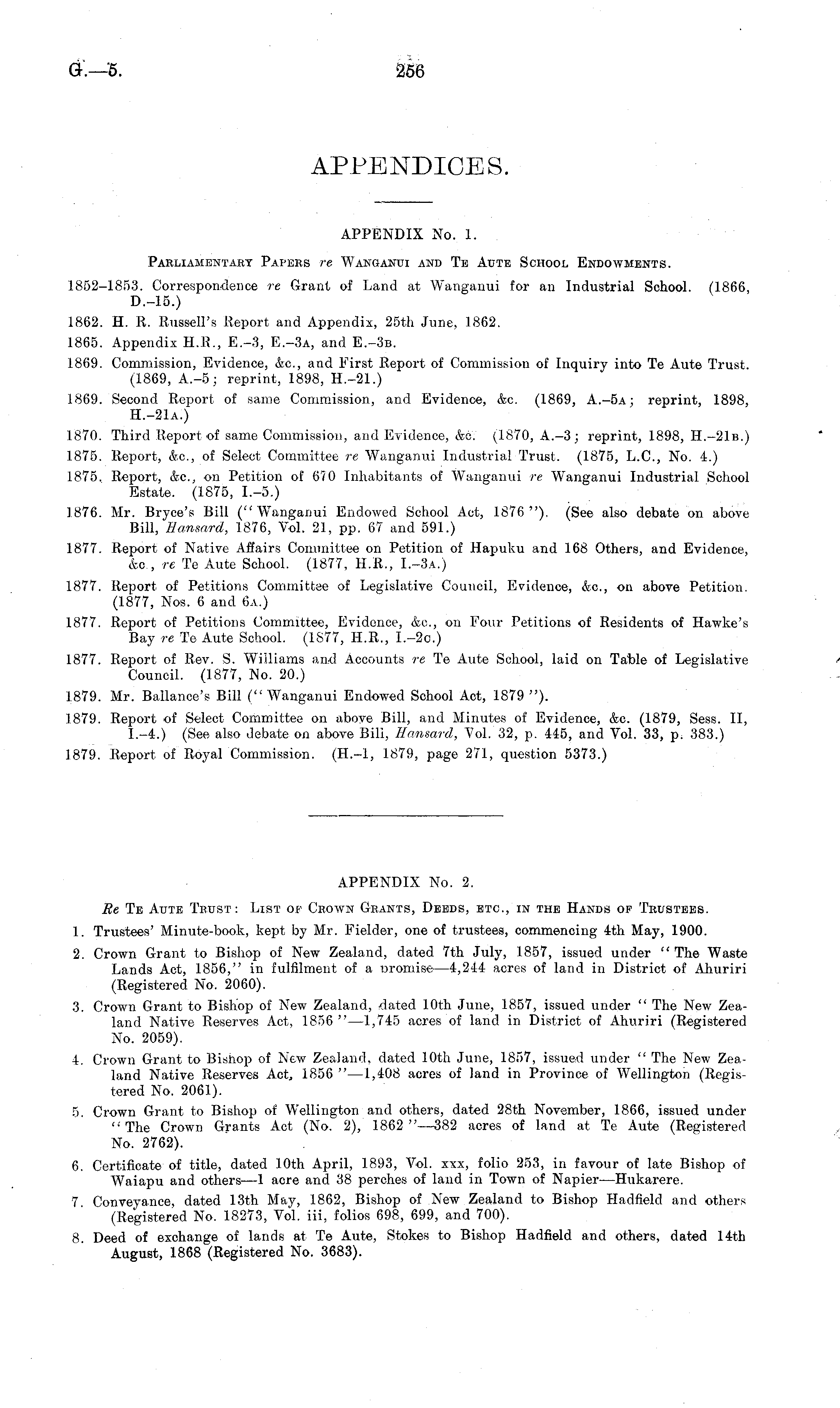 APPENDIX No. 1. Parliamentary Papers re Wanganui and Te Aute School Endowments. 1852-1853. Correspondence re Grant of Land at Wanganui for an Industrial School. (1866, D.-15.) 1862. H. R. Russell's Report and Appendix, 25th June, 1862. 1865. Appendix H.R., E.-3, E.-3a, and E.-3b. 1869. Commission, Evidence, &c, and First Report of Commission of Inquiry into Te Aute Trust. (1869, A.-5; reprint, 1898, H.-21.) 1869. Second Report of same Commission, and Evidence, &c. (1869, A.-sa; reprint, 1898, H.-21A.) 1870. Third Report of same Commission, and Evidence, ore. (1870, A.-3; reprint, 1898, H.-21b.) 1875. Report, &c, of Select Committee re Wanganui Industrial Trust. (1875, L.C., No. 4.) 1875. Report, &c., on Petition of 670 Inhabitants of Wanganui re Wanganui Industrial School Estate. (1875, 1.-5.) 1876. Mr. Bryce's Bill ("Wanganui Endowed School Act, 1876"). (See also debate on above Bill, Hansard, 1876, Vol. 21, pp. 67 and 591.) 1877. Report of Native Affairs Committee on Petition of Hapuku and 168 Others, and Evidence, Sua., re Te Aute School. (1877, H.R., 1.-3 a.) 1877. Report of Petitions Committee of Legislative Council, Evidence, &c, on above Petition. (1877, Nos. 6 and 6a.) 1877. Report of Petitions Committee, Evidence, &c, on Four Petitions of Residents of Hawke's Bay re Te Aute School. (1577, H.R., 1.-2 c.) 1877. Report of Rev. S. Williams and Accounts re Te Aute School, laid on Table of Legislative Council. (1877, Mo. 20.) 1.879. Mr. Ballance's Bill (" Wanganui Endowed School Act, 1879 "). 1879. Report of Select Committee on above Bill, and Minutes of Evidence, &c. (1879, Sess. 11, 1.-4.) (See also debate on above Bill, Hansard, Vol. 32, p. 445, and Vol. 33, p. 383.) 1879. Report of Royal Commission. (H.-l, 1879, page 271, question 5373.)