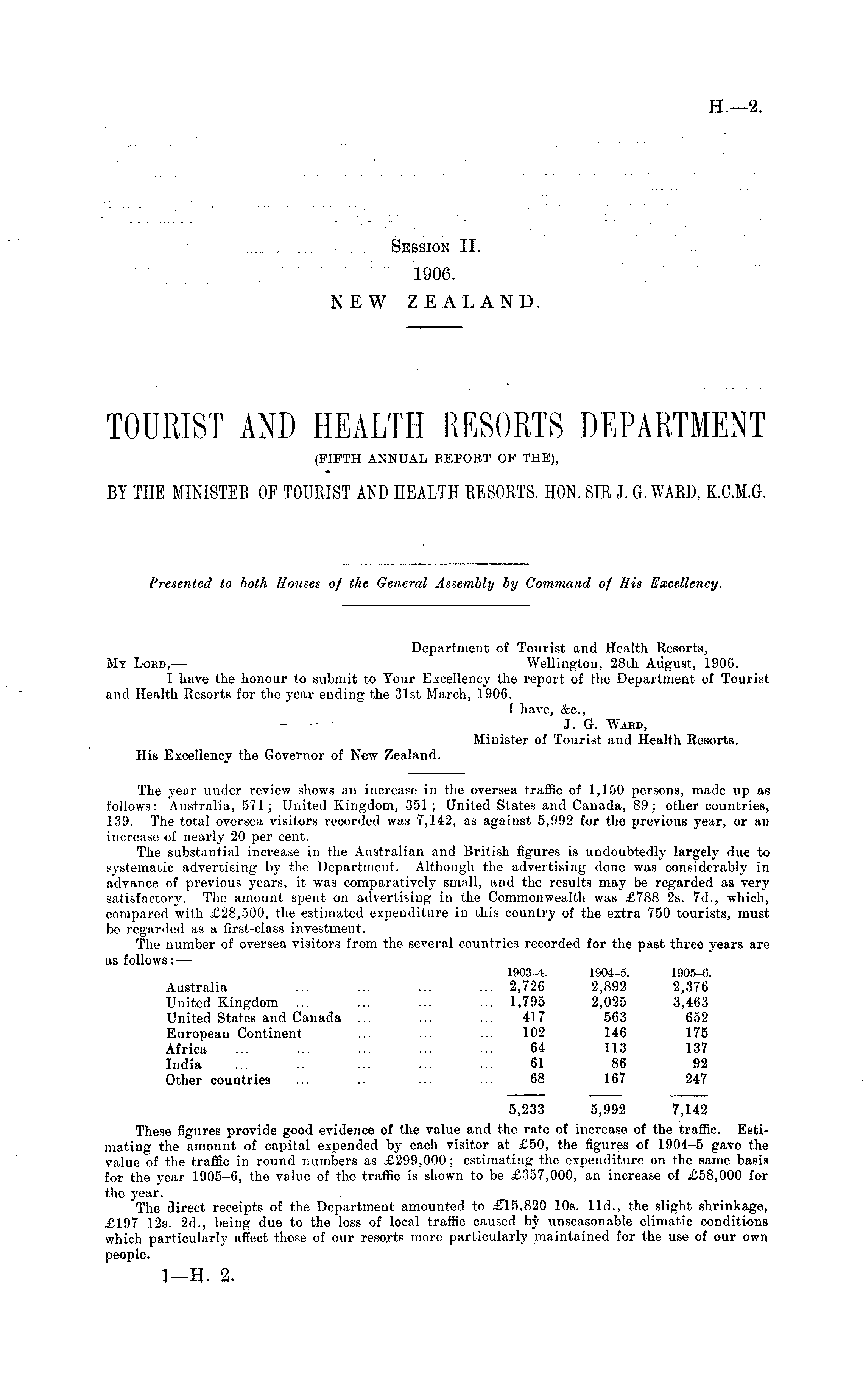 Department of Tourist and Health Resorts, My Lokd,— Wellington, 28th August, 1906. I have the honour to submit to Your Excellency the report of the Department of Tourist and Health Resorts for the year ending the 31st March, 1906. I have, &c, J. G. Ward, Minister of Tourist and Health Resorts. His Excellency the Governor of New Zealand. The year under review shows an increase in the oversea traffic of 1,150 persons, made up as follows: Australia, 571; United Kingdom, 351 ; United States and Canada, 89; other countries, 139. The total oversea visitors recorded was 7,142, as against 5,992 for the previous year, or an increase of nearly 20 per cent. The substantial increase in the Australian and British figures is undoubtedly largely due to systematic advertising by the Department. Although the advertising done was considerably in advance of previous years, it was comparatively small, and the results may be regarded as very satisfactory. The amount spent on advertising in the Commonwealth was £788 2s. 7d., which, compared with £28,500, the estimated expenditure in this country of the extra 750 tourists, must be regarded as a first-class investment. The number of oversea visitors from the several countries recorde-d for the past three years are as follows : — 1903-4. 1904-5. 1905-6. Australia ... ... ... ... 2,726 2,892 2,376 United Kingdom ... ... ... ... 1,795 2,025 3,463 United States and Canada ... ... ... 417 563 652 European Continent ... ... ... 102 146 175 Africa ... ... ... ... ... 64 113 137 India ... ... ... ... ... 61 86 92 Other countries ... ... ..." ... 68 167 247 5,233 5,992 7,142 These figures provide good evidence of the value and the rate of increase of the traffic. Estimating the amount of capital expended by each visitor at £50, the figures of 1904-5 gave the value of the traffic in round numbers as £299,000; estimating the expenditure on the same basis for the year 1905-6, the value of the traffic is shown to be £357,000, an increase of £58,000 for the year. The direct receipts of the Department amounted to £15,820 10s. lid., the slight shrinkage, £197 12s. 2d., being due to the loss of local traffic caused by unseasonable climatic conditions which particularly affect those of our resorts more particularly maintained for the use of our own people.