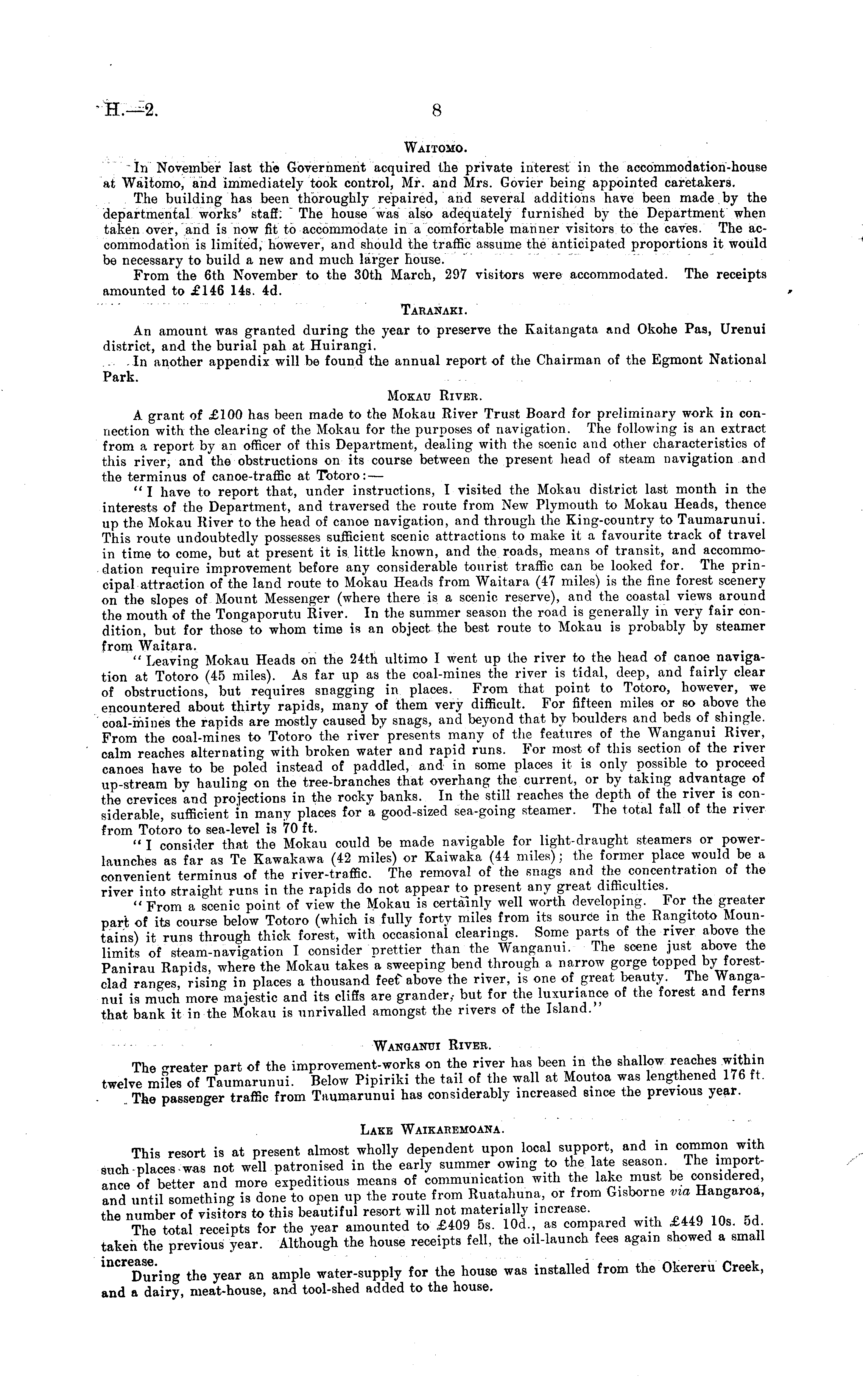 Waitomo. In November last the Government acquired the private interest in the accommodation-house at Waitomo, and immediately took control, Mr. and Mrs. Govier being appointed caretakers. The building has been thoroughly repaired, and several additions have been made by the departmental works' staff. The house was also adequately furnished by the Department when taken over, and is now fit to accommodate in a comfortable manner visitors to the caves. The accommodation is limited, however, and should the traffic assume the anticipated proportions it would be necessary to build a new and much larger house. From the 6th November to the 30th March, 297 visitors were accommodated. The receipts amounted to £146 14s. 4d. Taranaki. An amount was granted during the year to preserve the Kaitangata and Okohe Pas, Urenui district, and the burial pah at Huirangi. In another appendix will be found the annual report of the Chairman of the Egmont National Park. Mokau River. A grant of £100 has been made to the Mokau River Trust Board for preliminary work in connection with the clearing of the Mokau for the purposes of navigation. The following is an extract from a report by an officer of this Department, dealing with the scenic and other characteristics of this river, and the obstructions on its course between the present head of steam navigation and the terminus of canoe-traffic at Tbtoro: — " I have to report that, under instructions, I visited the Mokau district last month in the interests of the Department, and traversed the route from New Plymouth to Mokau Heads, thence up the Mokau River to the head of canoe navigation, and through the King-country to Taumarunui. This route undoubtedly possesses sufficient scenic attractions to make it a favourite track of travel in time to come, but at present it is little known, and the roads, means of transit, and accommodation require improvement before any considerable tourist traffic can be looked for. The principal attraction of the land route to Mokau Heads from Waitara (47 miles) is the fine forest scenery on the slopes of Mount Messenger (where there is a scenic reserve), and the coastal views around the mouth of the Tongaporutu River. In the summer season the road is generally in very fair condition, but for those to whom time is an object the best route to Mokau is probably by steamer from Waitara. " Leaving Mokau Heads on the 24th ultimo I went up the river to the head of canoe navigation at Totoro (45 miles). As far up as the coal-mines the river is tidal, deep, and fairly clear of obstructions, but requires snagging in places. From that point to Totoro, however, we encountered about thirty rapids, many of them very difficult. For fifteen miles or so above the coal-mines the rapids are mostly caused by snags, and beyond that by boulders and beds of shingle. From the coal-mines to Totoro the river presents many of the features of the Wanganui River, calm reaches alternating with broken water and rapid runs. For most of this section of the river canoes have to be poled instead of paddled, and in some places it is only possible to proceed up-stream by hauling on the tree-branches that overhang the current, or by taking advantage of the crevices and projections in the rocky banks. In the still reaches the depth of the river is considerable, sufficient in many places for a good-sized sea-going steamer. The total fall of the river from Totoro to sea-level is 70 ft. " I consider that the Mokau could be made navigable for light-draught steamers or powerlaunches as far as Te Kawakawa (42 miles) or Kaiwaka (44 miles): the former place would be a convenient terminus of the river-traffic. The removal of the snags and the concentration of the river into straight runs in the rapids do not appear to present any great difficulties. " From a scenic point of view the Mokau is certainly well worth developing. For the greater part of its course below Totoro (which is fully forty miles from its source in the Rangitoto Mountains) it runs through thick forest, with occasional clearings. Some parts of the river above the limits of steam-navigation I consider prettier than the Wanganui. The scene just above the Panirau Rapids, where the Mokau takes a sweeping bend through a narrow gorge topped by forestclad ranges, rising in places a thousand feef above the river, is one of great beauty. Ihe Wanganui is much more majestic and its cliffs are grander,- but for the luxuriance of the forest and ferns that bank it in the Mokau is unrivalled amongst the rivers of the Island." Wanganui River. The oreater part of the improvement-works on the river has been in the shallow reaches within twelve miles of Taumarunui. Below Pipiriki the tail of the wall at Moutoa was lengthened 176 ft. The passenger traffic from Taumarunui has considerably increased since the previous year. Lake Waikaremoana. This resort is at present almost wholly dependent upon local support, and in common with such places was not well patronised in the early summer owing to the late season The importance of better and more expeditious means of communication with the lake must be considered, and until something is done to open up the route from Ruatahuna, or from Gisborne via Hangaroa, the number of visitors to this beautiful resort will not materially increase. The total receipts for the year amounted to £409 ss. 10d., as compared with £449 10s. 5d taken the previous year. Although the house receipts fell, the oil-launch fees again showed a small the year an ample water-supply for the house was installed from the Okereru Creek, and a dairy, meat-house, and tool-shed added to the house.