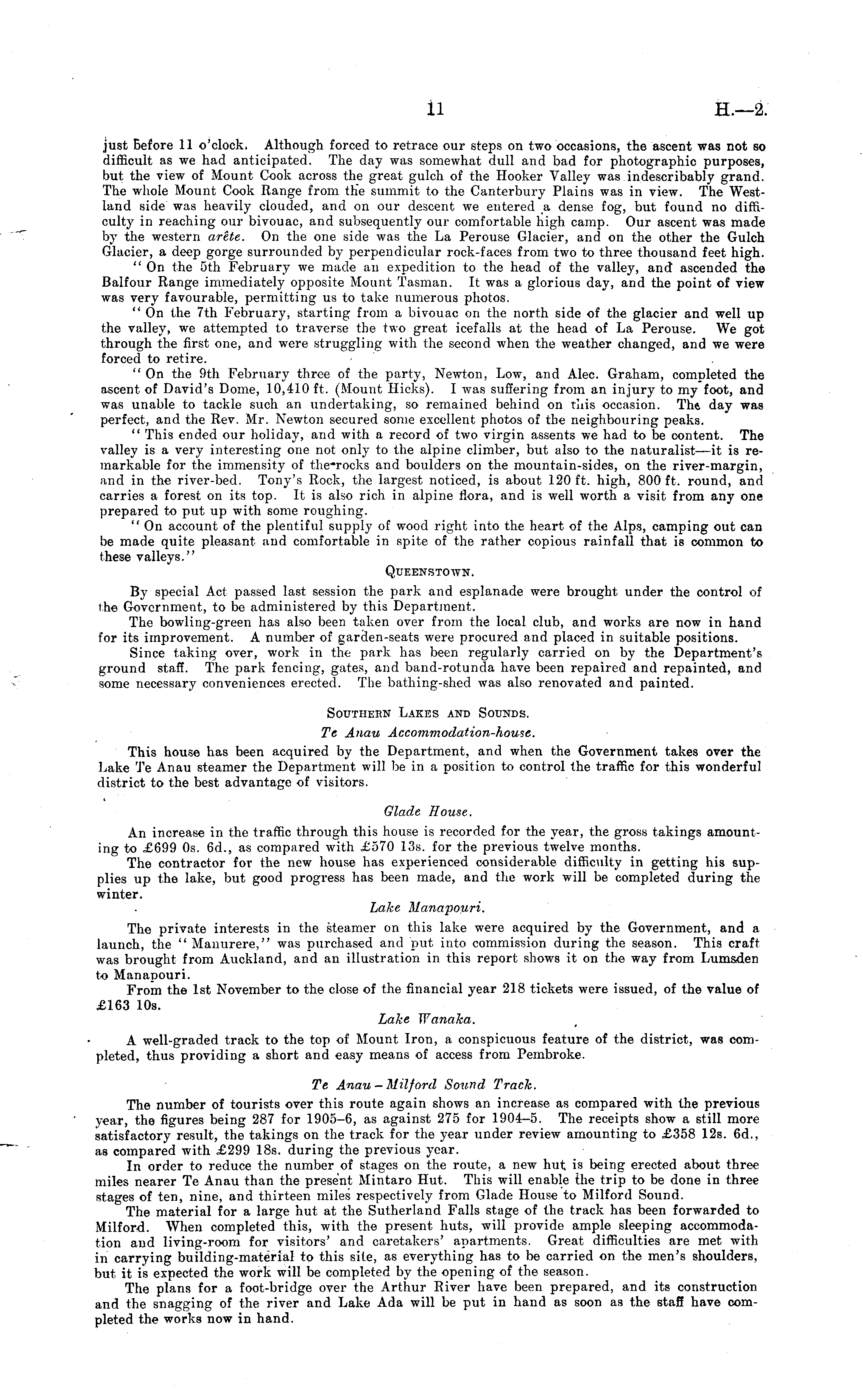 just Before 11 o'clock. Although forced to retrace our steps on two occasions, the ascent was not so difficult as we had anticipated. The day was somewhat dull and bad for photographic purposes, but the view of Mount Cook across the great gulch of the Hooker Valley was indescribably grand. The whole Mount Cook Range from the summit to the Canterbury Plains was in view. The Westland side was heavily clouded, and on our descent we entered a dense fog, but found no difficulty in reaching our bivouac, and subsequently our comfortable high camp. Our ascent was made by the western arete. On the one side was the La Perouse Glacier, and on the other the Gulch Glacier, a deep gorge surrounded by perpendicular rock-faces from two to three thousand feet high. " On the sth February we made an expedition to the head of the valley, and ascended the Balfour Range immediately opposite Mount Tasman. It was a glorious day, and the point of view was very favourable, permitting us to take numerous photos. " On the 7th February, starting from a bivouac on the north side of the glacier and well up the valley, we attempted to traverse the two great icefalls at the head of La Perouse. We got through the first one, and were struggling with the second when the weather changed, and we were forced to retire. " On the 9th February three of the party, Newton, Low, and Alec. Graham, completed the ascent of David's Dome, 10,410 ft. (Mount Hicks). I was suffering from an injury to my foot, and was unable to tackle such an undertaking, so remained behind on this occasion. The, day was perfect, and the Rev. Mr. Newton secured some excellent photos of the neighbouring peaks. " This ended our holiday, and with a record of two virgin assents we had to be content. The valley is a very interesting one not only to the alpine climber, but also to the naturalist—it is remarkable for the immensity of the-rocks and boulders on the mountain-sides, on the river-margin, and in the river-bed. Tony's Rock, the largest noticed, is about 120 ft. high, 800 ft. round, and carries a forest on its top. It is also rich in alpine flora, and is well worth a visit from any one prepared to put up with some roughing. " On account of the plentiful supply of wood right into the heart of the Alps, camping out can be made quite pleasant and comfortable in spite of the rather copious rainfall that is common to these valleys." Queenstown. By special Act passed last session the park and esplanade were brought under the control of the Government, to be administered by this Department. The bowling-green has also been taken over from the local club, and works are now in hand for its improvement. A number of garden-seats were procured and placed in suitable positions. Since taking over, work in the park has been regularly carried on by the Department's ground staff. The park fencing, gates, and band-rotunda have been repaired and repainted, and some necessary conveniences erected. The bathing-shed was also renovated and painted. Southern Lakes and Sounds. Te Anau Accommodation-house. This house has been acquired by the Department, and when the Government takes over the Lake Te Anau steamer the Department will be in a position to control the traffic for this wonderful district to the best advantage of visitors. Glade House. An increase in the traffic through this house is recorded for the year, the gross takings amounting to £699 os. 6d., as compared with £570 13s. for the previous twelve months. The contractor for the new house has experienced considerable difficulty in getting his supplies up the lake, but good progress has been made, and the work will be completed during the winter. Lake Manapouri. The private interests in the steamer on this lake were acquired by the Government, and a launch, the " Manurere," was purchased and put into commission during the season. This craft was brought from Auckland, and an illustration in this report shows it on the way from Lumsden to Manapouri. From the Ist November to the close of the financial year 218 tickets were issued, of the value of £163 10s. Lake Wanaka. A well-graded track to the top of Mount Iron, a conspicuous feature of the district, was completed, thus providing a short and easy means of access from Pembroke. Te Anau-Milford Sound Track. The number of tourists over this route again shows an increase as compared with the previous vear, the figures being 287 for 1905-6, as against 275 for 1904-5. The receipts show a still more satisfactory result, the takings on the track for the year under review amounting to £358 12s. 6d., as compared with £299 18s. during the previous year. In order to reduce the number of stages on the route, a new hut is being erected about three miles nearer Te Anau than the present Mintaro Hut. This will enable the trip to be done in three stages of ten, nine, and thirteen miles respectively from Glade House to Milford Sound. The material for a large hut at the Sutherland Falls stage of the track has been forwarded to Milford. When completed this, with the present huts, will provide ample sleeping accommodation and living-room for visitors' and caretakers' apartments. Great difficulties are met with in carrying building-material to this site, as everything has to be carried on the men's shoulders, but, it is expected the work will be completed by the opening of the season. The plans for a foot-bridge over the Arthur River have been prepared, and its construction and the snagging of the river and Lake Ada will be put in hand as soon as the staff have completed the works now in hand.
