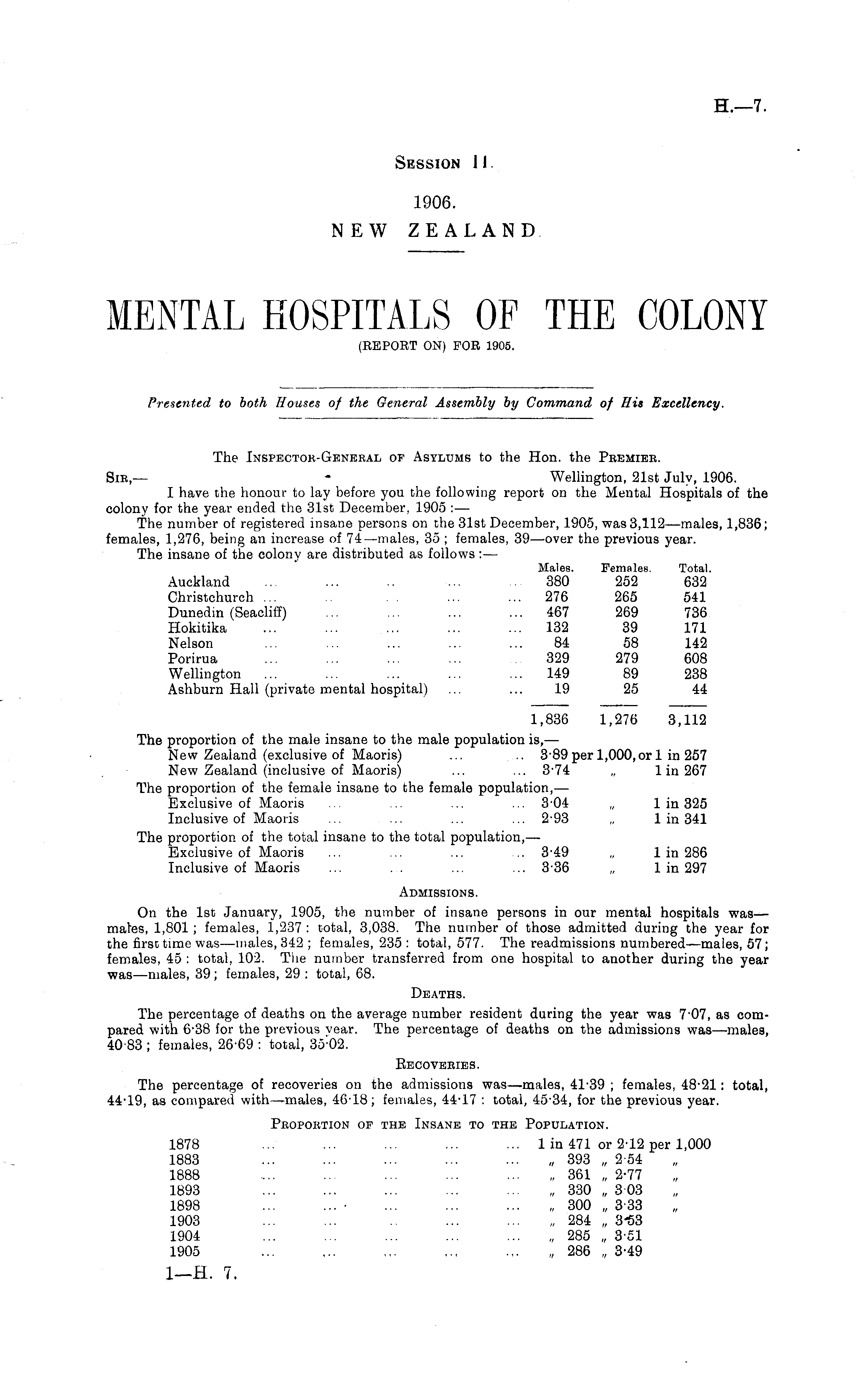 The Inspector-General of Asylums to the Hon. the Premier. Sir,— - Wellington, 21st July, 1906. I have the honour to lay before you the following report on the Mental Hospitals of the colony for the year ended the 31st December, 1905 :— The number of registered insane persons on the 31st December, 1905, was 3,112 —males, 1,836; females, 1,276, being an increase of 74—males, 35 ; females, 39—over the previous year. The insane of the colony are distributed as follows :— Males. Females. Total. Auckland ... ... .. ... ... 380 252 632 Christchurch ... ... ... 276 265 541 Dunedin (Seacliff) ... ... ... ... 467 269 736 Hokitika ... ... ... ... ... 132 39 171 Nelson ... ... ... ... ... 84 58 142 Porirua ... ... ... ... ... 329 279 608 Wellington ... ... ... ... ... 149 89 238 Ashburn Hall (private mental hospital) ... ... 19 25 44 1,836 1,276 3,112 The proportion of the male insane to the male population is,— New Zealand (exclusive of Maoris) ... .. 389 per 1,000, or lin 257 New Zealand (inclusive of Maoris) ... ... 3 - 74 „ lin 267 The proportion of the female insane to the female population,— Exclusive of Maoris ... ... ... ... 3 - 04 „ lin 325 Inclusive of Maoris ... ... ... ... 2 - 93 „ lin 341 The proportion of the total insane to the total population, — Exclusive of Maoris ... ... ... ... 3 - 49 „ lin 286 Inclusive of Maoris ... ... ... ... 336 „ lin 297 Admissions. On the Ist January, 1905, the number of insane persons in our mental hospitals was— males, 1,801 ; females, 1,237 : total, 3,038. The, number of those admitted during the year for the first time was—males, 342 ; females, 235 : total, 577. The readmissions numbered—males, 57; females, 45 : total, 102. Tiie number transferred from one hospital to another during the year was —males, 39; females, 29 : total, 68. Deaths. The percentage of deaths on the average number resident during the year was 7 - 07, as compared with 6 - 38 for the previous year. The percentage of deaths on the admissions was —males, 4083 ; females, 26 - 69 : total, 35 : 02. Recoveries. The percentage of recoveries on the admissions was—males, 41 - 39 ; females, 48-21: total, 44-19, as compared with—males, 46 - 18; females, 44-17 : total, 45 - 34, for the previous year. Proportion of the Insane to the Population. 1878 ... ... ... ... ... lin 471 or 2-12 per 1,000 1883 ... ... ... ... ... „ 393 „ 2-54 1888 .... ... ... ... 361 „ 2-77 1893 ... ... ... ... ... „ 330 „ 303 1898 ... ... • ... ... ... „ 300 „ 3-33 1903 ... ... .. ... ... „ 284 „ 3^3 1904 ... ... ... ... 285 „ 3-51 1905 ... ~. ~, .., ... „ 286 „ 3-49