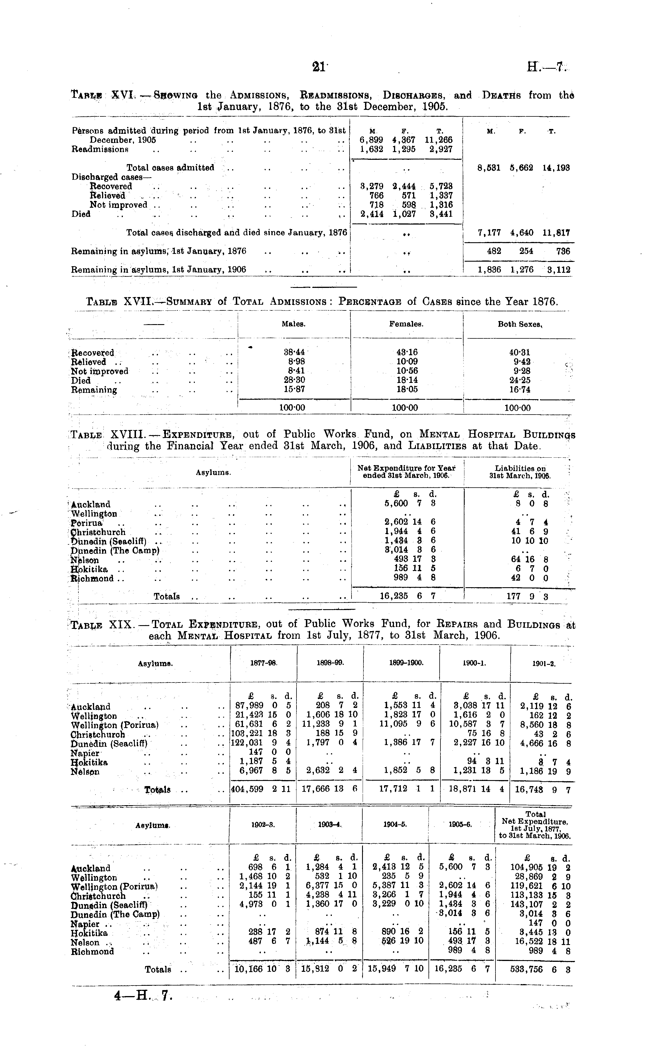 Asylums. Net Expenditure for Year ended 31st March, 1906. Liabilities on 31st March, 1906. lUckland Vellington .... 'orirua Ihristchurch )unedin (Seacliff) .. )unedin (The Camp) relson lokitika .. tichmond Totals £ a. d. 5,600 7 8 £ s. d. 8 0 8 2,602 14 6 1,944 4 6 1,434 3 6 3,014 3 6 493 17 8 156 11 5 989 4 8 4 7 4 41 6 9 10 10 10 64 16 8 6 7 0 42 0 0 16,235 6 7 177 9 3