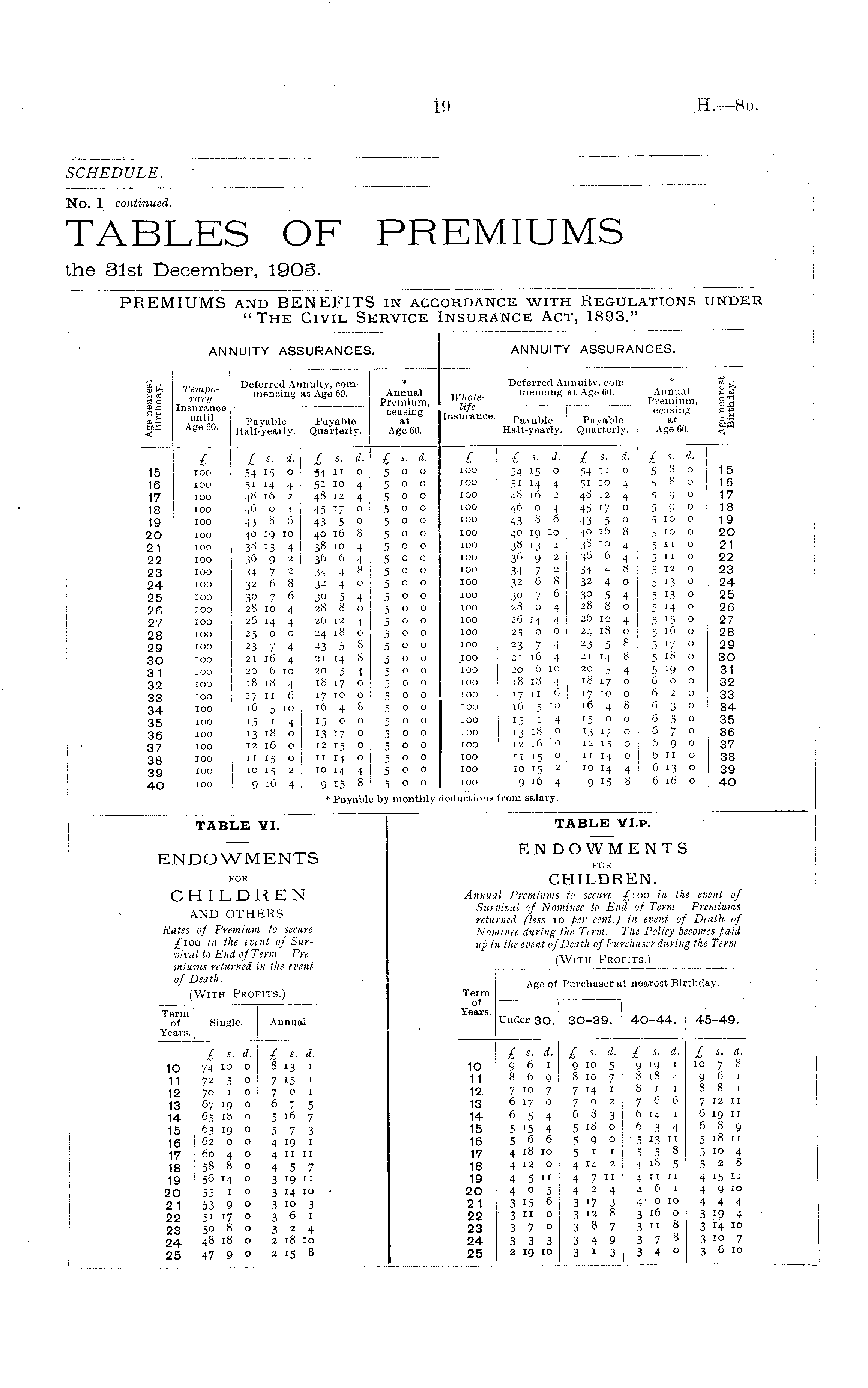 PREMIUMS and BENEFIT! "The Civil S IN ACC RVICE 1 drdance with regulations unde: nsurance Act, 1893." ANNUITY ASSURANCES ANNUITY ASSURANCES. 1 >, Tem.no Deferred Annuity, cornit rar,° mencing at Age 60. OA Insurance ' p ?i i'JS'Si Payable Payable MS Age 60. Halt : y yeal . ly . Quarterly. £ £ s. rf. / s. rf. 15 100 54 15 o 54 11 o 16 100 51 14 4 51 10 4 17 100 48 16 2 48 12 4 18 100 46 o 4 45 17 0 19 100 43 8 6 43 5 o 20 ' 100 40 19 10 40 16 8 21 100 38 13 4 38 io 4 22 i 100 36 9 2 36 6 4 23 100 34 7 2 34 4 8 24 : 100 32 6 8 32 4 o 25 100 30 7 6 30 5 4 25 100 28 10 4 28 8 o 2y 100 26 14 4 26 12 4 28 100 25 o o 24 18 o 29 100 23 7 4 23 5 8 30 100 21 16 4 21 14 8 31 100 20 6 10 20 5 4 32 100 18 18 4 18 17 o 33 100 17 11 6 17 to o 34 100 ! 16 5 10 16 4 8 35 100 15 1 4 15 o o 36 100 13 18 o 13 17 o 37 IOO 12 16 O 12 15 O 38 100 11 15 0 11 14 o 3g 100 10 15 2 10 14 4 40 100 9 16 4 9 15 8 / s. rf. 54 11 o 5i 10 4 48 12 4 45 17 o 43 5 o 40 16 8 38 10 4 36 6 4 34 4 8 32 4 o 30 5 4 28 8 o 26 12 4 2418 o 23 5 8 21 14 8 20 5 4 18 17 o 17 TO O 16 4 8 15 o o 13 17 ° 12 15 O 11 14 o 10 14 4 9 15 8 / s. rf. 500 500 500 500 500 500 500 500 500 500 500 500 500 500 500 500 500 500 500 500 500 500 500 500 500 500 Annual Premium, ceasing at Age 60. Deferred Annuity, comTT/ , , ineiLcing at Age 60. Annual wnme- Premium, T a l e ceasing Insurance. PayaWe Payable at Half-yearly. Quarterly. Age 60. / IOO IOO IOO IOO IOO IOO IOO IOO IOO IOO / s. rf. : / s. rf. 54 15 o 54 II o 51 14 4 51 10 4 48 16 2 48 12 4 46 o 4 45 17 o 43 8 6 43 5 o 40 19 10 ' 40 16 8 38 13 4 38 10 4 36 9 2 36 6 4 34 7 2 34 4 8 32 6 8 32 4 o 30 7 6 30 5 4 28 10 4 28 8 o 26 14 4 26 12 4 25 o o 24 18 o 23 7 4 23 5 8 21 ifi 4 21 14 8 20 0 10 j 20 5 4 18 18 4 18 17 o 17 11 6 J 17 10 o 16 5 10 16 4 8 15 1 4 < 15 o o 13 18 OJ 13 17 o 12 16 0 12 15 o 11 15 o I 11 14 o 10 15 2 10 14 4 9 16 4 I 9 15 8 / - s - d. 5 8 o 5 8 o 590 5 9 0 5 10 o 5 10 o 5 11 o 511 o 5 12 o 5 13 o 5 13 o 5 14 o 5 15 o 5 16 o 5 17 o 5 18 o 5 l 9 o 600 620 fi 3 o 650 670 690 6 11 o 6 13 o 6 16 o HI -*> Lh CC a hh oj.S < 15 16 17 18 19 20 21 22 23 24 25 26 27 28 29 30 31 32 33 34 35 36 37 38 39 40 IOO IOO IOO IOO IOO IOO IOO IOO IOO IOO IOO IOO IOO IOO IOO IOO * Payabli by monthly [eductions from salary. TABLE VI. TABLE YI.P. ENDOWMENTS ENDOWMENTS FOR CHILDREN AND OTHERS. FOR CHILDREN. Annual Premiums to secure /ioo in the event of Survival of Nominee to End of Term. Premiums returned (less 10 per cent.) in event of Death of Nominee during the Term. The Policy becomes paid up in the event of Death of Purchaser during the Term. (With Profits.) Rates of Premium to secure /ioo in the event of Survival to End of Term. Premiums returned in the event of Death. (With Profits.) Age of Purchaser at nearest Birthday. Term of j j j ■ Under SO. 30-39. 40-44. 45-49. Age of Purchaser at nearest Hi; ■thday. Term of Years. Single. Annual. uuuer 3(j, JU-aa. j l-U-'KK «*-0-f». Under 30. 30-39. , 40-44. 45-49. £ s - d. 10 74 10 o 11 ; 72 5 o 12 70 1 o 13 67 19 o 14 I 65 18 o 15 63 19 0 16 62 o 0 17 60 4 o 18 58 8 o 19 56 14 o 20 55 1 0 2 1 53 9 o 22 5i 17 o 23 50 8 o 24 48 18 o 25 47 9 o £ s- d. 8 13 1 7 15 1 701 6 7 5 5 16 7 5 7 3 4 19 1 4 11 11 4 5 7 3 19 11 3 14 10 3 10 3 3 6 1 324 2 18 10 2 15 8 IO 11 12 13 14 15 16 17 18 19 20 21 22 23 24 25 / s. rf. 961 869 7 10 7 6 17 o 6 5 4 5 15 4 5 6 6 4 18 10 4 12 o 4 5 11 405 3 15 6 3 11 o 3 7° 3 3 3 2 19 10 £ s- d.\ £ s. rf. 9 10 5 j 9 19 1 8 10 7 ( 8 18 4 7 14 1 I 8 1 1 7 o 2 ' 7 6 6 6 8 3 i 6 14 1 5 18 o ! 6 3 4 5 9 o ! 5 13 11 5 1 1 j 5 5 8 4 14 2 ; 4 l8 5 4 7 11 i 4 11 11 4 2 4 j 4 6 1 3 17 3 4- o 10 3 12 8 3 16 o 387 3 11 8 3 4 9 3 7 8 3 13 3 4° / -■ d. 10 7 8 961 8 8 1 7 12 11 6 19 11 689 5 18 11 5 10 4 528 4 15 11 4 9 10 4 4 4 3 19 4 3 14 10 3 10 7 3 6 10