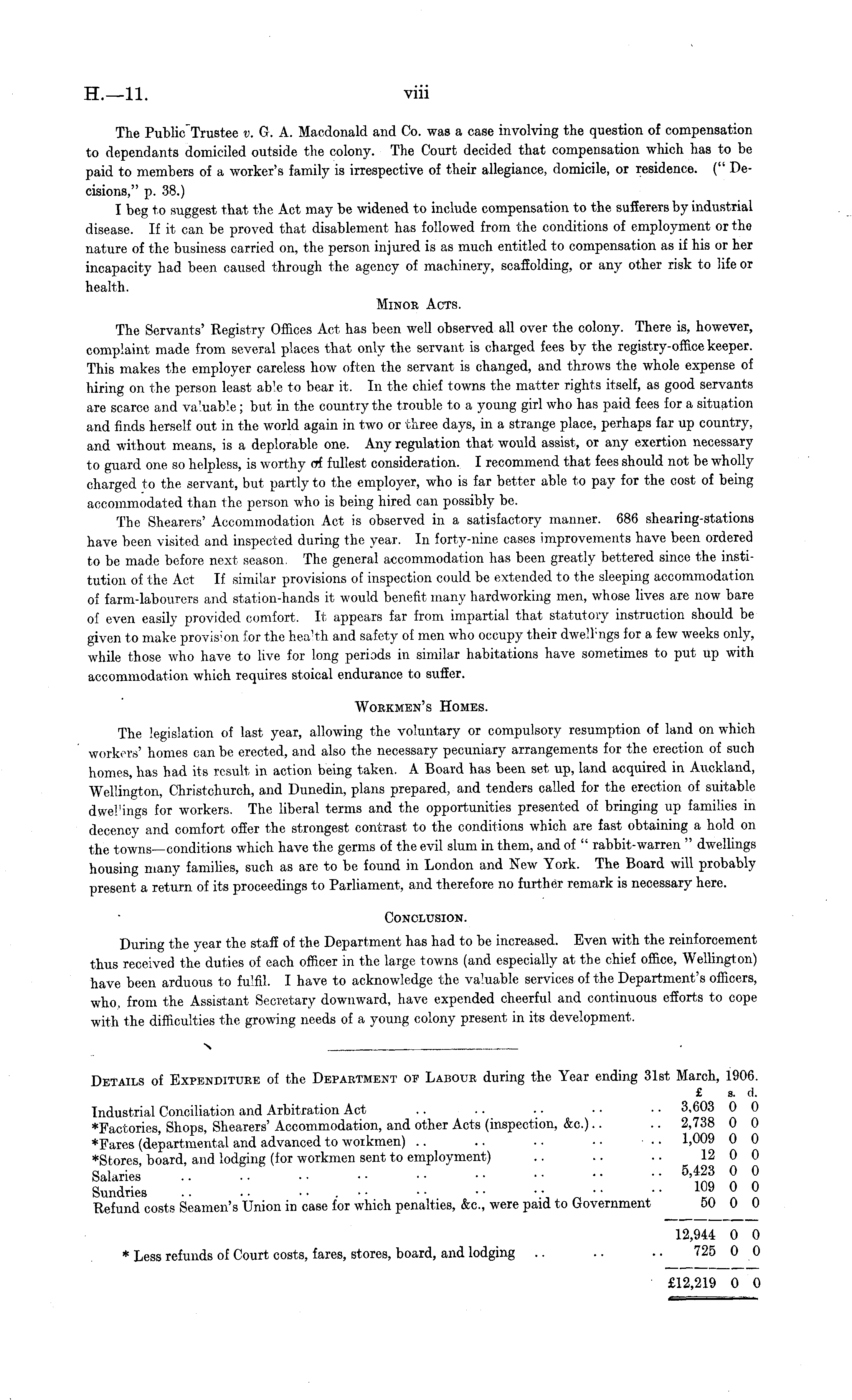 Details of Expenditure of the Department of Labour during the Year ending 31st March, 1906. £ s. el. Industrial Conciliation and Arbitration Act .. .. .. • • • • 3,603 0 0 ♦Factories, Shops, Shearers' Accommodation, and other Acts (inspection, &c.).. .. 2,738 0 0 *Fares (departmental and advanced to workmen) .. .. .. •• • ■ 1,009 0 0 ♦Stores, board, and lodging (for workmen sent to employment) .. .. . • 12 0 0 Salaries 5 >f23 0 0 Sundries J „•■ ■• ™° ° Refund costs Seamen's Union in case for which penalties, &c, were paid to Government 50 0 0 12,944 0 0 * Less refunds of Court costs, fares, stores, board, and lodging .. .. .. 725 0 0 £12,219 0 0