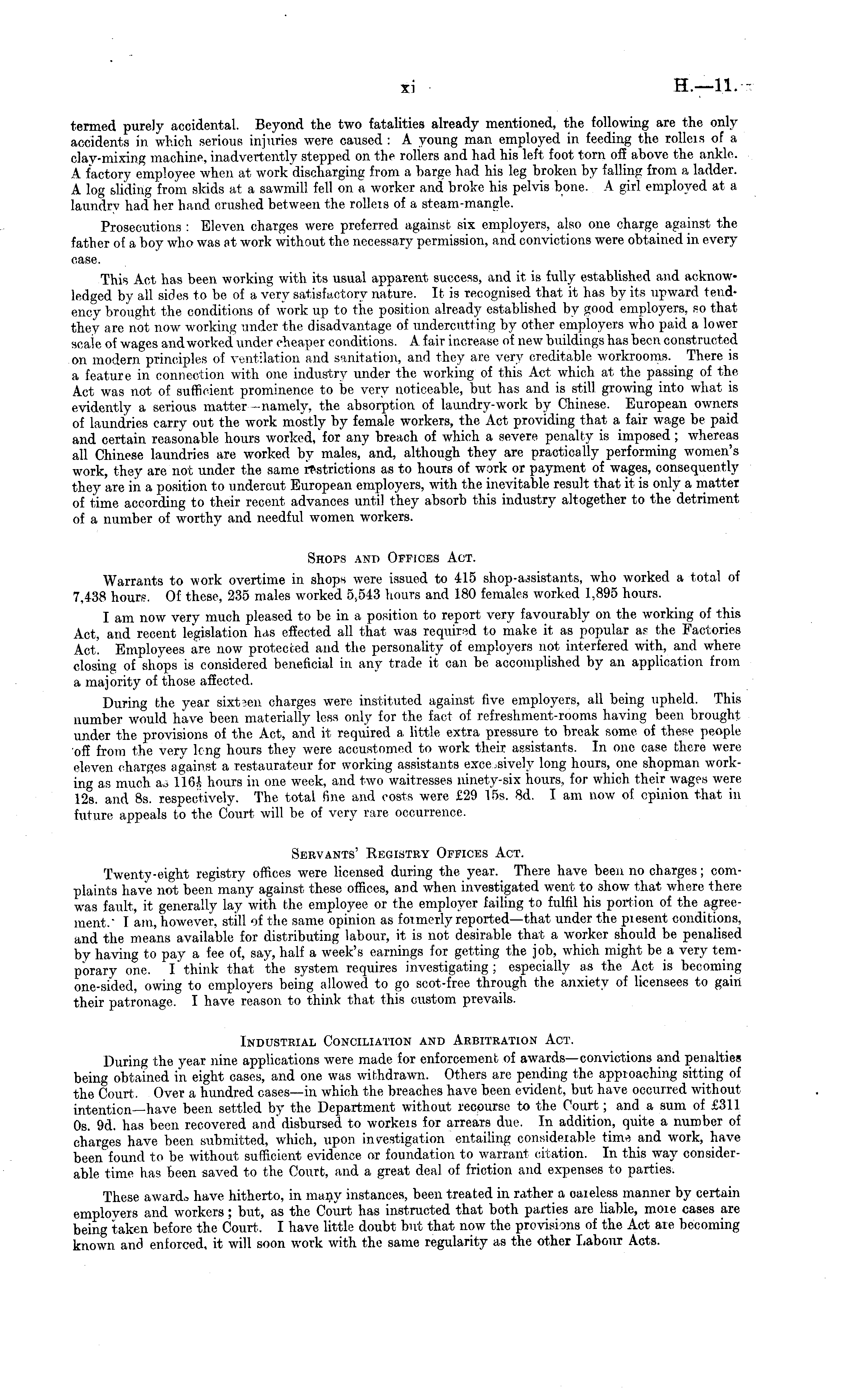 termed purely accidental. Beyond the two fatalities already mentioned, the following are the only accidents in which serious injuries were caused : A young man employed in feeding the rolleis of a clay-mixing machine, inadvertently stepped on the rollers and had his left foot torn off above the ankle. A factory employee when at work "discharging from a barge had his leg broken by falling from a ladder. A log sliding from skids at a sawmill fell on a worker and broke his pelvis bone. A girl employed at a laundry had her hand crushed between the rolleis of a steam-mangle. Prosecutions : Eleven charges were preferred against six employers, also one charge against the father of a boy who was at work without the necessary permission, and convictions were obtained in every case. This Act has been working with its usual apparent success, and it is fully established and acknowledged by all sides to be of a very satisfactory nature. It is recognised that it has by its upward tendency brought the conditions of work up to the position already established by good employers, so that they arc not now working under the disadvantage of undercutting by other employers who paid a lower scale of wages and worked under cheaper conditions. A fair increase of new buildings has been constructed on modern principles of ventilation and sanitation, and they are very creditable workrooms. _ There is a feature in connection with one industry under the working of this Act which at the passing of the Act was not of sufficient prominence to be very noticeable, but has and is still growing into what is evidently a serious matter -namely, the absorption of laundry-work by Chinese. European owners of laundries carry out the work mostly by female workers, the Act providing that a fair wage be paid and certain reasonable hours worked, for any breach of which a severe penalty is imposed ; whereas all Chinese laundries are worked by males, and, although they are practically performing women's work, they are not under the same restrictions as to hours of work or payment of wages, consequently they are in a position to undercut European employers, with the inevitable result that it is only a matter of time according to their recent advances until they absorb this industry altogether to the detriment of a number of worthy and needful women workers. Shops and Offices Act. Warrants to work overtime in shop* were issued to 415 shop-assistants, who worked a total of 7,438 hours. Of these, 235 males worked 5,543 hours and 180 females worked 1,895 hours. I am now very much pleased to be in a position to report very favourably on the working of this Act, and recent legislation has effected all that was required to make it as popular a? the Factories Act. Employees are now protected and the personality of employers not interfered with, and where closing of shops is considered beneficial in any trade it can be accomplished by an application from a majority of those affected. During the year sixteen charges were instituted against five employers, all being upheld. This number would have been materially less only for the fact of refreshment-rooms having been brought under the provisions of the Act, and it required a little extra pressure to break some of these people off from the very long hours they were accustomed to work their assistants. In one case there were eleven charges against a restaurateur for working assistants excejsively long hours, one shopman working as 1161 hours in one week, and two waitresses ninety-six hours, for which their wages were 12s. and Bs. respectively. The total fine and costs were £29 15s. Bd. I am now of opinion that in future appeals to the Court will be of very rare occurrence. Servants' Registry Offices Act. Twenty-eight registry offices were licensed during the year. There have been no charges; complaints have not been many against these offices, and when investigated went to show that where there was fault, it generally lay "with the employee or the employer failing to fulfil his portion of the agreement/ I am, however, still oi the same opinion as foimerly reported—that under the piesent conditions, and the means available for distributing labour, it is not desirable that a worker should be penalised by having to pay a fee of, say, half a week's earnings for getting the job, which might be a very temporary one. I think that the system requires investigating; especially as the Act is becoming one-sided, owing to employers being allowed to go scot-free through the anxiety of licensees to gain their patronage. I have reason to think that this custom prevails. Industrial Conciliation and Arbitration Act. During the year nine applications were made for enforcement of awards—convictions and penalties being obtained in eight cases, and one was withdrawn. Others are pending the approaching sitting of the Court. Over a hundred cases—in which the breaches have been evident, but have occurred without intention—have been settled by the Department without recourse to the Court; and a sum of £311 os. 9d. has been recovered and'disbursed to workeis for arrears due. In addition, quite a number of charges have been submitted, which, upon investigation entailing considerable time and work, have been found to be without sufficient evidence or foundation to warrant citation. In this way considerable time has been saved to the Court, and a great deal of friction and expenses to parties. These awards have hitherto, in many instances, been treated in rather a caieless manner by certain employers and workers; but, as the Court has instructed that both parties are liable, moie cases are being taken before the Court. I have little doubt but that now the provisions of the Act are becoming known and enforced, it will soon work with the same regularity as the other Labour Acts.