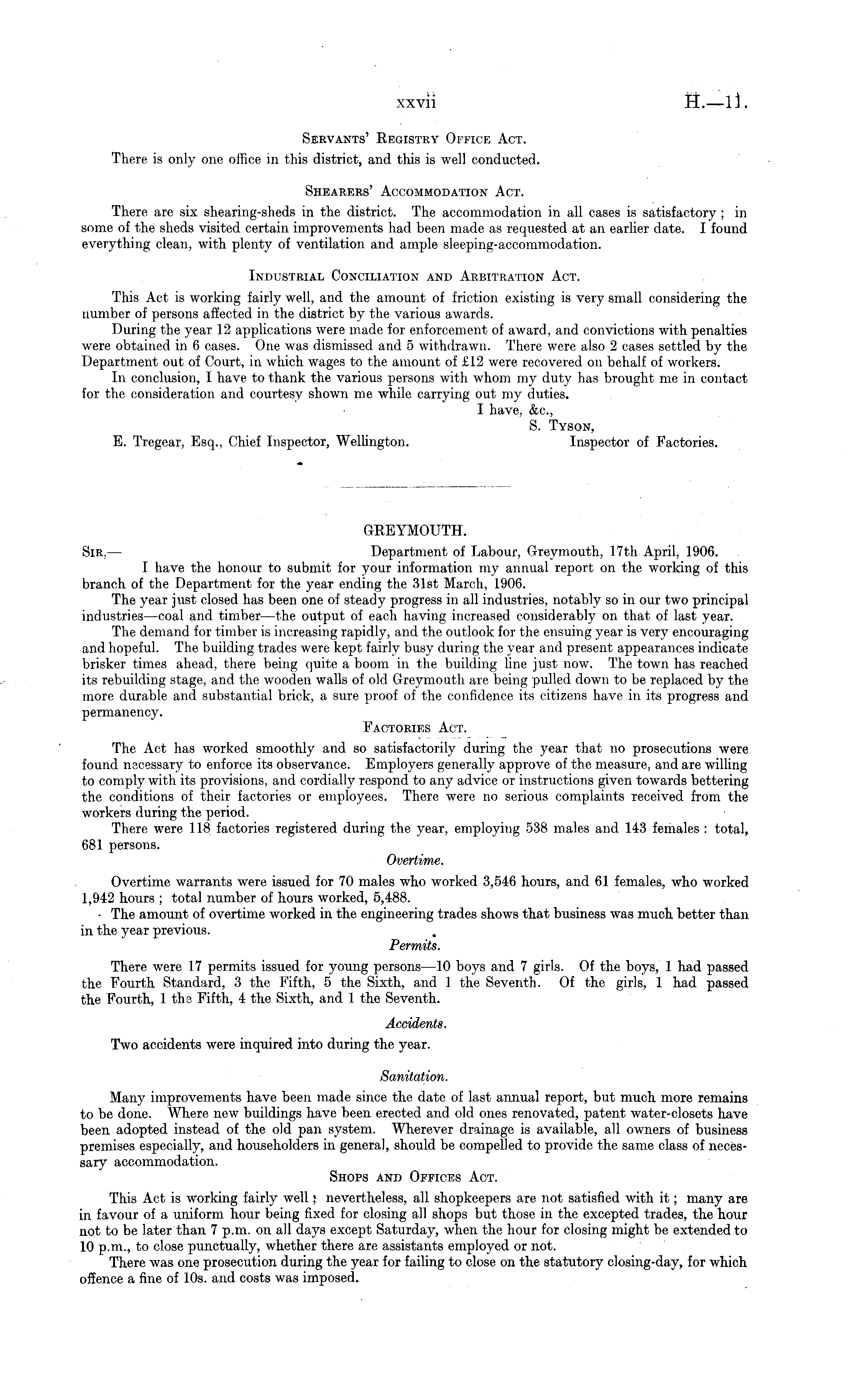 GREYMOUTH. Sir, — Department of Labour, Greymouth, 17th April, 1906. I have the honour to submit for your information my annual report on the working of this branch of the Department for the year ending the 31st March, 1906. The year just closed has been one of steady progress in all industries, notably so in our two principal industries —coal and timber—the output of each having increased considerably on that of last year. The demand for timber is increasing rapidly, and the outlook for the ensuing year is very encouraging and hopeful. The building trades were kept fairly busy during the year and present appearances indicate brisker times ahead, there being quite a boom in the building line just now. The town has reached its rebuilding stage, and the wooden walls of old Greymouth are being pulled down to be replaced by the more durable and substantial brick, a sure proof of the confidence its citizens have in its progress and permanency. Factories Act. The Act has worked smoothly and so satisfactorily during the year that no prosecutions were found necessary to enforce its observance. Employers generally approve of the measure, and are willing to comply with its provisions, and cordially respond to any advice or instructions given towards bettering the conditions of their factories or employees. There were no serious complaints received from the workers during the period. There were 118 factories registered during the year, employing 538 males and 143 females : total, 681 persons. Overtime. Overtime warrants were issued for 70 males who worked 3,546 hours, and 61 females, who worked 1,942 hours ; total number of hours worked, 5,488. - The amount of overtime worked in the engineering trades shows that business was much better than in the year previous. Permits. There were 17 permits issued for young persons—lo boys and 7 girls. Of the boys, 1 had passed the Fourth Standard, 3 the Fifth, 5 the Sixth, and 1 the Seventh. Of the girls, 1 had passed the Fourth, 1 the Fifth, 4 the Sixth, and 1 the Seventh. Accidents. Two accidents were inquired into during the year. Sanitation. Many improvements have been made since the date of last annual report, but much more remains to be done. Where new buildings have been erected and old ones renovated, patent water-closets have been adopted instead of the old pan system. Wherever drainage is available, all owners of business premises especially, and householders in general, should be compelled to provide, the same class of necessary accommodation. Shops and Offices Act. This Act is working fairly well; nevertheless, all shopkeepers are not satisfied with it; many are in favour of a uniform hour being fixed for closing all shops but those in the excepted trades, the hour not to be later than 7 p.m. on all days except Saturday, when the hour for closing might be extended to 10 p.m., to close punctually, whether there are assistants employed or not. There was one prosecution during the year for failing to close on the statutory closing-day, for which offence a fine of 10s. and costs was imposed.