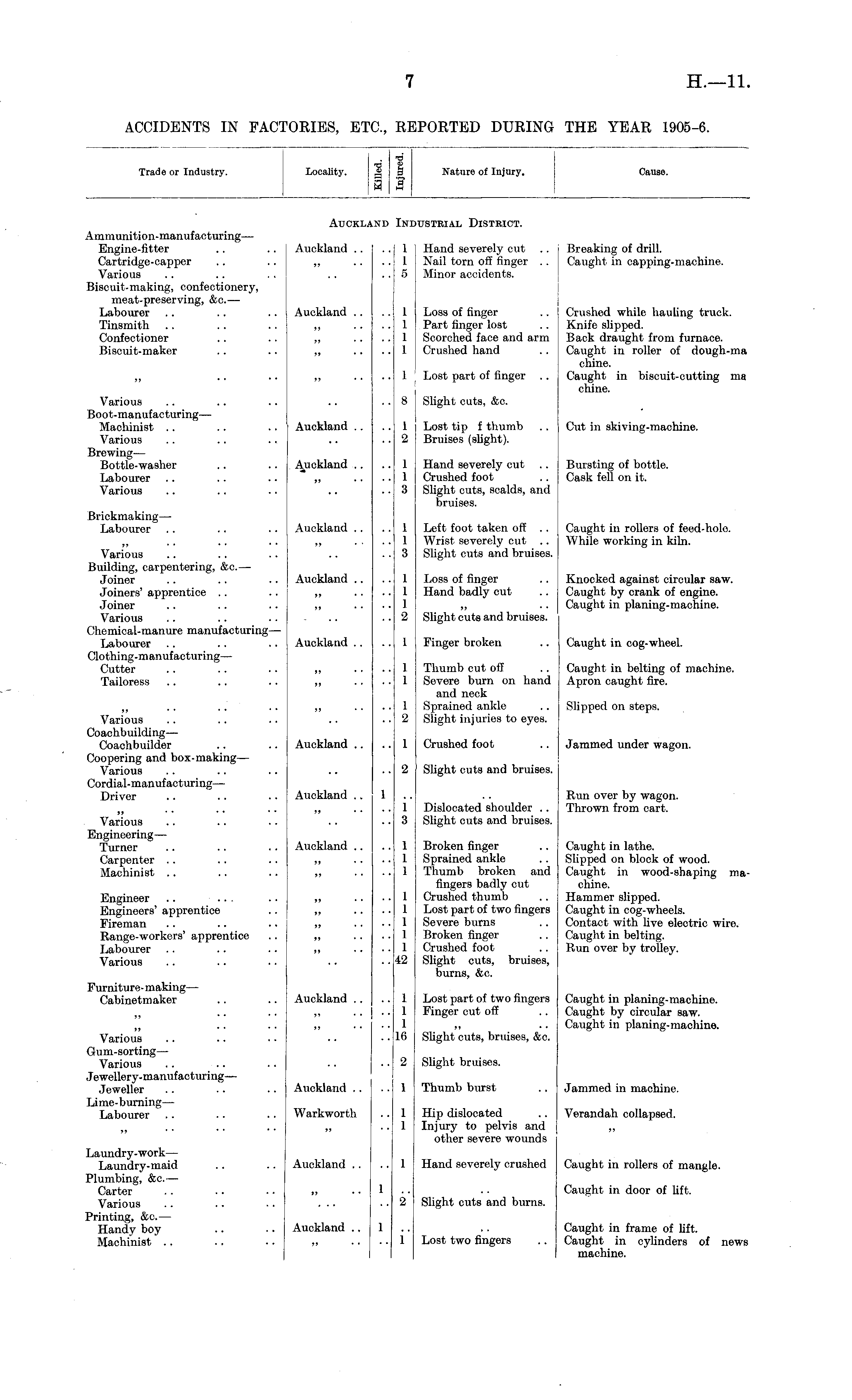 Trade or Industry. Locality. •s 1 'a Nature of Injury. Cause. Ammunition-manufacturing— Engine-fitter Cartridge-capper Various Biscuit-making, confectionery, meat-preserving, &c.— Labourer Tinsmith Confectioner Biscuit-maker AUCKL. ,\i) In 1USTRIAL District. Auckland .. [ 1 ■ 1 5 Hand severely cut Nail torn off finger .. Minor accidents. Breaking of drill. Caught in capping-machine. Auckland .. » ■ ■ 1 1 1 1 Loss of finger Part finger lost Scorched face and arm Crushed hand Crushed while hauling truck. Knife slipped. Back draught from furnace. Caught in roller of dough-ma chine. Caught in biscuit-cutting ma chine. 1 Lost part of finger Various Boot-manufacturing— Machinist Various Brewing— Bottle-washer Labourer Various 8 Slight cuts, &c. Auckland .. 1 ■2 Lost tip f thumb Bruises (slight). Cut in skiving-machine. Auckland .. I I :; Hand severely cut Crushed foot Slight cuts, scalds, and bruises. Bursting of bottle. Cask fell on it. Brickmaking— Labourer Auckland .. 1 1 3 Left foot taken off .. Wrist severely cut Slight cuts and bruises. Caught in rollers of feed-hole. While working in kiln. Various Building, carpentering, &c.— Joiner Joiners' apprentice Joiner Various Chemical-manure manufacturing— Labourer Clothing-manufacturing — Cutter Tailoress Auckland .. 1 1 1 2 J Loss of finger Hand badly cut Slight cuts and bruises. Knocked against circular saw. Caught by crank of engine. Caught in planing-machine. Auckland .. 1 Finger broken Caught in cog-wheel. »> • • 1 1 Thumb cut oil Severe burn on hand and neck Sprained ankle Slight injuries to eyes. Caught in belting of machine. Apron caught fire. Various Coachbuilding— Coachbuilder Coopering and box-making— Various Cordial-manufacturing— Driver 1 2 Slipped on steps. Auckland .. I Crushed foot Jammed under wagon. 2 Slight cuts and bruises. Run over by wagon. Thrown from cart. Auckland .. 1 Dislocated shoulder .. Slight cuts and bruises. Various Engineering — Turner Carpenter Machinist i 3 Engineer Engineers' apprentice Fireman Range-workers' apprentice Labourer Various Auckland .. i i i i i i i i 42 Broken finger Sprained ankle Thumb broken and fingers badly cut Crushed thumb Lost part of two fingers Severe burns Broken finger Crushed foot Slight cuts, bruises, burns, &c. Caught in lathe. Slipped on block of wood. Caught in wood-shaping machine. Hammer slipped. Caught in cog-wheels. Contact with live electric wire. Caught in belting. Run over by trolley. Furniture- making— Cabinetmaker Auckland .. Lost part of two fingers Finger cut off Caught in planing-machine. Caught by circular saw. Caught in planing-machine. 1 1 1 Lβ Various Gum-sorting— Various Jewellery-manufacturing — Jeweller Lime-burning— Labourer Slight cuts, bruises, &c. 2 Slight bruises. Jammed in machine. Auckland .. 1 Thumb burst Warkworth 1 I Hip dislocated Injury to pelvis and other severe wounds Verandah collapsed. Laundry-work— Laundry-maid Plumbing, &c.— Carter Various Printing, &c.— Handy boy Machinist Auckland .. 1 ■l' Hand severely crushed Caught in rollers of mangle. Caught in door of lift. Slight cuts and burns. Auckland .. 1 i Lost two fingers Caught in frame of lift. Caught in cylinders of news machine.