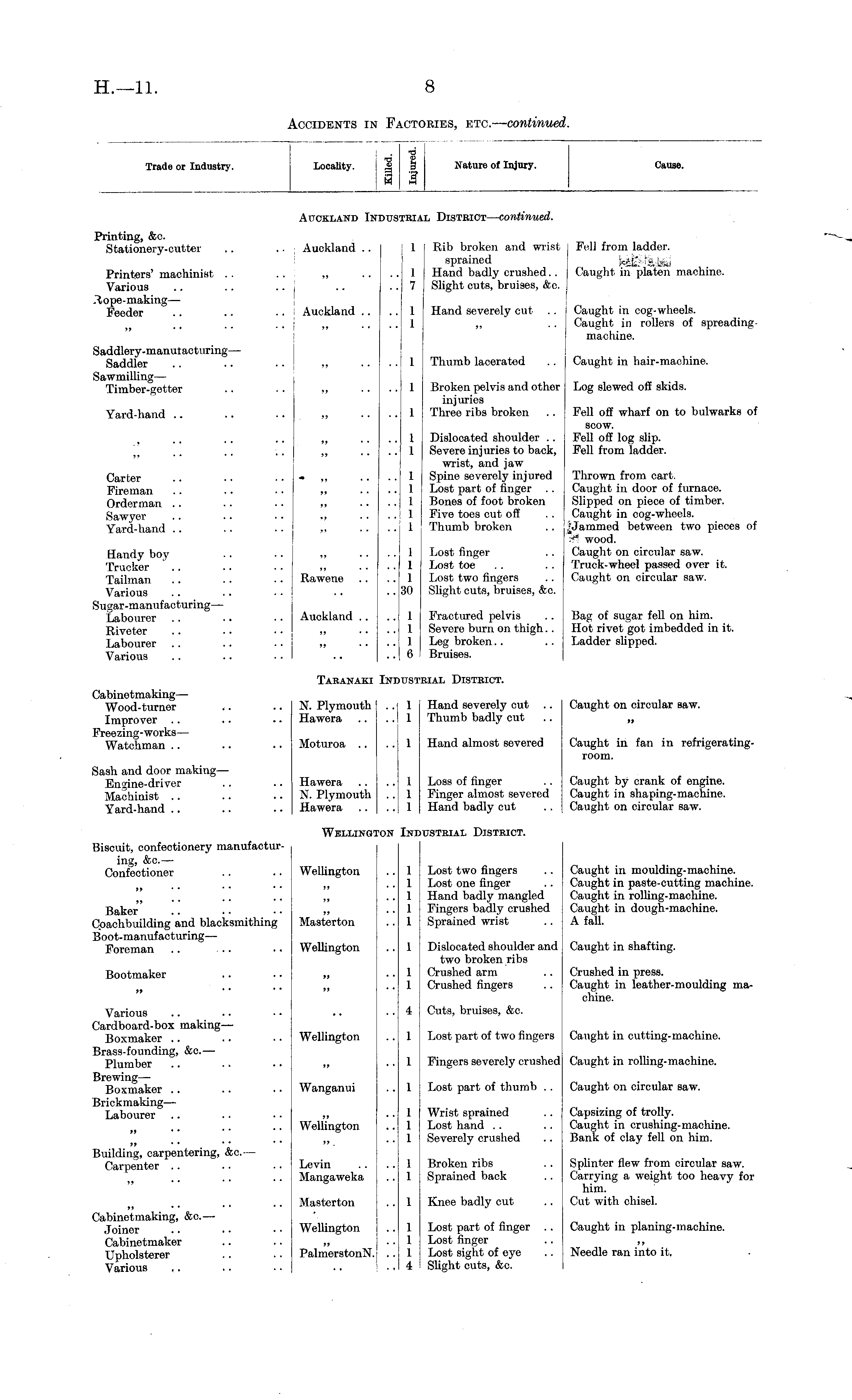 Trade or Industry. Locality. I Nature ol Injury. Cause. Auckland Indus 'US' 'BIA] al District — continued. Printing, &c. Stationery-cutter Auckland .. 1 Rib broken and wrist sprained Hand badly crushed.. Slight cuts, bruises, &e. Fell from ladder. Caught in platen machine. Printers' machinist Various making— Feeder 1 7 Auckland .. 1 1 Hand severely cut . . Caught in cog-wheels. Caught in rollers of spreadingmachine. Saddlery-manutacturing — Saddler Sawmilling— Timber-getter i 1 Thumb lacerated Caught in hair-machine. 1 Broken pelvis and other injuries Three ribs broken Log slewed off skids. Yard-hand 1 1 1 Dislocated shoulder .. Severe injuries to back, wrist, and jaw Spine severely inj nred Lost part of finger Bones of foot broken Five toes cut off Thumb broken Fell off wharf on to bulwarks of scow. Fell off log slip. Fell from ladder. Carter Fireman Orderman Sawyer Yard-hand ! 1 1 1 1 j 1 Thrown from cart. Caught in door of furnace. Slipped on piece of timber. Caught in cog-wheels. between two pieces of wood. Caught on circular saw. Truck-wheel passed over it. Caught on circular saw. Handy boy Trucker Tailman Various Sugar-manufacturing — Labourer Riveter Labourer Various Rawene 1 1 I 30 Lost finger Lost toe Lost two fingers Slight cuts, bruises, &c. Auckland .. 1 1 6 Fractured pelvis Severe burn on thigh.. Leg broken I Bruises. Bag of sugar fell on him. Hot rivet got imbedded in it. Ladder slipped. Cabinetmaking— Wood-turner Improver Freezing-works — Watchman Tabanaki Ini itrs . 'RIAL DlSTBICT. Caught on circular saw. N. Plymouth .. Hawera 1 1 Hand severely cut Thumb badly cut Moturoa 1 Hand almost severed Caught in fan in refrigeratingroom. Sash and door making— Engine-driver Machinist Yard-hand Hawera N. Plymouth .. Hawera 1 1 1 Loss of finger Finger almost severed Hand badly cut Caught by crank of engine. Caught in shaping-machine. Caught on circular saw. Biscuit, confectionery manufacturing, &c— Confectioner Wellington •ON I\ jusTEiAL District. I Wellington 1 1 1 1 1 Lost two fingers Lost one finger Hand badly mangled Fingers badly crushed Sprained wrist Caught in moulding-machine. Caught in paste-cutting machine. Caught in rolling-machine. Caught in dough-machine. A fall. Baker Cpachbuilding and blacksmithing Boot-manufacturing— Foreman Masterton Wellington I Dislocated shoulder and two broken ribs Crushed arm Crushed fingers Caught in shafting. Bootmaker 1 1 Crushed in press. Caught in leather-moulding machine. Various Cardboard-box making— Boxmaker Brass-founding, &c.— Plumber Brewing— Boxmaker Brickmaking— Labourer Wellington 4 1 1 j Cuts, bruises, &c. Lost part of two fingers Fingers severely crushed Caught in cutting-machine. Caught in rolling-machine. Wanganui 1 Lost part of thumb .. Caught on circular Baw. Wellington 1 1 1 Wrist sprained Lost hand Severely crushed Capsizing of trolly. Caught in crushing-machine. Bank of clay fell on him. Building, carpentering, &c.— Carpenter Levin Mangaweka 1 1 Broken ribs Sprained back Splinter flew from circular saw. Carrying a weight too heavy for him. Cut with chisel. Cabinetmaking, &c. — Joiner Cabinetmaker Upholsterer Various Maaterton I Knee badly cut Wellington 1 1 1 4 Lost part of finger Lost finger Lost sight of eye Slight cuts, &c. Caught in planing-machine. » • ■ PalmerstonN.j .. Needle ran into it.
