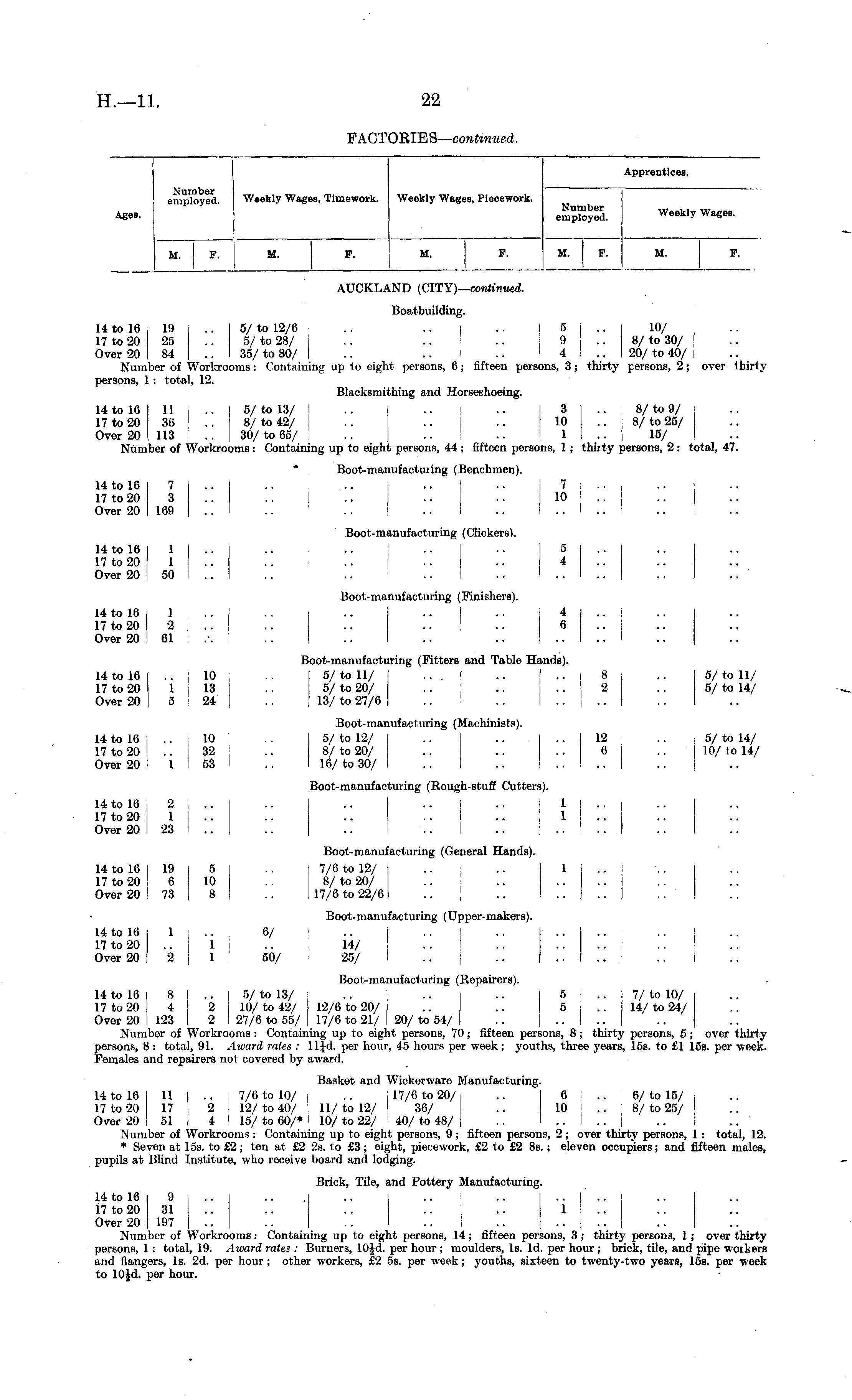 Number employed. Apprentices. Ages. W«ekly Wages, Timework. Weekly Wages, Piecework. Number employed. M. F. Weekly Wages. M. F M. F. M. F. M. F. M. P. AUCKLAND (CITY)— continued. Boatbuilding. 14 to 16 ; 19 .. 5/ to 12/6 .. ■ • I • • I 5 I • • 10 / 17 to 20 I 25 .. 5/ to 28/ , .. .. .. 9 .. 8/ to 30/ ! Over 20 i 84 .. 35/ to 80/ I .. .. ! .. 4 .. 20/ to 40/ ' Number of Workrooms: Containing up to eight persons, 6; fifteen persons, 3; thirty persons, 2; over thirty persons, 1 : total, 12. Blacksmithing and Horseshoeing. 14 to 16 11 .. 5/ to 13/ I .. .. ! .. 3 .. ! 8/ to 9/ 17 to 20 36 .. 8/ to 42/ i .. .. .. 10 .. 8/ to 25/ Over 20 113 ! .. 30/to 65/ .. .. .. 1 .. 15/ Number of Workrooms : Containing up to eight persons, 44 ; fifteen persons, 1 ; thii ty persons, 2: total, 47. Boot-manufactuiing (Benchmen). 14 to 16 7 .. .. .. .. .. 7 1 .. I 17 to 20 3 .. .. .. .. 10 i .. Over 20 169 .. .. .. .. .. I .. Boot-manufacturing (Clickers ). 14 to 16 1 .. .. .. .. 5 .. 17 to 20 1 .. .. .. .. 4 Over 20 50 ! .. Boot-manufacturing (Finishers). 14 to 16 1 .. .. .. I .. i 4 17 to 20 2 .. .. .. .. .. 6 .. Over 20 I 61 .. .. .. .. .... Boot-manufacturing (Fitters and Table Hands). 14 to 16 .. 10 .. 5/to 11/ .. . -I .. .. 8 .. 5/to 11/ 17 to 20 1 13 .. 5/ to 20/ .. .. .. 2 .. 5/ to 14/ Over 20 5 24 .. 13/ to 27/6 .. .. I .. Boot-manufacturing (Machinists). 14 to 16 .. 10 . . 5/ to 12/ I .. .. .. 12 .. 5/ to 14/ 17 to 20 32 .. 8/ to 20/ J .. .. .. 6 .. 10/ lo 14/ Over 20 1 53 .. 16/ to 30/ I Boot-manufacturing (Rough-stuff Cutters). 14 to Iβ I 2 I .. .. .. .. .. I 1 17 to 20 i 1 .. .. .. .. 1 .. Over 20 i 23 .. .. .. .. I Boot-manufacturing (General Hands). 14 to 16 i 19 5 . . 7/6 to 12/ .. : .. 1 17 to 20 I 6 10 . . 8/ to 20/ Over 20 ' 73 8 : .. ! 17/6 to 22/6 Boot-manufacturing (Upper-makers). 14 to 16 1 .. 6/ .. • • I 17 to 20 1 .. 14/ Over 20 2 1 50/ 25/1 .. . . .. .. .. I Boot-manufacturing (Repairers). 14 to 16 8 .. 5/ to 13/ .. .. .. 5 .. 7/ to 10/ 17 to 20 4 2 10/ to 42/ 12/6 to 20/ .. .. 5 i .. 14/ to 24/ Over 20 123 2 27/6 to 55/ 17/6 to 21/ 20/ to 54/ Number of Workrooms : Containing up to eight persons, 70 ; fifteen persons, 8 ; thirty persons, 5 ; over thirty persons, 8 : total, 91. Award rates : 11 Jd. per hour, 45 hours per week ; youths, three years, 15s. to £1 15s. per week. Females and repairers not covered by award. Basket and Wickerware Manufacturing. 14 to 16 11 I .. I 7/6 to 10/ .. i 17/6 to 20/ .. 6 6/ to 15/ , 17 to 20 17 2 I 12/to 40/ | 11/to 12/ I 36/ .. 10 .. 8/to 25/ Over 20 51 4 ! 15/ to 60/* i 10/ to 22/ 40/ to 48/ Number of Workrooms: Containing up to eight persons, 9; fifteen persons, 2; over thirty persons, 1: total, 12. * Seven at 15s. to £2; ten at £2 2s. to £3; eight, piecework, £2 to £2 8s. ; eleven occupiers; and fifteen males, pupils at Blind Institute, who receive board and lodging. Brick, Tile, and Pottery Manufacturing. 14 to 16 9 17 to 20 31 .. .. .. .. .. 1 Over 20 197 .. .. .. .. .... Number of Workrooms: Containing up to eight persons, 14; fifteen persons, 3 ; thirty persons, 1; over thirty persons, 1 : total, 19. Award rates : Burners, 10£d. per hour ; moulders, Is. Id. per hour ; brick, tile, and pipe woikers and flangers, Is. 2d. per hour ; other workers, £2 5s. per week ; youths, sixteen to twenty-two years, 15s. per week to lOJd. per hour.