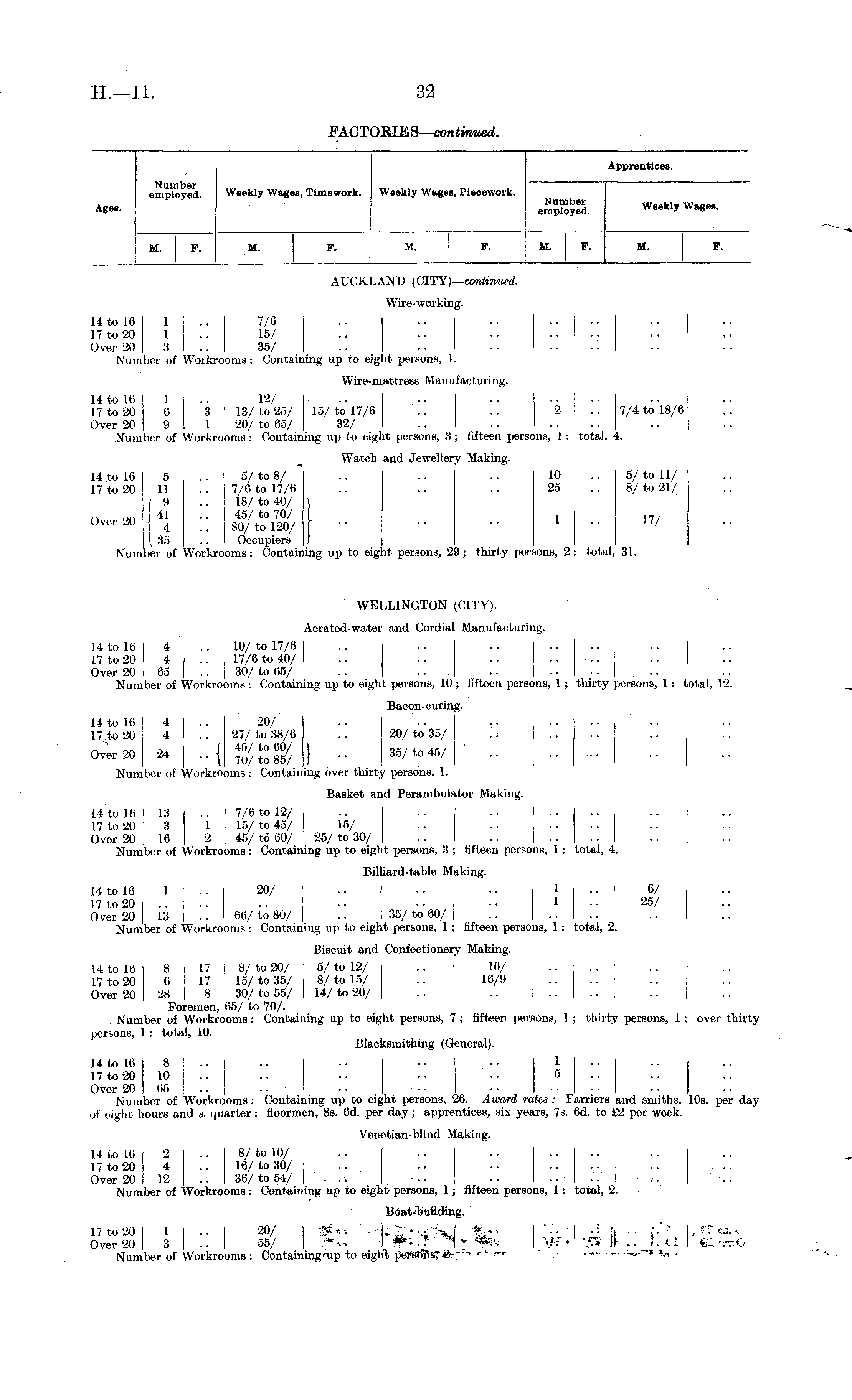 Apprentices. Number employed. Weekly Wages, Timework. Weekly Wages, Piecework. Agee. Number employed. Weekly Wages. M. F. If. F. M. F. M. F. M. F. AUCKLAND (CITY)— continued. Wire-working. 14 to 16 1 7/6 .. .. .. .... 17 to 20 1 15/ .. .. .. .... Over 20 3 35/ .. .. .. .... Number of Woikrooms: Containing up to eight persons, 1. Wire-mattress Manufacturing. 14 to US 1 12/ .. .. .. .... 17 to 20 f> 3 13/ to 25/ 15/ to 17/6 .. .. 2 .. 7/4 to 18/6 Over 20 9 1 20/ to 65/ 32/ Number of Workrooms: Containing up to eight persons, 3 ; fifteen persons, 1 : total, 4. Watch and Jewellery Making. 14 to 16 5 .. 5/to 8/ .. .. .. 10 6/to 11/ 17 to 20 11 .. 7/6 to 17/6 .. .. .. 25 8/ to 21/ [9 .. 18/ to 40/ ,,. 41 .. 45/ to 70/ . ,-, Over 20 4 " m j V2Q/ ■ •• •• •• * •• "/ (35 .. Occupiers Number of Workrooms: Containing up to eight persons, 29; thirty persons, 2: total, 31. WELLINGTON (CITY). Aerated-water and Cordial Manufacturing. 14 to 16 ] 4 .. 10/ to 17/6 .. .. .. .. .. I 17 to 20 j 4 .. 17/6 to 40/ .. .. .. .... Over 20 j 65 .. 30/ to 65/ Number of Workrooms : Containing up to eight persons, 10 ; fifteen persons, 1 ; thirty persons, 1 : total, 12. Bacon-curing. 14 to 16 4 .. 20/ .. .. .. •. .. 17 to 20 4 .. 27/ to 38/6 .. 20/ to 35/ Over 20 24 .. j $ £ $ | .. 35/to 45/ Number of Workrooms : Containing over thirty persons, 1. Basket and Perambulator Making. 14 to 16 I 13 . . 7/6 to 12/ .. .. I 17 to 20 I 3 1 15/ to 45/ 15/ Over 20 i 16 2 45/ to 60/ 25/ to 30/ .. ! Number of Workrooms: Containing up to eight persons, 3 ; fifteen persons, 1 : total, 4. Billiard-table Making. 14 to 16 1 20/ .. I • • 1 .. 6/ 17 to 20 .... .. • • •• •• 1 .. 25/ Over 20 13 .. 66/ to 80/ . . 35/ to 60/ .. i .. Number of Workrooms : Containing up to eight persons, 1 ; fifteen persons, 1 : total, 2. Biscuit and Confectionery Making. 14 to 16 8, 17 8/ to 20/ I 5/ to 12/ .. 16/ 17 to 20 6 17 15/ to 35/ 8/to 15/ .. 16/9 Over 20 28 8 30/ to 55/ 14/ to 20/ Foremen, 65/ to 70/. Number of Workrooms : Containing up to eight persons, 7 ; fifteen persons, 1 ; thirty persons, 1 ; over thirty persons, 1 : total, 10. Blacksmithing (General). 14 to 16 8 . • ■ • ■ ■ • • 1 .. 17 to 20 10 .. • • • • • • 5 .. Over 20 65 .. • • • ■ • • .... Number of Workrooms: Containing up to eight persons, 26. Award rates : Farriers and smiths, 10s. per day of eight hours and a quarter; floormen, 8s. 6d. per day ; apprentices, six years, 7s. 6d. to £2 per week. Venetian-blind Making. 14 to 16 2 .. 8/ to 10/ 17 to 20 4 .. 16/ to 30/ Over 20 12 36/ to 54/ Number of Workrooms: Containing up to eight persons, 1 ; fifteen persons, 1 : total, 2. Boat-building. 17 to 20 1 .. 20/ i .. .. I •• .. I .! (I - .. I Over 20 3 .. 55/ .. .. •• . . • I V* If.- : ■ I Number of Workrooms: Containing up to eight persons, 2.
