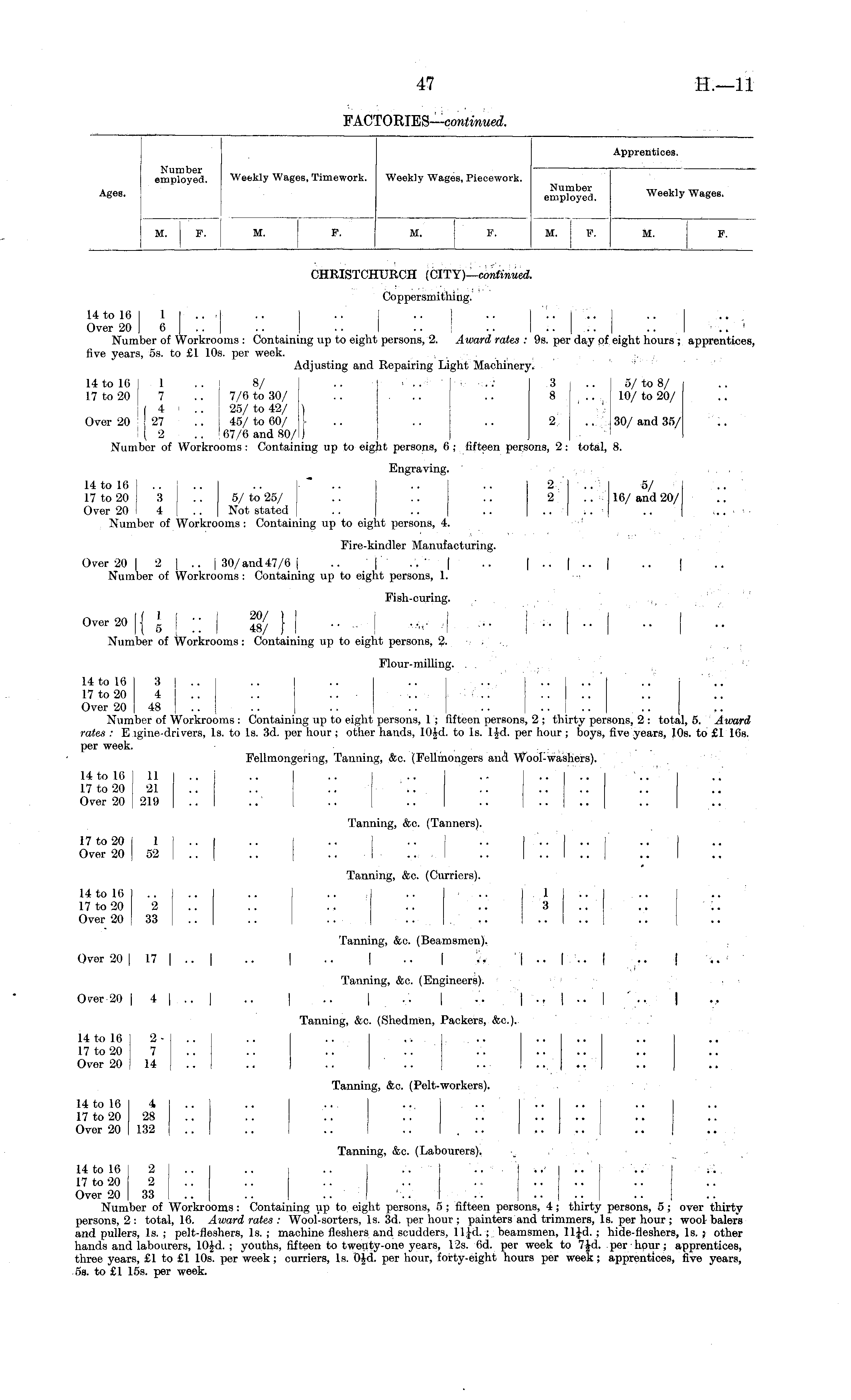 Number of Workrooms : Containing up to eight persons, 5 ; fifteen persons, 4 ; thirty persons, 5 ; over thirty persons, 2 : total, 16. Award rates : Wool-sorters, Is. 3d. per hour ; painters and trimmers, Is. per hour ; wool balers and pullers, Is. ; pelt-fleshers, Is. ; machine fleshers and scudders, ; beamsmen, 11 Jd. ; hide-fleshers, Is. ; other hands and labourers, 10|d. ; youths, fifteen to twenty-one years, 12s. 6d. per week to 7Jd. per hour ; apprentices, three years, £1 to £1 10s. per week; curriers, Is. OJd. per hour, forty-eight hours per week; apprentices, five years, ss. to £1 15s. per week.