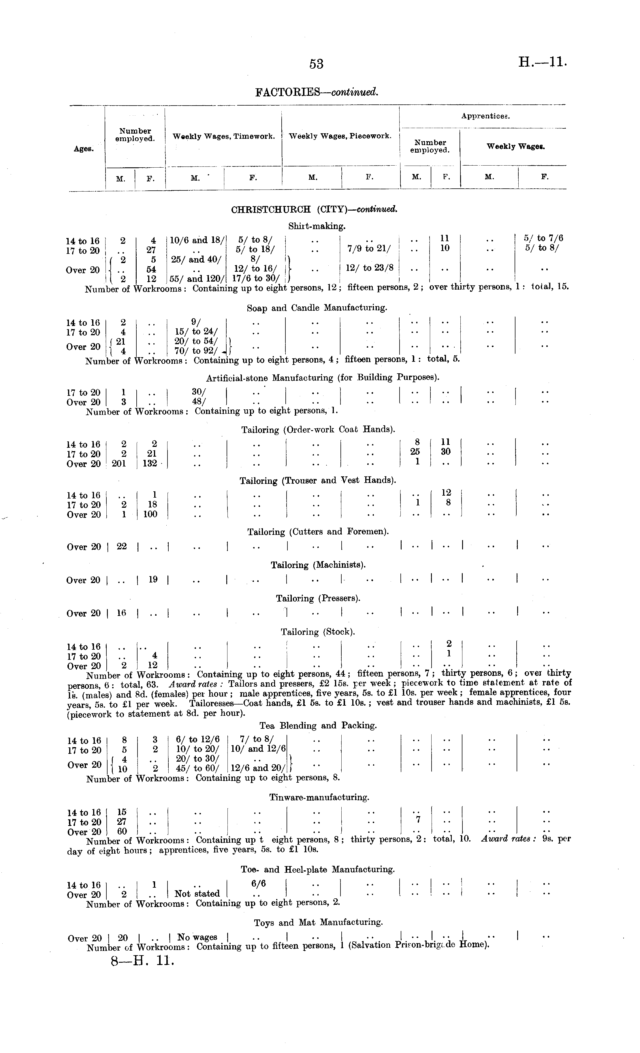 Ages. Apprentices. employed Weekly Wages, Timework. Weekly Wages, Piecework, j eSpCa. Weekly Wages. I M. If. M. ' F. M. F. M. F. M. F. I M. j F. M. ' F. M. M. V. CHRISTCHURGH (CITY)— continued. Shiit-making. 14 to 16 i 2 4 10/6 and 18/ 5/to 8/ .. .. | .. 11 .. 5/to 7/6 17 to 20 ! .. 27 .. 5/ to 18/ .. 7/9 to 21/ ! .. 10 .. 6/ to 8/ (2 5 25/and 40/ 8/ ) Over 20 ! .. 54 .. 12/ to 16/ i \ .. 12/ to 23/8 ... U 2 12 155/and 120/ 17/6 to 30/ ) Number of Workrooms : Containing up to eight persons, 12 ; fifteen persons, 2 ; over thirty persons, 1 : tola), 15. 4 27 5 54 12 'orkroi ii 10 >ver thi Soap and Candle Manufacturing. 14 to 16 2 9/ 17 to 20 4 .. 15/ to 24/ „ on f 21 .. 20/ to 54/ ) Over20 14 .. 70/to 92/-If •• •• Number of Workrooms : Containing up to eight persons, 4 ; fifteen persons, 1 : total, 5. Artificial-stone Manufacturing (for Building Purposes). 17 to 20 1 .. I 30/ Over 20 3 48/ .. .. .. .... Number of Workrooms : Containing up to eight persons, 1. Tailoring (Order-work Coat Hands). 14 to 16 2 2 .. .. .. ■■ 8 11 17 to 20 2 21 .. .. •. • • 25 30 Over 20 201 j 132 .. .. ...... 1 ! • • Tailoring (Trouser and Vest Hands). 14 to 16 .. II .. • ■ ■ • • • • • 12 I 17 to 20 2 18 .. .. .. • • 1 8 J Over 20 1 100 .. .. • • • • I • • • ■ ) Tailoring (Cutters and Foremen). Over 20 I 22 I .. I .. | .. | • ■ I • • ] • • I • • I ■ ■ I Tailoring (Machinists). Over 20 I .. I 19 I .. | .. I ■ • I • • I ■ • I • • I • • I Tailoring (Pressers). Over 20 I 16 I .. I .. | .. I ■ • I • • I • ■ I • ■ I ■ • I Tailoring (Stock). 14 to 16 .... .. •• •• • • • • 2 17 to 20 .. 4 .. .. .. ■ • • ■ 1 Over 20 2 ] 12 .. .. ... . ■ I • • Number of Workrooms : Containing up to eight persons, 44 ; fifteen persons, 7 ; thirty persons, 6 ; ovei thirty persons, 6 : total, 63. Award rates : Tailors and pressers, £2 15s. per week ; piecework to time statement at rate of Is. (males) and 8d. (females) per hour ; male apprentices, five years, 5s. to £1 10s. per week; female apprentices, four years, 5s. to £1 per week. Tailoresses—Coat hands, £1 5s. to'fl 10s. ; vest and trouser hands and machinists, £] 5s. (piecework to statement at 8d. per hour). Tea Blending and Packing. 14 to 16 8 3 6/ to 12/6 7/ to 8/ 17 to 20 5 2 10/ to 20/ 10/ and 12/6 r. on J 4 ■• 20/to 30/ .. I Over i0 J 10 2 J i5/ to 60/ 12 / 6 and 20/ ) Number of Workrooms: Containing up to eight persons, 8. Tinware-manufacturing. 14 to 16 15 17 to 20 27 .. ■ • ■ • ■ • 7 .. Over 20 60 .. ■ • • ■ .. I Number of Workrooms : Containing up t eight persons, 8 ; thirty persons, 2 : total, 10. Award rates : 9s. per day of eight hours ; apprentices, five years, 5a. to £1 10s. Toe- and Heel-plate Manufacturing. 14 to 16 .. I 1 .. 6/6 Over 20 2 j .. Not stated .. • • • • '. ■ ■ I Number of Workrooms: Containing up to eight persons, 2. Toys and Mat Manufacturing. Over 20 | 20 | .. | No wages | .. | .. I , • I • • I. • • I •• I Number of Workrooms: Containing up to fifteen persons, 1 (Salvation Pneon-tmgt.de Home). 8—H. 11.