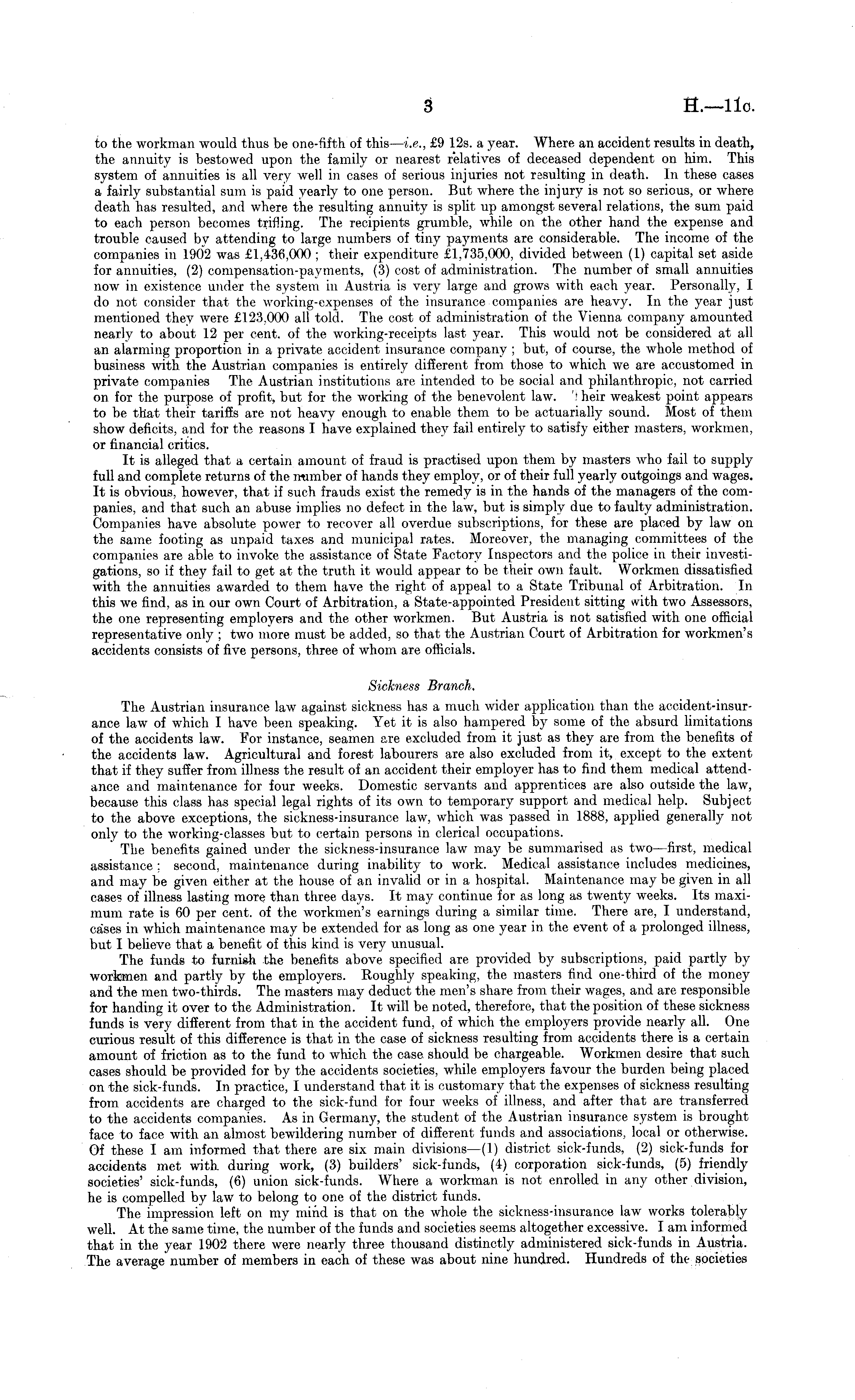 to the workman would thus be one-fifth of this — i.e., £9 12s. a year. Where an accident results in death, the annuity is bestowed upon the family or nearest relatives of deceased dependent on him. This system of annuities is all very well in cases of serious injuries not rssulting in death. In these cases a fairly substantial sum is paid yearly to one person. But where the injury is not so serious, or where death has resulted, and where the resulting annuity is split up amongst several relations, the sum paid to each person becomes trifling. The recipients grumble, while on the other hand the expense and trouble caused by attending to large numbers of tiny payments are considerable. The income of the companies in 1902 was £1,436,000 ; their expenditure £1.735,000, divided between (1) capital set aside for annuities, (2) compensation-payments, (3) cost of administration. The number of small annuities now in existence under the system in Austria is very large and grows with each year. Personally, I do not consider that the working-expenses of the insurance companies are heavy. In the year just mentioned they were £123,000 all told. The cost of administration of the Vienna company amounted nearly to about 12 per cent, of the working-receipts last year. This would not be considered at all an alarming proportion in a private accident insurance company ; but, of course, the whole method of business with the Austrian companies is entirely different from those to which we are accustomed in private companies The Austrian institutions are intended to be social and philanthropic, not carried on for the purpose of profit, but for the working of the benevolent law. 'J heir weakest point appears to be that their tariffs are not heavy enough to enable them to be actuarially sound. Most of them show deficits, and for the reasons I have explained they fail entirely to satisfy either masters, workmen, or financial critics. It is alleged that a certain amount of fraud is practised upon them by masters who fail to supply full and complete returns of the number of hands they employ, or of their full yearly outgoings and wages. It is obvious, however, that if such frauds exist the remedy is in the hands of the managers of the companies, and that such an abuse implies no defect in the law, but is simply due to faulty administration. Companies have absolute power to recover all overdue subscriptions, for these are placed by law on the same footing as unpaid taxes and municipal rates. Moreover, the managing committees of the companies are able to invoke the assistance of State Factory Inspectors and the police in their investigations, so if they fail to get at the truth it would appear to be their own fault. Workmen dissatisfied with the annuities awarded to them have the right of appeal to a State Tribunal of Arbitration. In this we find, as in our own Court of Arbitration, a State-appointed President sitting with two Assessors, the one representing employers and the other workmen. But Austria is not satisfied with one official representative only ; two more must be added, so that the Austrian Court of Arbitration for workmen's accidents consists of five persons, three of whom are officials. Sickness Branch. The Austrian insurance law against sickness has a much wider application than the accident-insur-ance law of which I have been speaking. Yet it is also hampered by some of the absurd limitations of the accidents law. For instance, seamen are excluded from it just as they are from the benefits of the accidents law. Agricultural and forest labourers are also excluded from it, except to the extent that if they suffer from illness the result of an accident their employer has to find them medical attendance and maintenance for four weeks. Domestic servants and apprentices are also outside the law, because this class has special legal rights of its own to temporary support and medical help. Subject to the above exceptions, the sickness-insurance law, which was passed in 1888, applied generally not only to the working-classes but to certain persons in clerical occupations. The benefits gained under the sickness-insurance law may be summarised as two —first, medical assistance ; second, maintenance during inability to work. Medical assistance includes medicines, and may be given either at the house of an invalid or in a hospital. Maintenance may be given in all cases of illness lasting more than three days. It may continue for as long as twenty weeks. Its maximum rate is 60 per cent, of the workmen's earnings during a similar time. There are, I understand, cases in which maintenance may be extended for as long as one year in the event of a prolonged illness, but I believe that a benefit of this kind is very unusual. The funds to furnish the benefits above specified are provided by subscriptions, paid partly by workmen and partly by the employers. Roughly speaking, the masters find one-third of the money and the men two-thirds. The masters may deduct the men's share from their wages, and are responsible for handing it over to the Administration. It will be noted, therefore, that the position of these sickness funds is very different from that in the accident fund, of which the employers provide nearly all. One curious result of this difference is that in the case of sickness resulting from accidents there is a certain amount of friction as to the fund to which the case should be chargeable. Workmen desire that such cases should be provided for by the accidents societies, while employers favour the burden being placed on the sick-funds. In practice, I understand that it is customary that the expenses of sickness resulting from accidents are charged to the sick-fund for four weeks of illness, and after that are transferred to the accidents companies. As in Germany, the student of the Austrian insurance system is brought face to face with an almost bewildering number of different funds and associations, local 