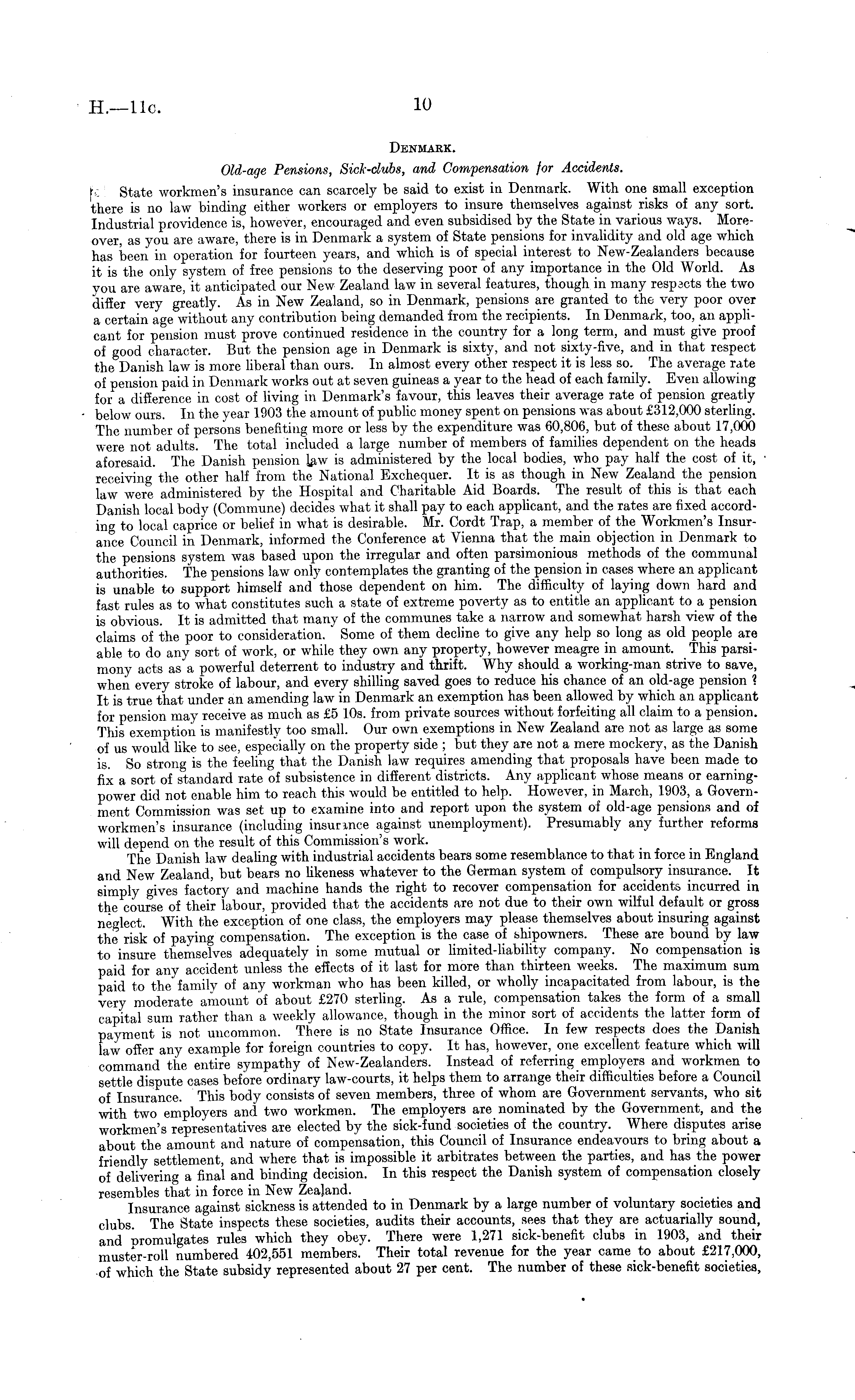 Denmark. Old-age Pensions, Sick-clubs, and Compensation for Accidents. f State workmen's insurance can scarcely be said to exist in Denmark. With one small exception there is no law binding either workers or employers to insure themselves against risks of any sort. Industrial providence is, however, encouraged and even subsidised by the State in various ways. Moreover, as you are aware, there is in Denmark a system of State pensions for invalidity and old age which has been in operation for fourteen years, and which is of special interest to New-Zealanders because it is the only system of free pensions to the deserving poor of any importance in the Old World. As you are aware, it anticipated our New Zealand law in several features, though in many respects the two differ very greatly. As in New Zealand, so in Denmark, pensions are granted to the very poor over a certain age without any contribution being demanded from the recipients. In Denmark, too, an applicant for pension must prove continued residence in the country for a long term, and must give proof of good character. But the pension age in Denmark is sixty, and not sixty-five, and in that respect the Danish law is more liberal than ours. In almost every other respect it is less so. The average rate of pension paid in Denmark works out at seven guineas a year to the head of each family. Even allowing for a difference in cost of living in Denmark's favour, this leaves their average rate of pension greatly below ours. In the year 1903 the amount of public money spent on pensions was about £312,000 sterling. The number of persons benefiting more or less by the expenditure was 60,806, but of these about 17,000 were not adults. The total included a large number of members of families dependent on the heads aforesaid. The Danish pension law is administered by the local bodies, who pay half the cost of it, receiving the other half from the National Exchequer. It is as though in New Zealand the pension law were administered by the Hospital and Charitable Aid Boards. The result of this is that each Danish local body (Commune) decides what it shall pay to each applicant, and the rates are fixed according to local caprice or belief in what is desirable. Mr. Cordt Trap, a member of the Workmen's Insurance Council in Denmark, informed the Conference at Vienna that the main objection in Denmark to the pensions system was based upon the irregular and often parsimonious methods of the communal authorities. The pensions law only contemplates the granting of the pension in cases where an applicant is unable to support himself and those dependent on him. The difficulty of laying down hard and fast rules as to what constitutes such a state of extreme poverty as to entitle an applicant to a pension is obvious. It is admitted that many of the communes take a narrow and somewhat harsh view of the claims of the poor to consideration. Some of them decline to give any help so long as old people are able to do any sort of work, or while they own any property, however meagre in amount. This parsimony acts as a powerful deterrent to industry and thrift. Why should a working-man strive to save, when every stroke of labour, and every shilling saved goes to reduce his chance of an old-age pension ? It is true that under an amending law in Denmark an exemption has been allowed by which an applicant for pension may receive as much as £5 10s. from private sources without forfeiting all claim to a pension. This exemption is manifestly too small. Our own exemptions in New Zealand are not as large as some of us would like to see, especially on the property side ; but they are not a mere mockery, as the Danish is. So strong is the feeling that the Danish law requires amending that proposals have been made to fix a sort of standard rate of subsistence in different districts. Any applicant whose means or earningpower did not enable him to reach this would be entitled to help. However, in March, 1903, a Government Commission was set up to examine into and report upon the system of old-age pensions and of workmen's insurance (including insurance against unemployment). Presumably any further reforms will depend on the result of this Commission's work. The Danish law dealing with industrial accidents bears some resemblance to that in force in England and New Zealand, but bears no likeness whatever to the German system of compulsory insurance. It simply gives factory and machine hands the right to recover compensation for accidents incurred in the course of their labour, provided that the accidents are not due to their own wilful default or gross neglect. With the exception of one class, the employers may please themselves about insuring against the risk of paying compensation. The exception is the case of shipowners. These are bound by law to insure themselves adequately in some mutual or limited-liability company. No compensation is paid for any accident unless the effects of it last for more than thirteen weeks. The maximum sum paid to the family of any workman who has been killed, or wholly incapacitated from labour, is the very moderate amount of about £270 sterling. As a rule, compensation takes the form of a small capital sum rather than a weekly allowance, though in the minor sort of accidents the latter form of payment is not uncommon. There is no State Insurance Office. In few respects does the Danish law offer any example for foreign countries to copy. It has, however, one excellent feature which will command the entire sympathy of New-Zealanders. Instead of referring employers and workmen to settle dispute cases before ordinary law-courts, it helps them to arrange their difficulties before a Council of Insurance. This body consists of seven members, three of whom are Government servants, who sit with two employers and two workmen. The employers are nominated by the Government, and the workmen's representatives are elected by the sick-fund societies of the countr