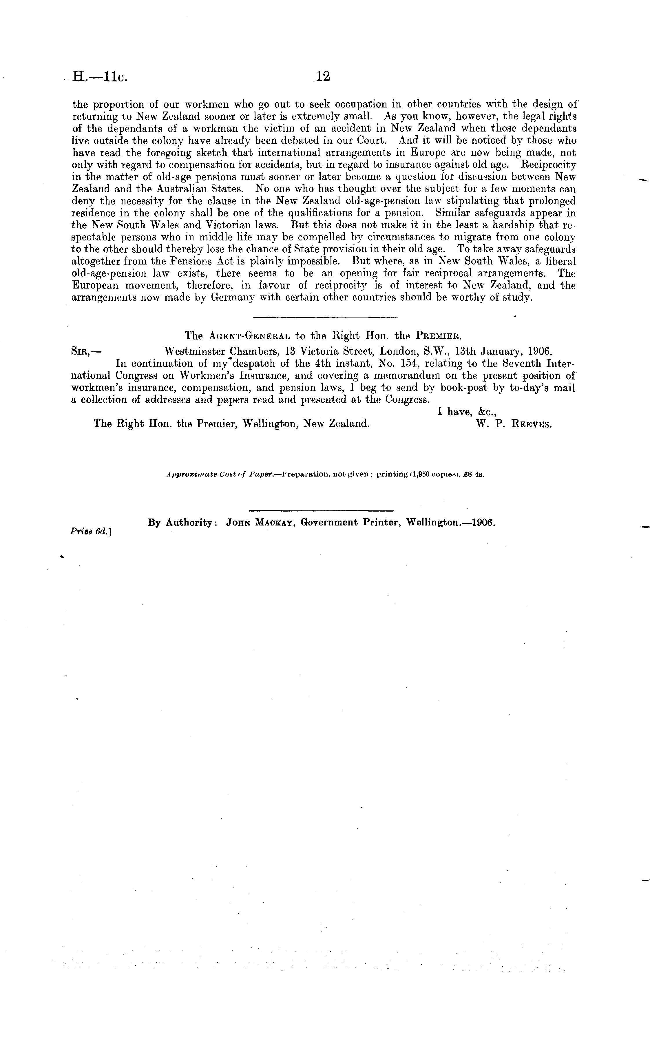 the proportion of our workmen who go out to seek occupation in other countries with the design of returning to New Zealand sooner or later is extremely small. As you know, however, the legal rights of the dependants of a workman the victim of an accident in New Zealand when those dependants live outside the colony have already been debated in our Court. And it will be noticed by those who have read the foregoing sketch that international arrangements in Europe are now being made, not only with regard to compensation for accidents, but in regard to insurance against old age. Reciprocity in the matter of old-age pensions must sooner or later become a question for discussion between New Zealand and the Australian States. No one who has thought over the subject for a few moments can deny the necessity for the clause in the New Zealand old-age-pension law stipulating that prolonged residence in the colony shall be one of the qualifications for a pension. Similar safeguards appear in the New South Wales and Victorian laws. But this does not make it in the least a hardship that respectable persons who in middle life may be compelled by circumstances to migrate from one colony to the other should thereby lose the chance of State provision in their old age. To take away safeguards altogether from the Pensions Act is plainly impossible. But where, as in New South Wales, a liberal old-age-pension law exists, there seems to be an opening for fair reciprocal arrangements. The European movement, therefore, in favour of reciprocity is of interest to New Zealand, and the arrangements now made by Germany with certain other countries should be worthy of study. The Agent-General to the Right Hon. the Premier. Sir, — Westminster Chambers, 13 Victoria Street, London, S.W., 13th January, 1906. In continuation of my~despatch of the 4th instant, No. 154, relating to the Seventh International Congress on Workmen's Insurance, and covering a memorandum on the present position of workmen's insurance, compensation, and pension laws, I beg to send by book-post by to-day's mail a collection of addresses and papers read and presented at the Congress. I have, &c, The Right Hon. the Premier, Wellington, New Zealand. W. P. Reeves. Approximate Cost of Paper. —Preparation, not given ; printing (1,950 eopiem, £8 4s.