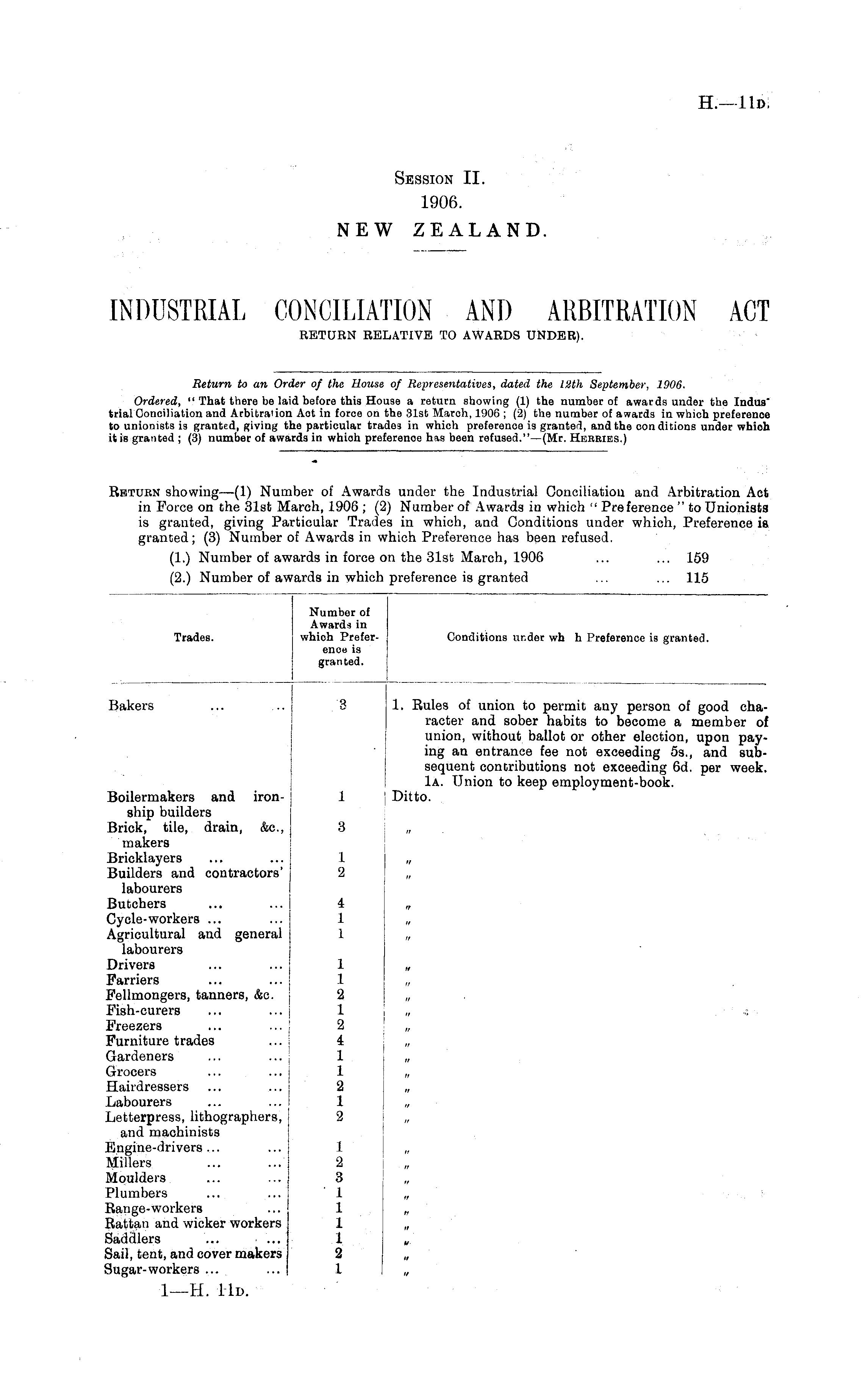 Return to an Order of the House of Representatives, dated the lUth September, 1906. Ordered, " That there be laid before this House a return showing (1) the number of awards under the Indus' trial Conciliation and Arbitration Aot in force on the 31st March, 1906 ; (2) the number of awards in which preference to unionists is granted, giving the particular trades in which preference is granted, and the conditions under whioh it is granted ; (3) number of awards in whioh preference has been refused."—(Mr. Hebeibs.)