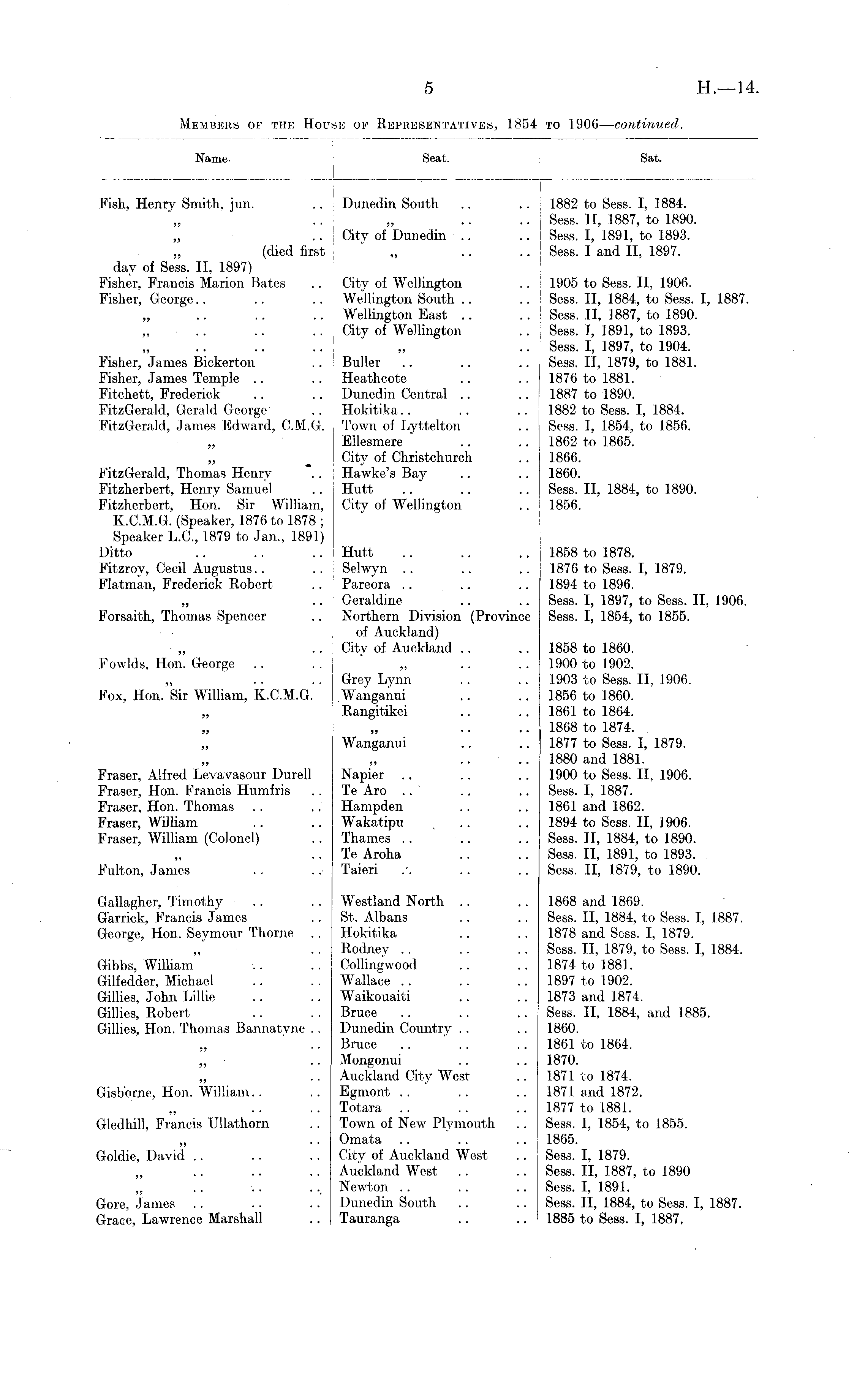Name. Seat. Sat. Fish, Henry Smith, jun. Dunedin South 1882 to Sess. I, 1884. Sess. II, 1887, to 1890. Sess. I, 1891, to 1893. Sess. I and II, 1897. tt - • City of Dunedin .. 5> - * „ (died first ,, . . . . day of Sess. II, 1897) Fisher, Francis Marion Bates Fisher, George.. City of Wellington Wellington South Wellington East City of Wellington 1905 to Sess. II, 1906. Sess. II, 1884, to Sess. I, 1887. Sess. II, 1887, to 1890. Sess. I, 1891, to 1893. Sess. I, 1897, to 1904. Sess. II, 1879, to 1881. 1876 to 1881. 1887 to 1890. 1882 to Sess. I, 1884. Sess. I, 1854, to 1856. 1862 to 1865. 1866. 1860. Sess. II, 1884, to 1890. 1856. ,, ,, . . . . ,, . . . . . . Fisher, James Bickerton Fisher, James Temple Fitchett, Frederick FitzGerald, Gerald George FitzGerald, James Edward, C.M.G ,, • • Buller .. Heathcote Dunedin Central Hokitika Town of Lyttelton Ellesmere City of Christchurch Hawke's Bay Hutt City of Wellington a FitzGerald, Thomas Henry Fitzherbert, Henry Samuel Fitzherbert, Hon. Sir William, K.C.M.G. (Speaker, 1876 to 1878 ; Speaker L.C., 1879 to Jan., 1891) Ditto Fitzroy, Cecil Augustus Flatman, Frederick Robert Hutt Selwyn Pareora Geraldine Northern Division (Province of Auckland) City of Auckland .. 1858 to 1878. 1876 to Sess. I, 1879. 1894 to 1896. Sess. I, 1897, to Sess. II, 1906. Sess. I, 1854, to 1855. Forsaith, Thomas Spencer a Fowlds, Hon. George Fox, Hon.'sir William, K.C.M.G. a n n Eraser, Alfred Levavasour Durell Fraser, Hon. Francis Humfris Fraser, Hon. Thomas Fraser, William Fraser, William (Colonel) ,, Grey Lynn Wanganui Rangitikei Wanganui 1858 to 1860. 1900 to 1902. 1903 to Sess. II, 1906. 1856 to 1860. 1861 to 1864. 1868 to 1874. 1877 to Sess. I, 1879. 1880 and 1881. 1900 to Sess. II, 1906. Sess. I, 1887. 1861 and 1862. 1894 to Sess. II, 1906. Sess. II, 1884, to 1890. Sess. II, 1891, to 1893. Sess. II, 1879, to 1890. ,, . . . . Napier Te Aro .. Hampden Wakatipu Thames Te Aroha Taieri Fulton, James Gallagher, Timothy Garrick, Francis James George, Hon. Seymour Thorne Gibbs, William Gilfodder, Michael Gillies, John Lillie Gillies, Robert Gillies, Hon. Thomas Bannatyne .. ,, - ■ West! and North St. Albans Hokitika Rodney Collingwood Wallace Waikouaiti Bruce Dunedin Country Bruce Mongonui Auckland City West Egmont Totara Town of New Plymouth Omata City of Auckland West Auckland West Newton Dunedin South Tauranga 1868 and 1869. Sess. II, 1884, to Sess. I, 1887. 1878 and Sess. I, 1879. Sess. II, 1879, to Sess. I, 1884. 1874 to 1881. 1897 to 1902. 1873 and 1874. Sess. II. 1884, and 1885. 1860. 1861 to 1864. 1870. 1871 to 1874. 1871 and 1872. 1877 to 1881. Sess. I, 1854, to 1855. 1865. Sess. I, 1879. Sess. II, 1887, to 1890 Sess. I, 1891. Sess. II, 1884, to Sess. I, 1887. 1885 to Sess. I, 1887. n - - Gisborne, Hon. William.. Gledhill, Francis U'lathorn Goldie, David .. ,, . . . • . • ,, • ■ • *. Gore, James Grace, Lawrence Marshall