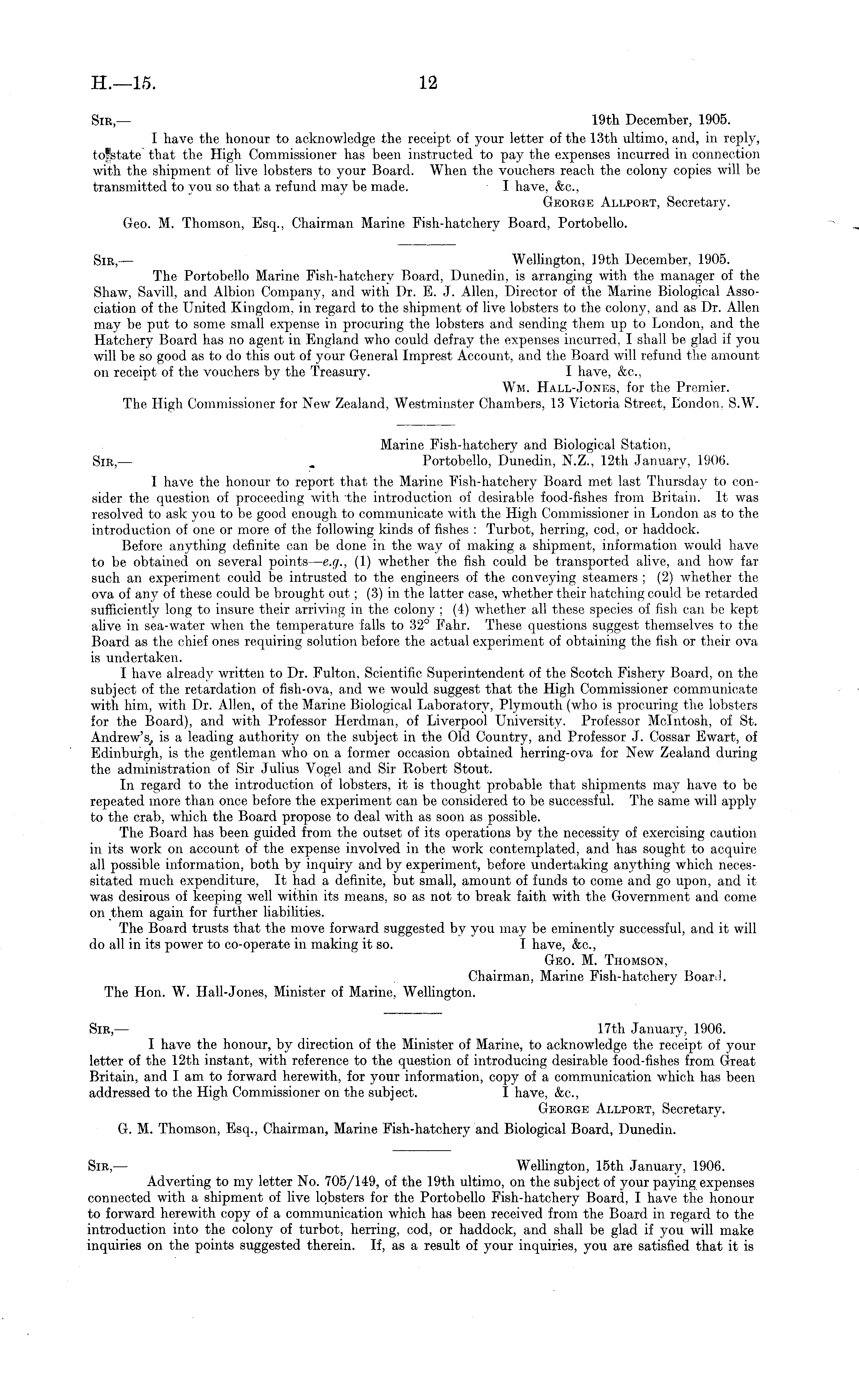Sir,— 19th December, 1905. I have the honour to acknowledge the receipt of your letter of the 13th ultimo, and, in reply, tofstate that the High Commissioner has been instructed to pay the expenses incurred in connection with the shipment of live lobsters to your Board. When the vouchers reach the colony copies will be transmitted to you so that a refund may be made. I have, &c, George Allport, Secretary. Geo. M. Thomson, Esq., Chairman Marine Fish-hatchery Board, Portobello. Sir,— Wellington, 19th December, 1905. The Portobello Marine Fish-hatchery Board, Dunedin, is arranging with the manager of the Shaw, Savill, and Albion Company, and with Dr. E. J. Allen, Director of the Marine Biological Association of the United Kingdom, in regard to the shipment of live lobsters to the colony, and as Dr. Allen may be put to some small expense in procuring the lobsters and sending them up to London, and the Hatchery Board has no agent in England who could defray the expenses incurred, I shall be glad if you will be so good as to do this out of your General Imprest Account, and the Board will refund the amount on receipt of the vouchers by the Treasury. I have, &c, Wm. Hall-Jones, for the Premier. The High Commissioner for New Zealand, Westminster Chambers, 13 Victoria Street, London, S.W.