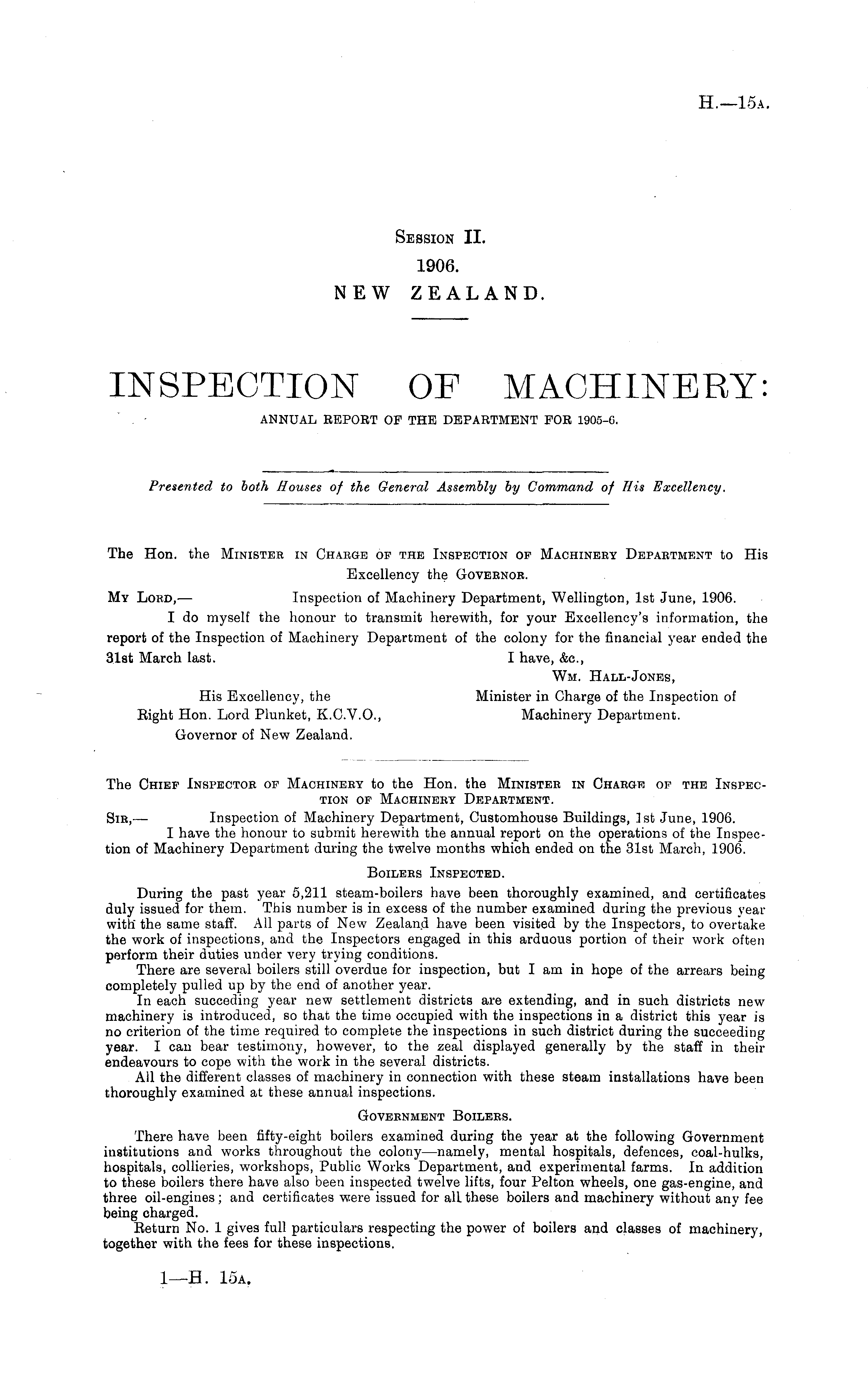 The Hon. the Minister in Charge of the Inspection of Machinery Department to His Excellency the Governor. My Lord, — Inspection of Machinery Department, Wellington, Ist June, 1906. I do myself the honour to transmit herewith, for your Excellency's information, the report of the Inspection of Machinery Department of the colony for the financial year ended the 31st March last. I have, &c, Wm. Hall-Jones, His Excellency, the Minister in Charge of the Inspection of Eight Hon. Lord Plunket, K.C.V.0., Machinery Department. Governor of New Zealand.