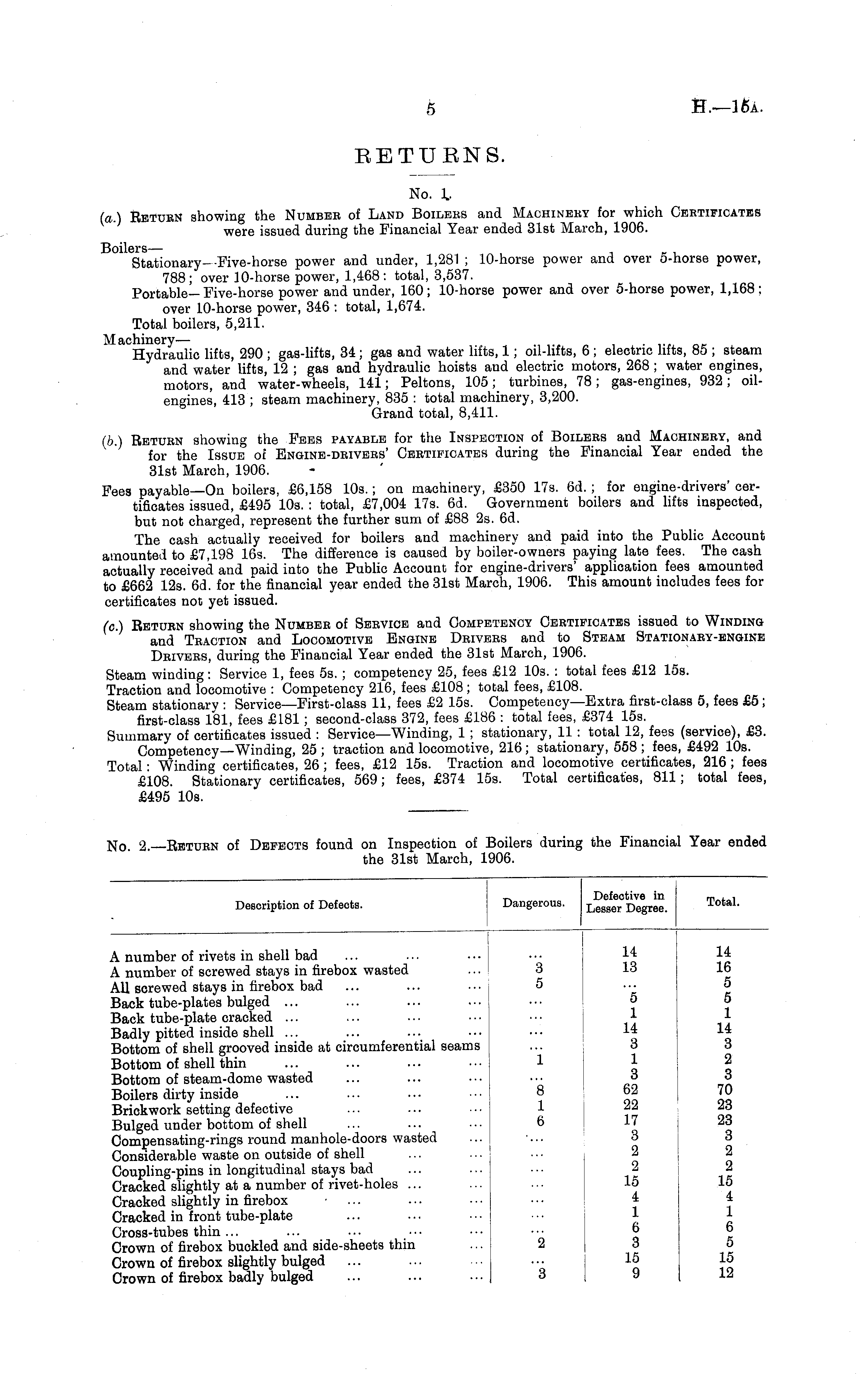 No. \, (a.) Retuen showing the Number of Land Boilers and Machinery for which Certificates were issued during the Financial Year ended 31st March, 1906. Boilers-Stationary-Five-horse power and under, 1,281 ; 10-horse power and over o-horse power, 788; over ]0-horse power, 1,468: total, 3,537. Portable—Five-horse power and under, 160; 10-horse power and over 5-horse power, 1,168: over 10-horse power, 346 : total, 1,674. Total boilers, 5,211. Machinery— Hydraulic lifts, 290 ; gas-lifts, 34 ; gas and water lifts, 1; oil-lifts, 6 ; electric lifts, 85 ; steam and water lifts, 12 ; gas and hydraulic hoists and electric motors, 268 ; water engines, motors, and water-wheels, 141; Peltons, 105; turbines, 78; gas-engines, 932; oilengines, 413 ; steam machinery, 835 : total machinery, 3,200. Grand total, 8,411. (b.) Retuen showing the Fees payable for the Inspection of Boilers and Machinery, and for the Issue of Engine-drivers' Certificates during the Financial Year ended the 31st March, 1906. Fees payable—On boilers, £6,158 10s.; on machinery, £350 17s. 6d. ; for engine-drivers' certificates issued, £495 10s. : total, £7,004 17s. 6d. Government boilers and lifts inspected, but not charged, represent the further sum of £88 2s. 6d. The cash actually received for boilers and machinery and paid into the Public Account amounted to £7,198 16s. The difference is caused by boiler-owners paying late fees. The cash actually received and paid into the Public Account for engine-drivers' application fees amounted to £662 12s. 6d. for the financial year ended the 31st March, 1906. This amount includes fees for certificates not yet issued. (c.) Return showing the Number of Service and Competency Certificates issued to Winding and Traction and Locomotive Engine Drivers and to Steam Stationary-engine Drivers, during the Financial Year ended the 31st March, 1906. Steam winding : Service 1, fees 55.; competency 25, fees £12 10s. : total fees £12 15s. Traction and locomotive : Competency 216, fees £108 ; total fees, £108. Steam stationary : Service—First-class 11, fees £2 15s. Competency—Extra first-class 5, fees £5; first-class 181, fees £181; second-class 372, fees £186 : total fees, £374 15s. Summary of certificates issued : Service—Winding, 1 ; stationary, 11 : total 12, fees (service), £3. Competency—Winding, 25 ; traction and locomotive, 216; stationary, 558 ; fees, £492 10s. Total: Winding certificates, 26; fees, £12 15s. Traction and locomotive certificates, 216 ; fees £108. Stationary certificates, 569; fees, £374 15s. Total certificates, 811; total fees, £495 10s.